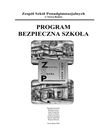 Zespół Szkół Ponadgimnazjalnych w Nowej Rudzie PROGRAM BEZPIECZNA SZKOŁA Bogdan Kostecki Brygida Gąsior Anna Rzepecka Marta Leśniak Jolanta Swergoń Daniel Jabłoński Renata Mrozek Nowa Ruda 2007 I. OGÓLNE ZAŁOśENIA PROGRAMU Głównym celem programu jest kontynuacja i dostosowanie działań na rzecz ochrony uczniów przed wszelkimi zagroŜeniami oraz reagowanie w przypadku ich pojawienia się, w nowych warunkach funkcjonowania szkoły. Program „Bezpieczna szkoła” został dostosowany do potrzeb rozwojowych uczniów i potrzeb środowiska lokalnego. Ma słuŜyć ujednoliceniu działań wychowawczych i profilaktycznych oraz pozyskaniu rodziców do współpracy w dziedzinie profilaktyki domowej. Przy konstruowaniu szkolnego programu „Bezpieczna szkoła” uwzględnione zostały: załoŜenia zawarte w aktualnym programie wychowawczym i profilaktycznym szkoły, wyniki diagnozy badającej sytuację wychowawczą szkoły oraz obserwacje zachowań uczniów. Program skierowany jest do uczniów, nauczycieli i innych pracowników szkoły przy współpracy z instytucjami pozaszkolnymi: • Poradnia Psychologiczno – Pedagogiczna • Centrum Pomocy rodzinie • Policja • StraŜ Miejska • Firma ochroniarska • Sanepid • Kuratorzy • Poradnie Specjalistyczne • Urząd Miasta Do podstawowych załoŜeń programu „Bezpieczna szkoła” naleŜą: poprawa stanu bezpieczeństwa i wypadkowości w szkole; profilaktyka zachowań agresywnych; edukacja społeczno – prawna uczniów, rodziców i nauczycieli; animacja ruchu społecznego na rzecz bezpieczeństwa. Zadania zawarte w niniejszym programie oparte zostały na rozwijaniu umiejętności Ŝyciowych umoŜliwiających dobre samopoczucie, właściwe relacje z innymi i zachowania sprzyjające zdrowiu i bezpieczeństwu. II. OPIS PODMIOTÓW SZKOŁY I ŚRODOWISKA LOKALNEGO Zespół Szkół Ponadgimnazjalnych jest instytucją publiczną powstałą w wyniku połączenia w 2005 roku trzech szkół średnich. Jedna z połączonych szkół – Noworudzka Szkoła Techniczna, posiadała Certyfikat Bezpiecznej Szkoły nadany w 2004 roku. Jako nowy zespół realizujemy załoŜenia programu z 2004 roku. Jednak dzisiaj stajemy przed zupełnie innymi problemami, wynikającymi ze zmiany lokalizacji oraz potrzeby zintegrowania uczniów i nauczycieli trzech placówek. W ZSP uczy się 1095 uczniów, w tym 8 uczniów niepełnosprawnych i około 100 wymagających pomocy psychologiczno-pedagogicznej. Obejmuje on 41 oddziałów. Średnia liczba uczniów przypadających na jeden oddział wynosi 27 osób. Kadra pedagogiczna liczy 113 pracowników pedagogicznych oraz 45 pracowników administracyjno - obsługowych. Szkoła zajmuje 9 budynków oraz salę sportową i internat. Budynki rozmieszczone są w pewnej odległości od siebie i zachodzi potrzeba przemieszczania się uczniów. Do jednego z budynków uczniowie muszą przejść przez bardzo ruchliwą ulicę. Szkoła posiada pracownie komputerowe, pracownie językowe, jest przystosowana dla młodzieŜy niepełnosprawnej. Pracujący w szkole nauczyciele posiadają wykształcenie wyŜsze pedagogiczne i stale poszerzają swoje kwalifikacje uczestnicząc w róŜnych formach doskonalenia zawodowego. Uczniom zapewnia się opiekę psychologiczno-pedagogiczną. Mają teŜ moŜliwość uczestnictwa w zajęciach pozalekcyjnych, które obejmują: zajęcia taneczne, informatyczne, matematyczne, sportowe, koła języków obcych oraz zajęcia z zakresu przedsiębiorczości. Szkoła oferuje równieŜ korzystanie z klubu „Eksplozja”, który powstał z inicjatywy uczniowskiej. Na terenie Zespołu Szkół Ponadgimnazjalnych funkcjonuje świetlica szkolna i biblioteki multimedialne, w których młodzieŜ moŜe ciekawie, bezpiecznie spędzać czas oraz realizować i pogłębiać swoje umiejętności edukacyjne. Uczniowie, którzy mają utrudniony codzienny dojazd do szkoły, mogą korzystać z pobytu w internacie. Nad bezpieczeństwem uczniów czuwają wszyscy pracownicy szkoły, m.in.: nauczyciele, inspektor BHP, pielęgniarka szkolna, pedagodzy, Rzecznik Praw Uczniów, a przede wszystkim Dyrekcja. Obiekty są monitorowane, a zapisy na bieŜąco analizowane. W szkole został powołany koordynator ds. bezpieczeństwa, przeszkolony przez CMPPP: „Budowanie systemu szybkiego reagowania w środowisku lokalnym w sytuacjach zagroŜenia niedostosowaniem i wykluczeniem społecznym dzieci i młodzieŜy”, w ramach programu „Zero tolerancji dla przemocy w szkole”. Dodatkowo szkoła zakupiła niezbędne materiały w postaci miesięcznika dyrektora szkoły: „Bezpieczeństwo w szkole” do celów profilaktycznych i doradczych. Z prowadzonej w szkole diagnozy wynika, Ŝe w okresie kiedy szkoła posiadała w/w Certyfikat, stworzony został odpowiedni klimat, a podejmowane działania wpłynęły na właściwą współpracę środowiska zmierzającą do ujednoliconych działań ukierunkowanych na bezpieczeństwo. Natomiast sam fakt posiadania Certyfikatu zobowiązuje do poŜądanych zachowań całej społeczności szkolnej. Zgodnie z przyjętym programem wychowawczym i profilaktycznym szkoły realizowane były i są następujące zadania z zakresu bezpieczeństwa: Kadra pedagogiczna została przeszkolona w zakresie ; procedur postępowania w sytuacji zagroŜenia, profilaktyki AIDS i środków psychoaktywnych; Uczniowie i rodzice brali udział w zajęciach edukacyjnych dot. podstawowych zagroŜeń związanych z uzaleŜnieniami; W klasach pierwszych zostały przeprowadzone zajęcia integracyjne, z elementami radzenia sobie ze stresem i zachowaniami agresywnymi oraz kształcącymi postawę asertywną; Powołana została MłodzieŜowa Grupa Wolontariatu Co roku organizowany jest „Turniej Pomocy Przedmedycznej”, celem wyrobienia w uczniach prawidłowych zachowań w sytuacjach nietypowych (świadek wypadku samochodowego, atak epilepsji itp.) oraz nabycia przez młodzieŜ umiejętności teoretycznych i praktycznych w udzielaniu pierwsz