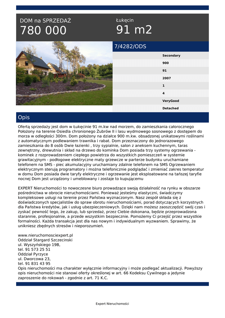 DOM na SPRZEDAŻ 780 000 Łukęcin 91 m2 7/4282/ODS Secondary 900 91 2007 1 4 VeryGood Detached Opis Ofertą sprzedaży jest dom w Łukęcinie 91 m.kw nad morzem, do zamieszkania całorocznego Położony na terenie Osiedla chronionego Żubrów II i lasu wydmowego sosnowego z dostępem do morza w odległości 300m. Dom położony na działce 900 m.kw. obsadzonej unikatowymi roślinami z automatycznym podlewaniem trawnika i rabat. Dom przeznaczony do jednorazowego zamieszkania do 8 osób Dwie łazienki , trzy sypialnie, salon z aneksem kuchennym, taras zewnętrzny, drewutnia i skład na drzewo do kominka Dom posiada trzy systemy ogrzewania kominek z rozprowadzeniem ciepłego powietrza do wszystkich pomieszczeń w systemie grawitacyjnym - podłogowe elektryczne maty grzewcze w parterze budynku uruchamiane telefonem na SMS - piec akumulacyjny uruchamiany zdalnie telefonem na SMS Ogrzewaniem elektrycznym sterują programatory i można telefonicznie podglądać i zmieniać zakres temperatur w domu Dom posiada dwie taryfy elektryczne i ogrzewanie jest eksploatowane na tańszej taryfie nocnej Dom jest urządzony i umeblowany i zostaje to kupującemu EXPERT Nieruchomości to nowoczesne biuro prowadzące swoją działalność na rynku w obszarze pośrednictwa w obrocie nieruchomościami. Ponieważ jesteśmy elastyczni, świadczymy kompleksowe usługi na terenie przez Państwa wyznaczonym. Nasz zespół składa się z doświadczonych specjalistów do spraw obrotu nieruchomościami, porad dotyczących korzystnych dla Państwa kredytów, jak i usług ubezpieczeniowych. Dzięki nam możesz zaoszczędzić swój czas i zyskać pewność tego, że zakup, lub sprzedaż, przez Ciebie dokonana, będzie przeprowadzona starannie, profesjonalnie, a przede wszystkim bezpiecznie. Pomożemy Ci przejść przez wszystkie formalności. Każda transakcja jest dla nas nowym i indywidualnym wyzwaniem. Sprawimy, że unikniesz zbędnych stresów i nieporozumień. www.nieruchomosciexpert.pl Oddział Stargard Szczecinski ul. Wyszyńskiego 19B, tel. 91 573 25 51 Oddział Pyrzyce ul. Dworcowa 23, tel. 91 831 43 95 Opis nieruchomości ma charakter wyłącznie informacyjny i może podlegać aktualizacji. Powyższy opis nieruchomości nie stanowi oferty określonej w art. 66 Kodeksu Cywilnego a jedynie zaproszenie do rokowań - zgodnie z art. 71 K.C. Expert Nieruchomości Patrycja Kiłeczko tel. 793492111 email: [email protected] Expert Nieruchomości Powered by TCPDF (www.tcpdf.org)