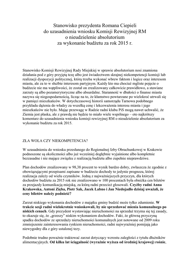 Stanowisko prezydenta Romana Ciepieli do uzasadnienia wniosku Komisji Rewizyjnej RM o nieudzielenie absolutorium za wykonanie budżetu za rok 2015 r. Stanowisko Komisji Rewizyjnej Rady Miejskiej w sprawie absolutorium nosi znamiona działania pod z góry przyjętą tezę albo jest świadectwem skrajnej niekompetencji komisji lub realizacji dyspozycji politycznej, którą trzeba wykonać wbrew faktom i logice oraz interesom miasta, ale za to w służbie interesom partyjnym. Każdy kto ma chociaż mgliste pojęcie o budżecie nie ma wątpliwości, że został on zrealizowany całkowicie prawidłowo, a stawiane zarzuty są albo pozamerytoryczne albo absurdalne. Staranność w dbałości o finanse miasta nazywa się niegospodarnością, licząc na to, że kłamstwo powtarzane po wielokroć utrwali się w pamięci mieszkańców. W dotychczasowej historii samorządu Tarnowa podobnego przykładu dążenia do władzy za wszelką cenę i lekceważenia interesu miasta i jego mieszkańców nie było. Mając przewagę w Radzie radni klubu PiS mogą nawet uchwalić, że Ziemia jest płaska, ale z prawdą nie będzie to miało wiele wspólnego – oto najkrótszy komentarz do uzasadnienia wniosku komisji rewizyjnej RM o nieudzielenie absolutorium za wykonanie budżetu za rok 2015. ZŁA WOLA CZY NIEKOMPETENCJA? W uzasadnieniu do wniosku przesłanego do Regionalnej Izby Obrachunkowej w Krakowie podnoszone są okoliczności albo już wcześniej dogłębnie wyjaśnione albo kompletnie bezzasadne i nie mające związku z realizacją budżetu albo zupełnie nieprawdziwe. Plan dochodów zrealizowany w 98,38 procent to wynik bardzo dobry, zwłaszcza że zgodnie z obowiązującymi przepisami zapisane w budżecie dochody to jedynie prognoza, której realizacja zależy od wielu czynników. Jedną z najważniejszych przyczyn, dla których dochodów budżetu za 2015 rok nie zrealizowano w 100 procentach była obniżka cen biletów za przejazdy komunikacją miejską, za którą radni przecież głosowali. Czyżby radni Anna Krakowska, Antoni Zięba, Piotr Sak, Jacek Łabno i Jan Niedojadło dzisiaj uważali, że ceny biletów należy podnieść? Zarzut niskiego wykonania dochodów z majątku gminy budzić może tylko zdumienie. W trakcie sesji radni wielokrotnie wnioskowali, by nie sprzedawać mienia komunalnego po niskich cenach. Gdy prezydent wystawiając nieruchomości na sprzedaż trzyma się tej zasady, to okazuje się, że „grzeszy” niskim wykonaniem dochodów. Fakt, że główną przyczyną spadku dochodów ze sprzedaży nieruchomości komunalnych jest notowane od 2009 roku zmniejszenie zainteresowania rynkiem nieruchomości, radni najwyraźniej pomijają jako niewygodny dla z góry ustalonej tezy. Podobnie trudno poważnie traktować zarzut dotyczący wzrostu zaległości z tytułu dłużników alimentacyjnych. Od kilku lat ściągalność (wyraźnie wyższa od średniej krajowej) rośnie, wszelkie instrumenty są skrupulatnie stosowane, a na prace komorników urząd nie ma wpływu. Wyjaśnienia w tej sprawie zostały udzielone, ale najwyraźniej nie odpowiadają założonej tezie i jako takie pod uwagę nie są brane. Zupełnym absurdem trąci argument, że deficyt był faktycznie mniejszy niż zakładano po zmianach o około 13 mln zł. Czyżby radni żądali od prezydenta, by deficyt był większy? Zarzut niezrealizowania wydatków na inwestycję jest całkowicie nieprawdziwy. Mniejsza niż zakładana kwota wydana na inwestycje to efekt uzyskania niższych cen w przetargach. Czy Komisja sugeruje, by prezydent budował drożej tylko dlatego, że tyle założono w budżecie? Podobnie bałamutny jest zarzut, że nie wykorzystano limitu wydatków bieżących. Faktycznie chodzi o to, że dokonano oszczędności np. w opłatach za energię elektryczną, wydatkach na utrzymanie zimowe dróg (łagodna zima) lub też wydatki z przyczyn obiektywnych były niższe (np. absencja chorobowa dzieci spowodowała mniejsze wydatki na żywienie). Radni mają też za złe prezydentowi, że de facto nie podnosi obciążeń finansowych dla przedsiębiorców. Do tego przecież prowadzi tzw. aktualizacja opłat rocznych z tytułu wieczystego użytkowania gruntów, której radni się domagają. W praktyce może to oznaczać nawet kilkunastokrotny wzrost opłat dla przedsiębiorstw, co oznacza dodatkowe obciążenia idące czasem w setki tysięcy złotych. Czy dodatkowe finansowe obciążenia przedsiębiorców to jest pomysł wspomnianych radnych na rozwój gospodarczy miasta? Przykładem wyjątkowej nieuczciwości jest natomiast kwestia inkubatora przedsiębiorczości, który oficjalnie został oddany do użytku 15 grudnia 2015. Nie dość, że działalność spółki nie jest przedmiotem oceny realizacji budżetu, to jeszcze autor uzasadnienia donosi, że na dzień 31 grudnia czyli dwa tygodnie po oddaniu inkubator nie był zasiedlony. Dokładnie w tych samym kategoriach trzeba traktować podnoszony po raz kolejny populistyczny argument o zatrudnionych zgodnie z prawem doradcach, którzy są takimi samymi pracownikami samorządowymi jak wszyscy inni. Efekty ich pracy są znane i szczegółowo opisane, a dzisiaj jest ich zaledwie dwóch. W uzasadnieniu znajduje się również wiele informacji nieprawdziwych jak te dotyczące roszczeń względem wykonawców ulicy Krakowskiej czy zwrotu nadpłaconych kwot za budowę łącznika autostradowego. Faktycznie to po objęciu urzędu prezydenta Tarnowa jako pierwszy skierowałem do sądu sprawę o odszkodowanie zarówno w przypadku ul. Krakowskiej jak i łącznika, a w przypadku tego ostatniego uchroniłem miasto przed bardzo prawdopodobnymi poważnymi konsekwencjami finansowymi. Zarzucanie nieskuteczności w sytuacji gdy prezydent nie ma wpływ na tryb postepowania sądowego jest praktyką, która budzić musi refleksję na temat etyki postępowania radnych. Podobnie potraktować trzeba zarzut dotyczący przygotowania koncepcji zagospodarowania „Owintaru”, która została przygot
