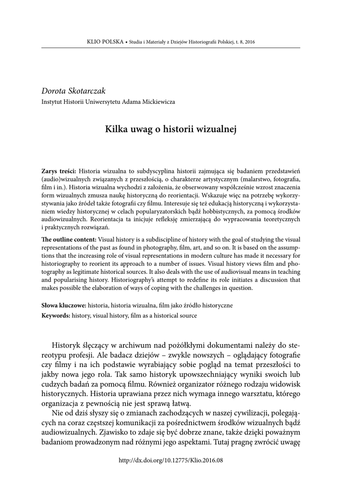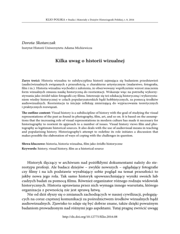 KLIO POLSKA • Studia i Materiały z Dziejów Historiografii Polskiej, t. 8, 2016 Dorota Skotarczak Instytut Historii Uniwersytetu Adama Mickiewicza Kilka uwag o historii wizualnej Zarys treści: Historia wizualna to subdyscyplina historii zajmująca się badaniem przedstawień (audio)wizualnych związanych z przeszłością, o charakterze artystycznym (malarstwo, fotografia, film i in.). Historia wizualna wychodzi z założenia, że obserwowany współcześnie wzrost znaczenia form wizualnych zmusza naukę historyczną do reorientacji. Wskazuje więc na potrzebę wykorzystywania jako źródeł także fotografii czy filmu. Interesuje się też edukacją historyczną i wykorzystaniem wiedzy historycznej w celach popularyzatorskich bądź hobbistycznych, za pomocą środków audiowizualnych. Reorientacja ta inicjuje refleksję zmierzającą do wypracowania teoretycznych i praktycznych rozwiązań. The outline content: Visual history is a subdiscipline of history with the goal of studying the visual representations of the past as found in photography, film, art, and so on. It is based on the assumptions that the increasing role of visual representations in modern culture has made it necessary for historiography to reorient its approach to a number of issues. Visual history views film and photography as legitimate historical sources. It also deals with the use of audiovisual means in teaching and popularising history. Historiography’s attempt to redefine its role initiates a discussion that makes possible the elaboration of ways of coping with the challenges in question. Słowa kluczowe: historia, historia wizualna, film jako źródło historyczne Keywords: history, visual history, film as a historical source Historyk ślęczący w archiwum nad pożółkłymi dokumentami należy do stereotypu profesji. Ale badacz dziejów – zwykle nowszych – oglądający fotografie czy filmy i na ich podstawie wyrabiający sobie pogląd na temat przeszłości to jakby nowa jego rola. Tak samo historyk upowszechniający wyniki swoich lub cudzych badań za pomocą filmu. Również organizator różnego rodzaju widowisk historycznych. Historia uprawiana przez nich wymaga innego warsztatu, którego organizacja z pewnością nie jest sprawą łatwą. Nie od dziś słyszy się o zmianach zachodzących w naszej cywilizacji, polegających na coraz częstszej komunikacji za pośrednictwem środków wizualnych bądź audiowizualnych. Zjawisko to zdaje się być dobrze znane, także dzięki poważnym badaniom prowadzonym nad różnymi jego aspektami. Tutaj pragnę zwrócić uwagę http://dx.doi.org/10.12775/Klio.2016.08 118 Dorota Skotarczak na to, że owe zmiany wymuszają pewną reorientację ze strony nauk humanistycznych. Przedstawiciele poszczególnych dyscyplin muszą rozwiązywać coraz więcej problemów, które nie ograniczają się li tylko do kartki papieru z tekstem, odręcznie zapisanym czy zadrukowanym, lecz związane są z jakimiś obrazami, nierzadko ruchomymi i powiązanymi z dźwiękiem. Wspomniana reorientacja dotyczy także nauk historycznych. Historycy w swej pracy coraz częściej z różnych przyczyn mają do czynienia z materiałami wizualnymi i audiowizualnymi, co nolens volens sprawia, że ich dyscyplina nie jest taka sama. Nie znaczy to jednak, że musi być naruszona jej istota. Potrzebna staje się zatem pogłębiona refleksja na temat pracy historyka nad źródłami wizualnymi i audiowizualnymi czy posiłkowania się przezeń obrazami. Swego czasu zaproponowałam ujęcie tej refleksji w jakąś formę uporządkowaną – historię wizualną, którą definiuję w sposób następujący: „Historia wizualna to zorientowana multi-dyscyplinarnie subdyscyplina badawcza zajmująca się analizą przedstawień (audio)wizualnych w kontekście historycznym. W tym rozumieniu historia wizualna obejmuje swym zasięgiem wszystkie te sfery, które występują na styku historii/ historiografii, fotografii, filmu, sztuk plastycznych, nowych mediów i wszelkiej wizualizacji przeszłości i wiedzy historycznej. Do jej zadań należy zaś z jednej strony – wskazanie na rolę, jaką przedstawienia (audio)wizualne odgrywają w tworzeniu przedstawień historycznych (wyobrażeń o przeszłości), stając się swoistą alternatywą dla akademickiej historiografii. A z drugiej – wskazanie na metody badawcze przydatne do analizy audiowizualnych reprezentacji przeszłości jako relatywnie nowych i równorzędnych wobec pisanej historii form refleksji o przeszłości oraz źródeł historycznych wymagających od historyka nowych umiejętności w zakresie krytyki i hermeneutyki przekazów medialnych”1. Dziedzina nazwana przeze mnie historią wizualną, jak się wydaje, czerpie w pewnym stopniu z myśli amerykańskiej. Z tamtego kierunku przyszło rozpowszechnione dziś określenie „zwrot wizualny”, nie mówiąc o dokonaniach Haydena White’a, Roberta Rosenstone’a i innych historyków. Jednak refleksja pod szyldem historii wizualnej wcześniej w naszym kraju nawiązywała do prac Europejczyków. Mam na myśli prace Lotty Eisner, Siegfrieda Kracauera – Niemców, choć niekoniecznie mieszkających w Niemczech, a także Francuzów – Marca Ferro i Edgara Morina. Europejskie inspiracje sprzed kilkudziesięciu lat pobudzały do rozważań nad filmem i ewentualnie fotografią. Późniejsze amerykańskie, koncentrujące się także na nowych nośnikami informacji, odpowiednio rozszerzyły zakres zainteresowań. 1 Definicję mojego rozumienia historii wizualnej przedstawiłam już w swoim artykule Projekt historii wizualnej, „Slavia Occidentalis” 2011, nr 68, s. 175–176. Wstępnie starałam się zdefiniować historię wizualną w artykule Historia wizualna. Założenia teoretyczne i zakres badawczy, w: Historia w kulturze współczesnej. Niekonwencjonalne podejście do przeszłości, red. P. Witek, M. Mazur, E. Solska, Lublin 2011, s. 87–94. Kilka uwag o historii wizualnej 119 Podkreślić trzeba,