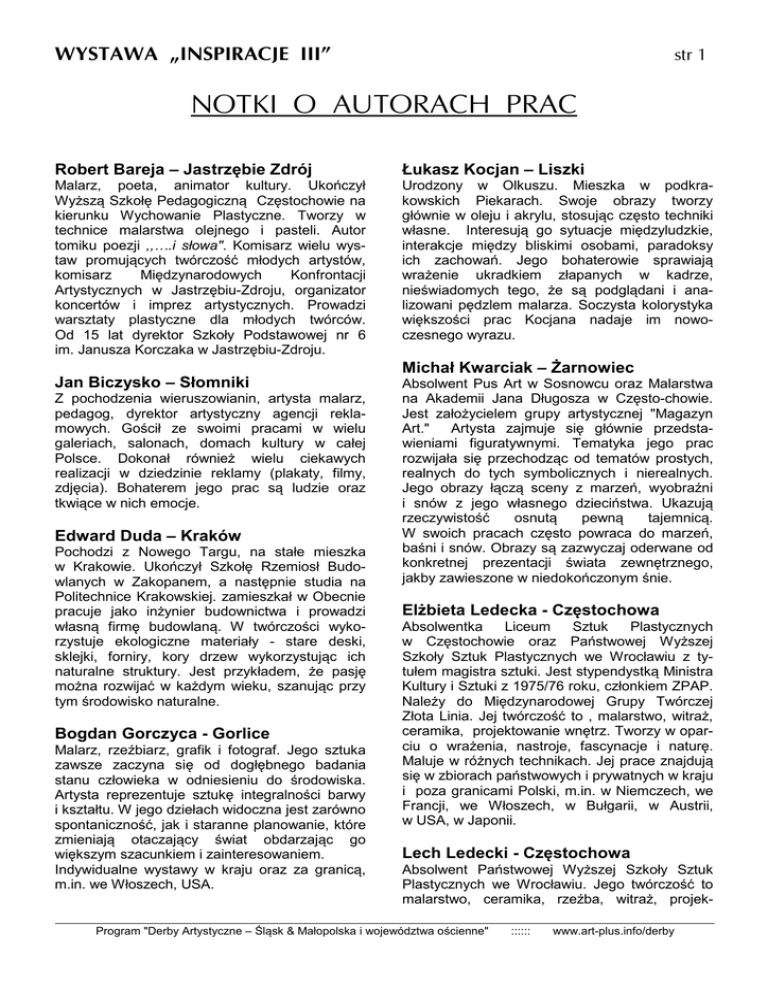 WYSTAWA „INSPIRACJE III” str 1 NOTKI O AUTORACH PRAC Robert Bareja – Jastrzębie Zdrój Łukasz Kocjan – Liszki Malarz, poeta, animator kultury. Ukończył Wyższą Szkołę Pedagogiczną Częstochowie na kierunku Wychowanie Plastyczne. Tworzy w technice malarstwa olejnego i pasteli. Autor tomiku poezji ,,….i słowa". Komisarz wielu wystaw promujących twórczość młodych artystów, komisarz Międzynarodowych Konfrontacji Artystycznych w Jastrzębiu-Zdroju, organizator koncertów i imprez artystycznych. Prowadzi warsztaty plastyczne dla młodych twórców. Od 15 lat dyrektor Szkoły Podstawowej nr 6 im. Janusza Korczaka w Jastrzębiu-Zdroju. Urodzony w Olkuszu. Mieszka w podkrakowskich Piekarach. Swoje obrazy tworzy głównie w oleju i akrylu, stosując często techniki własne. Interesują go sytuacje międzyludzkie, interakcje między bliskimi osobami, paradoksy ich zachowań. Jego bohaterowie sprawiają wrażenie ukradkiem złapanych w kadrze, nieświadomych tego, że są podglądani i analizowani pędzlem malarza. Soczysta kolorystyka większości prac Kocjana nadaje im nowoczesnego wyrazu. Michał Kwarciak – Żarnowiec Jan Biczysko – Słomniki Z pochodzenia wieruszowianin, artysta malarz, pedagog, dyrektor artystyczny agencji reklamowych. Gościł ze swoimi pracami w wielu galeriach, salonach, domach kultury w całej Polsce. Dokonał również wielu ciekawych realizacji w dziedzinie reklamy (plakaty, filmy, zdjęcia). Bohaterem jego prac są ludzie oraz tkwiące w nich emocje. Edward Duda – Kraków Pochodzi z Nowego Targu, na stałe mieszka w Krakowie. Ukończył Szkołę Rzemiosł Budowlanych w Zakopanem, a następnie studia na Politechnice Krakowskiej. zamieszkał w Obecnie pracuje jako inżynier budownictwa i prowadzi własną firmę budowlaną. W twórczości wykorzystuje ekologiczne materiały - stare deski, sklejki, forniry, kory drzew wykorzystując ich naturalne struktury. Jest przykładem, że pasję można rozwijać w każdym wieku, szanując przy tym środowisko naturalne. Bogdan Gorczyca - Gorlice Malarz, rzeźbiarz, grafik i fotograf. Jego sztuka zawsze zaczyna się od dogłębnego badania stanu człowieka w odniesieniu do środowiska. Artysta reprezentuje sztukę integralności barwy i kształtu. W jego dziełach widoczna jest zarówno spontaniczność, jak i staranne planowanie, które zmieniają otaczający świat obdarzając go większym szacunkiem i zainteresowaniem. Indywidualne wystawy w kraju oraz za granicą, m.in. we Włoszech, USA. Absolwent Pus Art w Sosnowcu oraz Malarstwa na Akademii Jana Długosza w Często-chowie. Jest założycielem grupy artystycznej "Magazyn Art." Artysta zajmuje się głównie przedstawieniami figuratywnymi. Tematyka jego prac rozwijała się przechodząc od tematów prostych, realnych do tych symbolicznych i nierealnych. Jego obrazy łączą sceny z marzeń, wyobraźni i snów z jego własnego dzieciństwa. Ukazują rzeczywistość osnutą pewną tajemnicą. W swoich pracach często powraca do marzeń, baśni i snów. Obrazy są zazwyczaj oderwane od konkretnej prezentacji świata zewnętrznego, jakby zawieszone w niedokończonym śnie. Elżbieta Ledecka - Częstochowa Absolwentka Liceum Sztuk Plastycznych w Częstochowie oraz Państwowej Wyższej Szkoły Sztuk Plastycznych we Wrocławiu z tytułem magistra sztuki. Jest stypendystką Ministra Kultury i Sztuki z 1975/76 roku, członkiem ZPAP. Należy do Międzynarodowej Grupy Twórczej Złota Linia. Jej twórczość to , malarstwo, witraż, ceramika, projektowanie wnętrz. Tworzy w oparciu o wrażenia, nastroje, fascynacje i naturę. Maluje w różnych technikach. Jej prace znajdują się w zbiorach państwowych i prywatnych w kraju i poza granicami Polski, m.in. w Niemczech, we Francji, we Włoszech, w Bułgarii, w Austrii, w USA, w Japonii. Lech Ledecki - Częstochowa Absolwent Państwowej Wyższej Szkoły Sztuk Plastycznych we Wrocławiu. Jego twórczość to malarstwo, ceramika, rzeźba, witraż, projek- Program "Derby Artystyczne – Śląsk & Małopolska i województwa ościenne" :::::: www.art-plus.info/derby WYSTAWA „INSPIRACJE III” str 2 NOTKI O AUTORACH PRAC towanie wnętrz. Jest członkiem Związku Polskich Artystów Plastyków. Do 2015 roku stworzył 700 obrazów. Został odznaczony brązowym krzyżem za zasługi dla kultury. street artu. Łączy malarstwo figuratywne z kolażem, assemblagem, malarstwo ścienne z instalacją. GOŚCINNIE Anna Lewińska - Kraków Mieszka i tworzy w Krakowie. Z wykształcenia jest architektem, konserwatorem zabytków, pedagogiem. Sporą część swego życia poświeciła pracy pedagogicznej. Ukończyła też malarstwo na krakowskiej ASP i ta profesja pochłania ją bez reszty. Stosuje różne techniki malarskie: rysunek, olej, pastel, akwarela czy technika własna .Członek ZPAP, aiap UNESCO, Krakowskiej Grupy X, Stowarzyszenia Marynistów Polskich oraz Stowarzyszenia Pastelistów Polskich. W dorobku ma 61 wystaw indywidualnych, udział w 214 wystawach zbiorowych oraz licznych plenerach. Obrazy jej są w posiadaniu kolekcjonerów na całym świecie. Bogumiła Pacyna – Ruda Śląska Urodziła się i mieszka w Rudzie Śląskiej. Swoje umiejętności doskonali w pracowni Wiesławy Kamieńskiej, członek Chorzowskiej Grupy Plastycznej Krajcok'12. Ma własną pracownię i spełnia swoje marzenia. Posługuje się różnymi technikami: olej, akryl, pastel i akwarela. Najbardziej inspiruje ją człowiek - ukryte w rysach twarzy, czy sylwetkach - piękno, szczególnie to niedoskonałe. Studiowanie ludzi pozwala jej odkrywać to, co zwykle gołym okiem niewidoczne, a niezbędne do tego, by powstał portret wyjątkowy. Uważa, że każdy na niego zasługuje. Joanna Róg-Ociepka - Kraków Absolwentka Akademii Sztuk Pięknych w Krakowie na wydziale Malarstwa. Stypendystka we francuskiej artystycznej szkole wyższej École Supérieure des Beaux-Arts de Dijon. Prowadzi działalność artystyczną FRESCOARTE, współtworzy grupę art