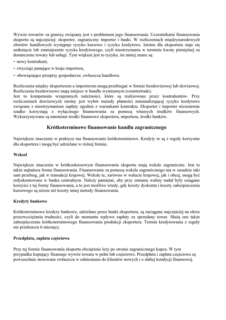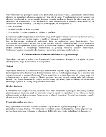 Wywóz towarów za granicę związany jest z problemem jego finansowania. Uczestnikami finansowania eksportu są najczęściej: eksporter, zagraniczny importer i banki. W rozliczeniach międzynarodowych obrotów handlowych występuje ryzyko kursowe i ryzyko kredytowe. Istotne dla eksportera staje się uniknięcie lub zmniejszenie ryzyka kredytowego, czyli nieotrzymania w terminie kwoty pieniężnej za dostarczone towary lub usługi. Tym większe jest to ryzyko, im mniej znane są: - nowy kontrahent, - zwyczaje panujące w kraju importera, - obowiązujące przepisy gospodarcze, zwłaszcza handlowe. Rozliczenia między eksporterem a importerem mogą przebiegać w formie bezdewizowej lub dewizowej. Rozliczenia bezdewizowe mają miejsce w handlu wymiennym (countertrade). Jest to kompensata wzajemnych należności, które są realizowane przez kontrahentów. Przy rozliczeniach dewizowych istotny jest wybór metody płatności minimalizującej ryzyko kredytowe związane z nieotrzymaniem zapłaty zgodnie z warunkami kontraktu. Eksporter i importer niezmiernie rzadko korzystają z wyłącznego finansowania za pomocą własnych środków finansowych. Wykorzystywane są natomiast środki finansowe eksportera, importera, środki banków. Krótkoterminowe finansowanie handlu zagranicznego Największe znaczenie w praktyce ma finansowanie krótkoterminowe. Kredyty te są z reguły korzystne dla eksportera i mogą być udzielane w różnej formie. Weksel Największe znaczenie w krótkookresowym finansowaniu eksportu mają weksle zagraniczne. Jest to także najtańsza forma finansowania. Finansowanie za pomocą weksla zagranicznego ma w zasadzie taki sam przebieg, jak w transakcji krajowej. Weksle te, zarówno w walucie krajowej, jak i obcej, mogą być redyskontowane w banku centralnym. Należy pamiętać, aby przy zmianie waluty nadal były osiągane korzyści z tej formy finansowania, a to jest możliwe wtedy, gdy koszty dyskonta i koszty zabezpieczenia kursowego są niższe niż koszty innej metody finansowania. Kredyty bankowe Krótkoterminowe kredyty bankowe, udzielane przez banki eksportera, są zaciągane najczęściej na okres przezwyciężania trudności, czyli do momentu wpływu zapłaty za sprzedany towar. Służą one także zabezpieczeniu krótkoterminowego finansowania produkcji eksportera. Termin kredytowania z reguły nie przekracza 6 miesięcy. Przedpłata, zapłata częściowa Przy tej formie finansowania eksportu obciążenie leży po stronie zagranicznego kupca. W tym przypadku kupujący finansuje wywóz towaru w pełni lub częściowo. Przedpłata i zapłata częściowa są powszechnie stosowane zwłaszcza w odniesieniu do klientów nowych i o słabej kondycji finansowej. Factoringeksportowy Przy factoringu eksportowym factor zakupuje od eksportera przysługujące mu krótkoterminowe zobowiązania zagranicznego importera. Factor przejmuje na siebie ryzyko wypłacalności importera (ochrona przed odpowiedzialnością za cudzy długu). Eksporter otrzymuje od factora należność w ramach ochrony albo przy wpływie należności z eksportu, albo natychmiast w wysokości 80%, a resztę przy wpływie należności. Tego typu finansowanie może być szczególnie pomocne przy eksporcie dóbr inwestycyjnych, konsumpcyjnych i usług. Dotyczy zwłaszcza średnich przedsiębiorstw, których kapitał własny jest z reguły ograniczony. Przy transakcjach eksportowych ustalony jest 120-dniowy termin zapłaty, którego nie należy przekraczać. Krąg zagranicznych klientów (importerów) nie powinien ulegać zmianom, gdyż może wzrosnąć ryzyko kredytowe w momencie pojawienia się nowych i mało znanych odbiorców. Firma factoringowa i eksporter podpisują umowę, na podstawie, której factor eksportera szuka w kraju importera takiego factora, który dokonałby sprawdzenia wiarygodności kredytowej importera. Transakcje eksportowe prowadzone za pomocą facto.ringu eksportowego są praktycznie dla eksportera bez żadnego ryzyka i mają charakter transakcji krajowej. Koszty factora eksportowego zawierają wydatki za usługi (obsługa upomnień) i wynoszą od l do 2,5% wartości obrotu. Dyskonto prywatne Dyskonto prywatne to weksle, które są ciągnione przez eksportera na jego bank. Bank je akceptuje, następnie zostają one odkupione przez prywatną firmę dyskontową, która redyskontuje je w banku centralnym. Prywatne firmy dyskontowe stawiają wiele warunków zarówno w stosunku do weksla, jak i do jego wystawcy. Są to m. in. ograniczenie kwoty lub terminu. Weksle te nie powinny przekraczać terminu 90 dni. Średnio- i długoterminowe finansowanie handlu zagranicznego Srednio- i długoterminowe finansowanie eksportu dotyczy okresu powyżej 12 Inleslęcy. Stosowane są tu różnego typu zabezpieczenia, gwarancje banków, gwarancje eksportowe, które pomniejszają ryzyko. Najczęściej spotykaną formą są średnio- i długoterminowe kredyty kupieckie i bankowe. Kredyty kupieckie różnią się od bankowych oddzieleniem umowy kupna- sprzedaży zawartej między importerem a eksporterem od umowy kredytowej zawartej między bankami. Kredyty kupiecki średnio- i długoterminowe dotyczą większych sum i najczęściej są związane z towarami wytwarzanymi na zamówienie. Towary te cechują się znaczną wartością (np. samoloty, nowe linie produkcyjne, budowa pełnych obiektów przemysłowych). Zabezpieczenie kredytu jest określane w umowie. Ryzyko eksportera jest tu znaczne. Także refinansowanie bankowe jest trudniejsze, gdyż banki często żądają od eksportera przedstawienia wartości zabezpieczenia. W wielu przypadkach eksporter musi przedłożyć bankom gwarancje ubezpieczenia tego kredytu przez instytucje dokonujące ubezpieczeń transakcji eksportowych. Ubezpieczenie kredytu dotyczy 70-90% jego wartości. Częściowe ryzyko ponosi eksporter, co ma zabezpieczyć przed podejmowaniem zbyt niepewnych transakcji. Koszt ubezpieczenia wynika z przedmiotu i stopnia ryzyka wynikającego z ekspor