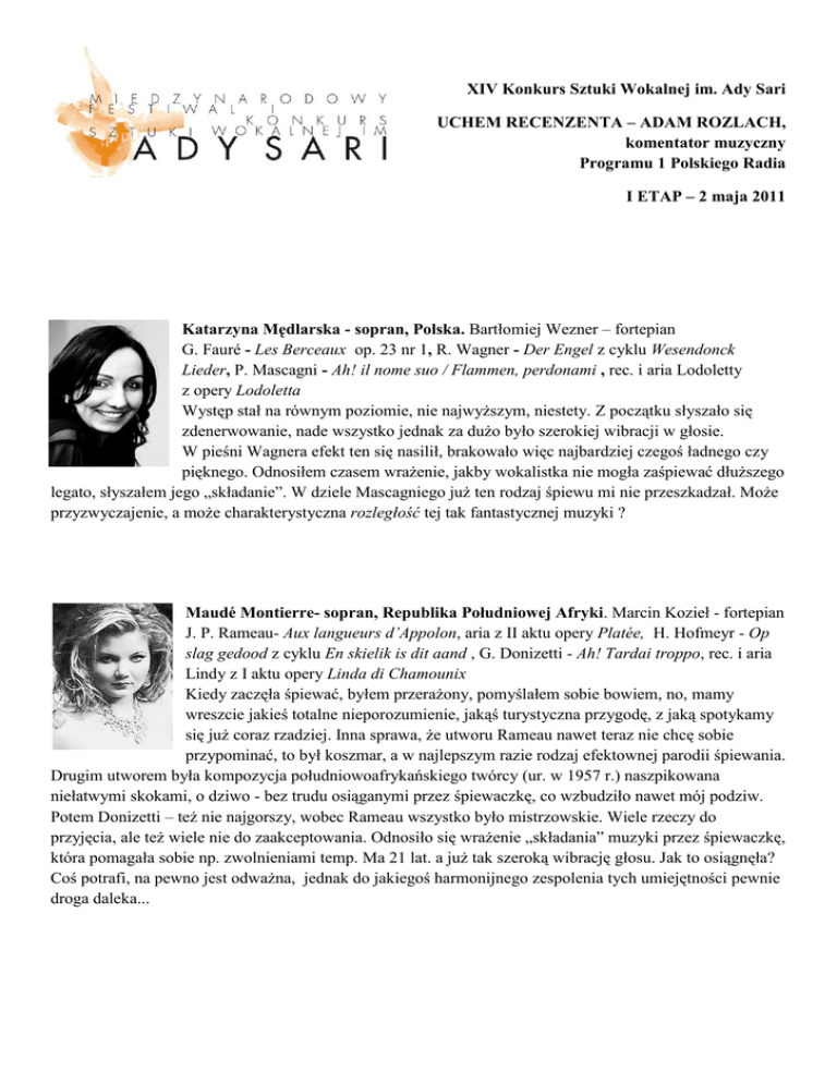 XIV Konkurs Sztuki Wokalnej im. Ady Sari UCHEM RECENZENTA – ADAM ROZLACH, komentator muzyczny Programu 1 Polskiego Radia I ETAP – 2 maja 2011 Katarzyna Mędlarska - sopran, Polska. Bartłomiej Wezner – fortepian G. Fauré - Les Berceaux op. 23 nr 1, R. Wagner - Der Engel z cyklu Wesendonck Lieder, P. Mascagni - Ah! il nome suo / Flammen, perdonami , rec. i aria Lodoletty z opery Lodoletta Występ stał na równym poziomie, nie najwyższym, niestety. Z początku słyszało się zdenerwowanie, nade wszystko jednak za dużo było szerokiej wibracji w głosie. W pieśni Wagnera efekt ten się nasilił, brakowało więc najbardziej czegoś ładnego czy pięknego. Odnosiłem czasem wrażenie, jakby wokalistka nie mogła zaśpiewać dłuższego legato, słyszałem jego „składanie”. W dziele Mascagniego już ten rodzaj śpiewu mi nie przeszkadzał. Może przyzwyczajenie, a może charakterystyczna rozległość tej tak fantastycznej muzyki ? Maudé Montierre- sopran, Republika Południowej Afryki. Marcin Kozieł - fortepian J. P. Rameau- Aux langueurs d’Appolon, aria z II aktu opery Platée, H. Hofmeyr - Op slag gedood z cyklu En skielik is dit aand , G. Donizetti - Ah! Tardai troppo, rec. i aria Lindy z I aktu opery Linda di Chamounix Kiedy zaczęła śpiewać, byłem przerażony, pomyślałem sobie bowiem, no, mamy wreszcie jakieś totalne nieporozumienie, jakąś turystyczna przygodę, z jaką spotykamy się już coraz rzadziej. Inna sprawa, że utworu Rameau nawet teraz nie chcę sobie przypominać, to był koszmar, a w najlepszym razie rodzaj efektownej parodii śpiewania. Drugim utworem była kompozycja południowoafrykańskiego twórcy (ur. w 1957 r.) naszpikowana niełatwymi skokami, o dziwo - bez trudu osiąganymi przez śpiewaczkę, co wzbudziło nawet mój podziw. Potem Donizetti – też nie najgorszy, wobec Rameau wszystko było mistrzowskie. Wiele rzeczy do przyjęcia, ale też wiele nie do zaakceptowania. Odnosiło się wrażenie „składania” muzyki przez śpiewaczkę, która pomagała sobie np. zwolnieniami temp. Ma 21 lat. a już tak szeroką wibrację głosu. Jak to osiągnęła? Coś potrafi, na pewno jest odważna, jednak do jakiegoś harmonijnego zespolenia tych umiejętności pewnie droga daleka... Kerstin Mösender - sopran, Austria. Bartłomiej Wezner – fortepian W. A. Mozart - Als Luise die Briefe KV 520, F. Chopin - Melodia op. 74, M. Ravel Oh! La pitoyable aventure, aria z opery L’heure espagnole Start również niezbyt obiecujący, ale to Himalaje wobec poprzedniczki. Mozart bardzo rzetelny, jak zresztą cały przygotowany program występu. Ciekawy. Pieśń Chopina – jedna z najtrudniejszych, zinterpretowana nieobojętnie, choć smutnie. Głos ma urodziwy, o ładnej barwie. Jest dobrze wyuczona, świetnie przygotowana. W arii Ravela sprawiała wrażenie zimnej i wyrachowanej egzekutorki, ale wokalnie nie wzbudziła żadnych wątpliwości. Doskonale wiedziała, co ma robić, potrafi śpiewać bez większego wysiłku, a robi to znakomicie. Na koniec występu sprezentowała nam piękny, pełen powabu uśmiech. W ten sposób sama, bez niczyjej pomocy, ociepliła swój dość chłodny wizerunek… Hanna Elisabeth Müller - sopran, Niemcy. Marcin Kozieł – fortepian J. Brahms – An eine Aeolsharfe op. 19 nr 5, A. Schoenberg - Erhebung op. 2 nr 3, G. Rossini - Come tacer / vorrei spiegarvi, aria Fanny z opery La cambiale di matrimonio Znowu przykład przepaści, jaka dzieli nas od sąsiadujących z nami zachodnich szkół wokalnych: nie dość, że kawał znakomicie wyszkolonego głosu, to jeszcze bardzo wysoka świadomość samego aktu śpiewania oraz tego, co się śpiewa. W pieśni Brahmsa panuje nad każdym, najdrobniejszym nawet detalem. Śpiewa kulturalnie, dojrzale, frapująco muzycznie, od razu też budzą się też wtedy jurorzy. Schoenberg - nie ma dla niej barier, wszystko zaśpiewa, do tego doskonale. Śpiew zaangażowany emocjonalnie, pewny wokalnie, interpretacja rozwija się harmonijnie, a jaką wystrzeliła kulminacją w tym minutowym zaledwie utworze! Słuchać i uczyć się, moi śpiewający i uczący śpiewać rodacy… Trochę gorzej z Rossinim – niby był to śpiew pełną piersią, ale jednak trochę za mocny, za krzykliwy, do tego śpiewaczka nie najlepiej chyba czuje się w języku włoskim. Za to jaka rekompensata w wolnej, śpiewnej i pięknej kantylenie… Finał mocny, głos - prawdziwy dynamit już gotowy na operowe sceny. Ganna Nosova - sopran, Ukraina. Robert Marat – fortepian G. F. Händel - Tornami a vagheggiar, aria Morgany z I aktu opery Alcina, K. Szymanowski - Uśnijcie, krwawe sny, pieśń Roksany z II aktu opery Król Roger, S. Rachmaninow - Nie poj krasawica op. 4 nr 4 Pierwsza, bezpośrednia konfrontacja Wschodu z Zachodem, będą i następne, bliższe nam, proszę nie tracić nadziei. Zastanawiałem się, nie po raz pierwszy, jaki jest sens tak częstego tu śpiewania wirtuozowskiej muzyki Haendla, kiedy prawie nikt nie jest w stanie podołać jej trudom… To jedno z pytań. Głos Ukrainki jasny, elastyczny, zdecydowany. Wiele potrafi, ale ma też problemy, np. rytmiczne. W Pieśni Roksany głos puchnie, rwie się na dłuższych dźwiękach, szwankuje intonacyjnie, w końcu urywa... Oczywiście najlepsza była pieśń Rachmaninowa. Głos niemały, ciekawy tu. Sylwia Olszyńska – sopran, Polska. Dorota Moliszewska – fortepian W. A. Mozart - Nel grave tormento, rec. i aria Aspasii z II aktu opery Mithridate, rè di Ponto, S. Rachmaninow - Zdies charaszo op. 21 nr 7, L. Bernstein - I Hate Music z cyklu Five Kids Songs Bez zachwytów, ale z wysokim uznaniem wielu dobrych cech wykonawczych. Zwróciło moją uwagę śpiewanie bez wysiłku (lubię takie), a do tego śpiewanie skuteczne i wyraziste, np. w arii Mozarta. Urokliwie wykonana pieśń Rachmaninowa, w której potrafiła zapanować nad materią, niezła interpretacyjnie była też pieśń dziecięca Bernsteina, mimo, że nie lubię w muzyce grania d