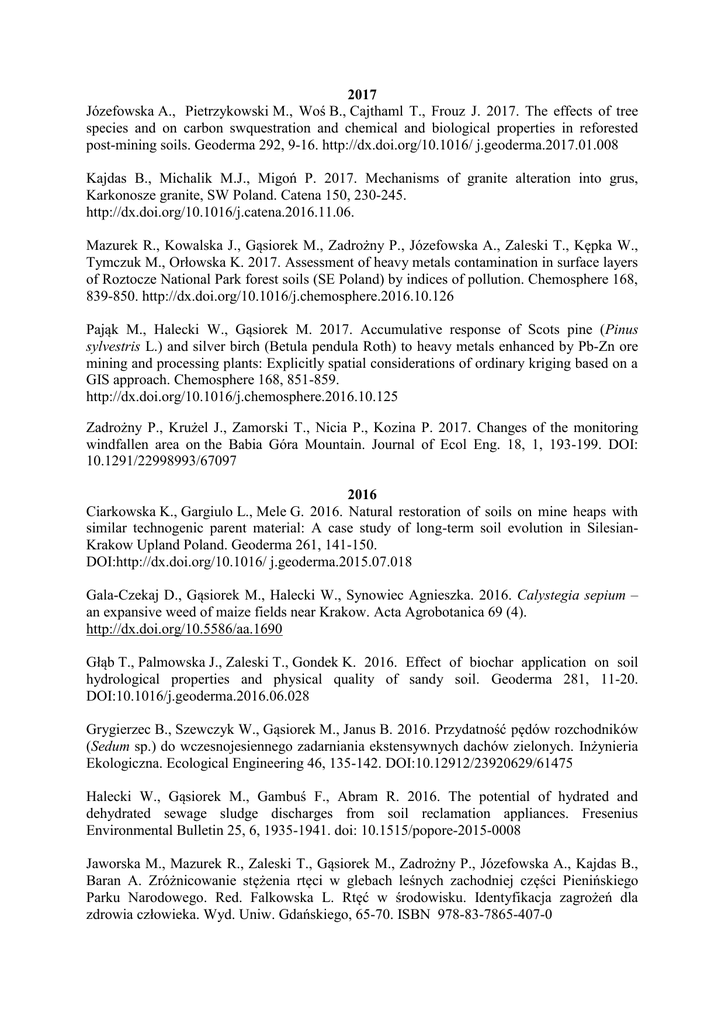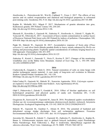 2017 Józefowska A., Pietrzykowski M., Woś B., Cajthaml T., Frouz J. 2017. The effects of tree species and on carbon swquestration and chemical and biological properties in reforested post-mining soils. Geoderma 292, 9-16. http://dx.doi.org/10.1016/ j.geoderma.2017.01.008 Kajdas B., Michalik M.J., Migoń P. 2017. Mechanisms of granite alteration into grus, Karkonosze granite, SW Poland. Catena 150, 230-245. http://dx.doi.org/10.1016/j.catena.2016.11.06. Mazurek R., Kowalska J., Gąsiorek M., Zadrożny P., Józefowska A., Zaleski T., Kępka W., Tymczuk M., Orłowska K. 2017. Assessment of heavy metals contamination in surface layers of Roztocze National Park forest soils (SE Poland) by indices of pollution. Chemosphere 168, 839-850. http://dx.doi.org/10.1016/j.chemosphere.2016.10.126 Pająk M., Halecki W., Gąsiorek M. 2017. Accumulative response of Scots pine (Pinus sylvestris L.) and silver birch (Betula pendula Roth) to heavy metals enhanced by Pb-Zn ore mining and processing plants: Explicitly spatial considerations of ordinary kriging based on a GIS approach. Chemosphere 168, 851-859. http://dx.doi.org/10.1016/j.chemosphere.2016.10.125 Zadrożny P., Krużel J., Zamorski T., Nicia P., Kozina P. 2017. Changes of the monitoring windfallen area on the Babia Góra Mountain. Journal of Ecol Eng. 18, 1, 193-199. DOI: 10.1291/22998993/67097 2016 Ciarkowska K., Gargiulo L., Mele G. 2016. Natural restoration of soils on mine heaps with similar technogenic parent material: A case study of long-term soil evolution in SilesianKrakow Upland Poland. Geoderma 261, 141-150. DOI:http://dx.doi.org/10.1016/ j.geoderma.2015.07.018 Gala-Czekaj D., Gąsiorek M., Halecki W., Synowiec Agnieszka. 2016. Calystegia sepium – an expansive weed of maize fields near Krakow. Acta Agrobotanica 69 (4). http://dx.doi.org/10.5586/aa.1690 Głąb T., Palmowska J., Zaleski T., Gondek K. 2016. Effect of biochar application on soil hydrological properties and physical quality of sandy soil. Geoderma 281, 11-20. DOI:10.1016/j.geoderma.2016.06.028 Grygierzec B., Szewczyk W., Gąsiorek M., Janus B. 2016. Przydatność pędów rozchodników (Sedum sp.) do wczesnojesiennego zadarniania ekstensywnych dachów zielonych. Inżynieria Ekologiczna. Ecological Engineering 46, 135-142. DOI:10.12912/23920629/61475 Halecki W., Gąsiorek M., Gambuś F., Abram R. 2016. The potential of hydrated and dehydrated sewage sludge discharges from soil reclamation appliances. Fresenius Environmental Bulletin 25, 6, 1935-1941. doi: 10.1515/popore-2015-0008 Jaworska M., Mazurek R., Zaleski T., Gąsiorek M., Zadrożny P., Józefowska A., Kajdas B., Baran A. Zróżnicowanie stężenia rtęci w glebach leśnych zachodniej części Pienińskiego Parku Narodowego. Red. Falkowska L. Rtęć w środowisku. Identyfikacja zagrożeń dla zdrowia człowieka. Wyd. Uniw. Gdańskiego, 65-70. ISBN 978-83-7865-407-0 Józefowska A., Miechówka A., Frouz J. 2016. Comparison of earthworm populations in arable and grassland fields in the Outer Western Carpathians, South Poland. Biologia 71, 3, 316-322. DOI:10.1515/biolog-2016-0035 Józefowska A., Woś B., Pietrzykowski M. 2016. Tree species and soil substrate effects on soil biota during early soil forming stages at afforested mine sites. Applied Soil Ecology 102, 70-79. DOI:http://dx.doi.org/10.1016/j.apsoil.2016.02.012 Kowalska J., Mazurek R., Gąsiorek M., Setlak M., Zaleski T., Waroszewski J. 2016. Soil pollution indices conditioned by medieval metallurgical activity – A case study from Krakow (Poland). 2016. Environmental Pollution 218, 1023-1036. 0269-7491/2016. http://dx.doi.org/10.1016/j.envpol.2016.08.053 Kopeć M., Gondek K., Mierzwa-Hersztek M., Zaleski T. 2016. Effect of the composting process on physical and energetic changes in compost. Acta Agroph. 23, 4, 607-619. Mazurek R., Kowalska J., Gąsiorek M., Setlak M. 2016. Micromorphological and physicochemical analyses of cultural layers in the urban soil of medieval city – A case study from Krakow, Poland. Catena 141, 73-84. http://dx.doi.org/10.1016/j.catena.2016.02.026. Łokas E., Zwoliński Z., Rachlewicz G., Gąsiorek M., Wilkosz G., Samolej K. 2016. Distribution of anthropogenic and naturally occurring radionuclides in soils and lakes of Central Spitsbergen (Arctic). Journal of Radioanalytical and Nuclear Chemistry. doi:10.1007/s10967-016-5085-x Miechówka A., Zaleski T., Kowalczyk E. 2015. Profilowe zróżnicowanie form żelaza i glinu w glebach pod świerczyną górnoreglową Plagiothecio-Piccetum tatricum w Gorcach jako wskaźnik procesów glebotwórczych. Soil Annual 60, 3, 125-132. DOI: 10.1515/ssa-20150028. Sołek-Podwika K., Ciarkowska K., Kaleta D. 2016. Assessment of the risk of pollution by sulfur compounds and heavy metals in soils located in the proximity of a disused for 20 years sulfur mine (SE Poland). Journal of Environmental Management 180, 450-458. 03014797/2016. http://dx.doi.org/10.1016/j.jenvman.2016.05.074 Wiszniewska A., Hanus-Fajerska E., Muszyńska E., Ciarkowska K. 2016. Natural organic amendments for improved phytoremediation of polluted soils: a review of recent progress. Pedosphere 26, 1, 1-12. DOI:10.1016/S1002-0160(15)60017-0 Wojewodzic T., Zadrożny P. 2016. Rola drobnych gospodarstw rolnych w realizacji środowiskowych funkcji rolnictwa. Wieś i Doradztwo 1(86), 18-21. Wojewodzic T., Jezowit-Jurek M., Zadrożny P. 2016. Popularność programów rolnośrodowiskowych wśród rolników województwa małopolskiego. Wieś i Doradztwo 5(90), 11-14. Zydroń T., Zaleski T., Janik D. 2016. Wpływ wilgotności i prędkości ścinania na wytrzymałości na ścinanie gruntów pylastych z okolic Kotliny Sądeckiej. Acta Scientarum Polonorum Formatio Circumiectus 15, 1, 165-177. 2015 Baran A., Zaleski T., Kulikowski E., Wieczorek J. 2015. Hydrophysical and biological properties of sandy substrata enriched with hydrogel. Pol. J. Environ. Stud. 24, 6, 2355-2362. DOI: 10.15244/pjoes/59258 Czajka B., Łajczak A., Kaczka R.J., Nicia P.