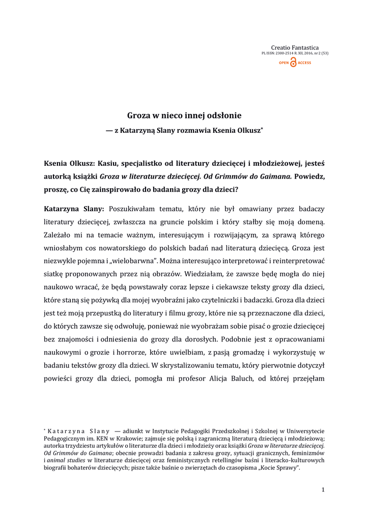 Creatio Fantastica PL ISSN: 2300-2514 R. XII, 2016, nr 2 (53) Groza w nieco innej odsłonie — z Katarzyną Slany rozmawia Ksenia Olkusz* Ksenia Olkusz: Kasiu, specjalistko od literatury dziecięcej i młodzieżowej, jesteś autorką książki Groza w literaturze dziecięcej. Od Grimmów do Gaimana. Powiedz, proszę, co Cię zainspirowało do badania grozy dla dzieci? Katarzyna Slany: Poszukiwałam tematu, który nie był omawiany przez badaczy literatury dziecięcej, zwłaszcza na gruncie polskim i który stałby się moją domeną. Zależało mi na temacie ważnym, interesującym i rozwijającym, za sprawą którego wniosłabym cos nowatorskiego do polskich badań nad literaturą dziecięcą. Groza jest niezwykle pojemna i „wielobarwna”. Można interesująco interpretować i reinterpretować siatkę proponowanych przez nią obrazów. Wiedziałam, że zawsze będę mogła do niej naukowo wracać, że będą powstawały coraz lepsze i ciekawsze teksty grozy dla dzieci, które staną się pożywką dla mojej wyobraźni jako czytelniczki i badaczki. Groza dla dzieci jest też moją przepustką do literatury i filmu grozy, które nie są przeznaczone dla dzieci, do których zawsze się odwołuję, ponieważ nie wyobrażam sobie pisać o grozie dziecięcej bez znajomości i odniesienia do grozy dla dorosłych. Podobnie jest z opracowaniami naukowymi o grozie i horrorze, które uwielbiam, z pasją gromadzę i wykorzystuję w badaniu tekstów grozy dla dzieci. W skrystalizowaniu tematu, który pierwotnie dotyczył powieści grozy dla dzieci, pomogła mi profesor Alicja Baluch, od której przejęłam K a t a r z y n a S l a n y — adiunkt w Instytucie Pedagogiki Przedszkolnej i Szkolnej w Uniwersytecie Pedagogicznym im. KEN w Krakowie; zajmuje się polską i zagraniczną literaturą dziecięcą i młodzieżową; autorka trzydziestu artykułów o literaturze dla dzieci i młodzieży oraz książki Groza w literaturze dziecięcej. Od Grimmów do Gaimana; obecnie prowadzi badania z zakresu grozy, sytuacji granicznych, feminizmów i animal studies w literaturze dziecięcej oraz feministycznych retellingów baśni i literacko-kulturowych biografii bohaterów dziecięcych; pisze także baśnie o zwierzętach do czasopisma „Kocie Sprawy”. * 1 metodologię, czyli krytykę archetypowo-mitograficzną, bardzo przydatną w badaniach nad literaturą dziecięcą. K.O.: Jak długo powstawała książka? K.S.: Pierwotnie była to praca doktorska, którą pisałam z różną systematycznością w czasie czteroletnich studiów doktoranckich. Kiedy okazało się, że może stać się książką (było to już po podjęciu przeze mnie pracy w uczelni), pracowałam nad nią bardzo intensywnie jeszcze rok ze szczególnym uwzględnieniem inspirujących opracowań zagranicznych i metodologii. K.O.: Jak zbierałaś materiały? K.S.: Zanim zebrałam materiał literacki, skrupulatnie przygotowałam metodologię, która z jednej strony zawęziła materiał badawczy, z drugiej wytyczyła ścieżkę ściśle związaną z krytyką archetypową. Wiedzie ona od form prostych, czyli baśni magicznych przez baśnie literackie, powieści oniryczne i fantazmatyczne do wyrazistych, współczesnych przykładów tekstów grozy dla dzieci, mieszczących się w konwencji fantazmatycznej i fantastycznej. Nie mogłam pominąć klasyki literatury dziecięcej i to było dla mnie wyzwanie, gdyż wydawać się może, że o tej klasyce już wszystko napisano. Musiałam też zmierzyć się z poszukiwaniem elementów grozy w tekstach, których nie lubię, takich jak Alicja w Krainie Czarów Lewisa Carrolla. Jednak nie daleko pada groteska od grozy i właśnie nurt mrocznej groteski okazał się w tym przypadku cennym kluczem interpretacyjnym. Najwięcej satysfakcji dało mi poszukiwanie znaczących przykładów literatury współczesnej i budowanie ich interpretacji z perspektywy krytyki archetypowej. Warto dodać, że nie jest to praca historyczno-literacka, lecz interpretacyjna, dlatego zależało mi na dobraniu różnych utworów, które mocno podkreślą wielowymiarowość grozy w literaturze dziecięcej i będą dla dzieci rozpoznawalne. Jeżeli chodzi o opracowania naukowe to bardzo cenne okazały się pozycje zagraniczne, które już od lat 60. tych XX wieku eksplorują grozę w literaturze dziecięcej, szczególnie w baśniach. K.O.: Powiedz mi: dzieci lubią się bać? K.S.: Na to pytanie inaczej odpowie psycholog, pedagog, a inaczej badaczka literatury dziecięcej, czyli ja. Jeżeli przyjrzymy się rozwojowi literatury dziecięcej to kategorie takie jak: groteska, groza, turpizm, makabra, motywy skatologiczne, sadystyczne są jednymi 2 z najbardziej rozpoznawalnych i lubianych przez dzieci. Ilość tekstów grozy dla dzieci rośnie, są omawiane w mediach, prasie, powstają na ich bazie kultowe filmy, a to wszystko za sprawą dzieci, które wnoszą je na literacki piedestał. Możemy mówić o pojawieniu się powieści grozy dla dzieci, które mieszczą się w ramach tradycyjnej fantastyki grozy, ale nie tylko. Istnieją teksty schizoidalne, tworzone przez znawców formuły horroru i grozy. Ich odbiorcą jest dziecko, które lubi odczuwać strach, dlatego intuicyjnie szuka tekstów opartych na „grze ze strachem” omawianej przez Rogera Caillois. Gra ta, jak sama nazwa wskazuje, gwarantuje czytelnikowi wejście w świat grozy traktowanej jako fikcja przy możliwości wyjścia z niego w dowolnym momencie. To spostrzeżenie odnosi się do dzieci w starszym wieku szkolnym. Spójrzmy jednak na dzieci w wieku przedszkolnym. Lubią one brać udział w zabawach w „banie się” i „straszenie się”, podczas których wymyślają makabryczne i horrorystyczne wierszyki. W tych improwizowanych wierszach naigrywają się ze strachów, upiorów, dzieciożerców i złych dorosłych. Karnawalizują strach, terapeutyzują go poprzez jowialny żart. Jerzy Cieślikowski pisał, że dzieci uwielbiają straszyć się nawzajem, odczuwają