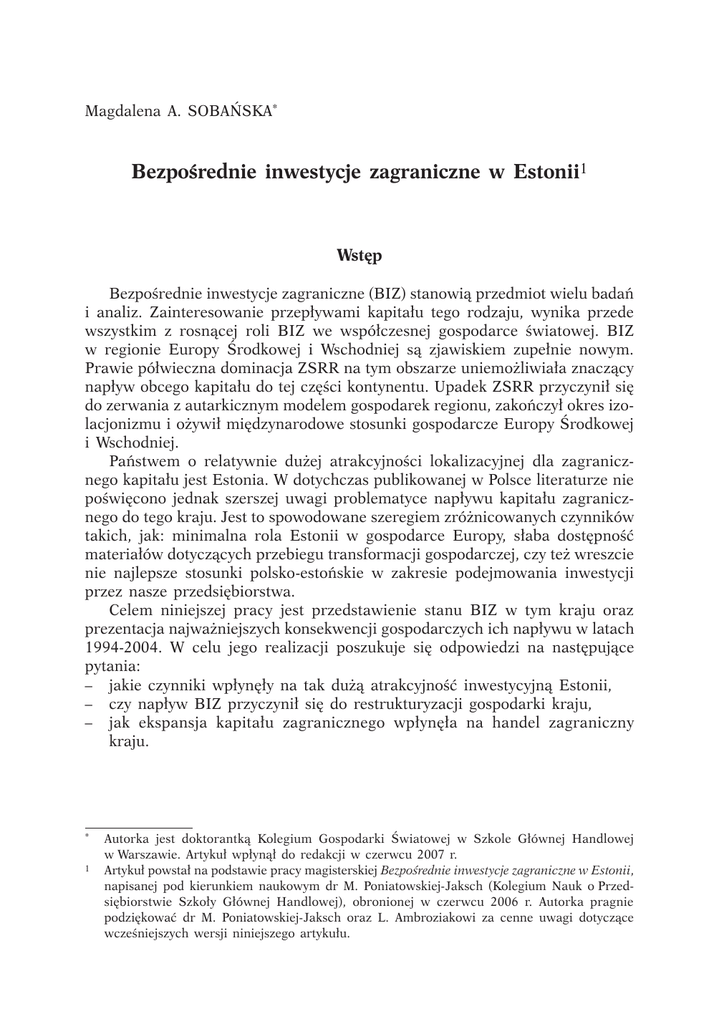 Magdalena A. SOBAŃSKA* Bezpośrednie inwestycje zagraniczne w Estonii Wstęp Bezpośrednie inwestycje zagraniczne (BIZ) stanowią przedmiot wielu badań i analiz. Zainteresowanie przepływami kapitału tego rodzaju, wynika przede wszystkim z rosnącej roli BIZ we współczesnej gospodarce światowej. BIZ w regionie Europy Środkowej i Wschodniej są zjawiskiem zupełnie nowym. Prawie półwieczna dominacja ZSRR na tym obszarze uniemożliwiała znaczący napływ obcego kapitału do tej części kontynentu. Upadek ZSRR przyczynił się do zerwania z autarkicznym modelem gospodarek regionu, zakończył okres izolacjonizmu i ożywił międzynarodowe stosunki gospodarcze Europy Środkowej i Wschodniej. Państwem o relatywnie dużej atrakcyjności lokalizacyjnej dla zagranicznego kapitału jest Estonia. W dotychczas publikowanej w Polsce literaturze nie poświęcono jednak szerszej uwagi problematyce napływu kapitału zagranicznego do tego kraju. Jest to spowodowane szeregiem zróżnicowanych czynników takich, jak: minimalna rola Estonii w gospodarce Europy, słaba dostępność materiałów dotyczących przebiegu transformacji gospodarczej, czy też wreszcie nie najlepsze stosunki polsko-estońskie w zakresie podejmowania inwestycji przez nasze przedsiębiorstwa. Celem niniejszej pracy jest przedstawienie stanu BIZ w tym kraju oraz prezentacja najważniejszych konsekwencji gospodarczych ich napływu w latach 1994-2004. W celu jego realizacji poszukuje się odpowiedzi na następujące pytania: – jakie czynniki wpłynęły na tak dużą atrakcyjność inwestycyjną Estonii, – czy napływ BIZ przyczynił się do restrukturyzacji gospodarki kraju, – jak ekspansja kapitału zagranicznego wpłynęła na handel zagraniczny kraju. * Autorka jest doktorantką Kolegium Gospodarki Światowej w Szkole Głównej Handlowej w Warszawie. Artykuł wpłynął do redakcji w czerwcu 2007 r. Artykuł powstał na podstawie pracy magisterskiej Bezpośrednie inwestycje zagraniczne w Estonii, napisanej pod kierunkiem naukowym dr M. Poniatowskiej-Jaksch (Kolegium Nauk o Przedsiębiorstwie Szkoły Głównej Handlowej), obronionej w czerwcu 2006 r. Autorka pragnie podziękować dr M. Poniatowskiej-Jaksch oraz L. Ambroziakowi za cenne uwagi dotyczące wcześniejszych wersji niniejszego artykułu. 56 GOSPODARKA NARODOWA Nr 9/2007 Przebieg procesu transformacji akceleratorem napływu BIZ Jeszcze w drugiej połowie lat 80. gospodarka Estonii była zdominowana przez własność państwową, natomiast własność prywatna nie miała racji bytu. Estońskie przedsiębiorstwa mogły kontaktować się z zagranicznymi firmami tylko po uzyskaniu zgody od odpowiednich instytucji ZSRR. Rok 1987 w pewien sposób zmienił stosunek władz radzieckich do obcego kapitału, kiedy to Rada Ministrów Związku Radzieckiego zezwoliła na tworzenie firm joint venture pomiędzy krajowymi i zagranicznymi przedsiębiorstwami, na takiej jednak zasadzie, że partner radziecki miał dysponować przynajmniej 51% kapitału podstawowego i zarówno prezes zarządu, jak i dyrektor generalny nie mogli być obcokrajowcami. Dekrety przyjęte w 1988 i 1989 r. zlikwidowały większość niekorzystnych dla zagranicznych inwestorów postanowień [Lugus, Hachey, 1995]. Jednakże dopiero liberalizacja przepisów prawnych, jaka miała miejsce po odzyskaniu przez Estonię niepodległości, usunęła bariery i stworzyła odpowiednie warunki dla napływu BIZ. System prawny w Estonii został oparty na systemie niemieckim, co związane było z tradycjami historycznymi. Dodatkowo w kolejnych latach coraz silniej oddziaływało na niego prawodawstwo skandynawskie oraz szwajcarskie [Sorainen, Klauberg, Berlaus, Davidonis, 2002, s. 37-38]. Na kształt estońskiego systemu prawnego duży wpływ miało szybkie i stanowcze opowiadzenie się władz kraju za integracją z Unią Europejską, a także z WTO. Istotne znaczenie dla anagażowania się kapitału zagranicznego w Estonii odegrało przyjęcie w 1991 r. Prawa o Inwestycjach Zagranicznych. Jego postanowienia zostały później zabezpieczone przez umowy bilateralne o promocji i protekcji inwestycji, umowy podatkowe o charakterze bilateralnym oraz odniesienia do ważnych konwencji międzynarodowych. W Estonii wprowadzono system niskiego, liniowego opodatkowania, który miał zachęcić przedsiębiorstwa do maksymalizacji przez nie zysku. Kolejnym krokiem ustawodawstwa było przyjęcie w 2000 r. Ustawy o podatku dochodowym. Do najważniejszych osiągnięć estońskiej transformacji, owocujących wysoką atrakcyjnością lokalizacyjną firm zagranicznych, oprócz liberalizacji przepisów prawnych, zaliczyć można: reformę pieniężną prywatyzację. 20 czerwca 1992 r., rząd na czele którego stanął premier Tiit Vahi, zerwał całkowicie z byłą radziecką strefą rublową i wprowadził swoją własną walutę – koronę estońską (Eesti koron – EEK). Estonia była pierwszym krajem dawnego ZSRR, który zdecydował się na taki krok. Reformy pieniężnej dokonano wbrew radom specjalistów z Międzynarodowego Funduszu Walutowego. Politykę monetarną zdecydowano się oprzeć na instytucji izby walutowej (currency board arrangement). Estońska waluta została zakotwiczona w markach niemieckich (DM), kurs ustalono na 8:1, a jego dozwolone odchylenie wynosić miało 3% [Oleynik, 2000, s. 149]. Reforma pieniężna była nakierowana na długookresową stabilizację, sprzyjała wzrostowi gospodarczemu, stabilnemu kursowi waluty oraz trwałemu obniżeniu inflacji. W rzeczywistości korona estońska stanowiła bliski substytut dla waluty swoich rezerw – marki niemieckiej. Polityka monetarna przyczyniła się do stworzenia stabilnego środowiska makroekonomicznego sprzyjającego inwestycjom zagranicznym [OECD Reviews of Foreign Magdalena A. Sobańska, Bezpośrednie inwestycje zagraniczne w Estonii 57 Direct Investment..., 2001, s. 9]. Jak wspominał później Mart Laar – pierwszy premier niepodległej Estonii wybran