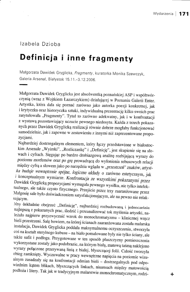 Definicja Malgorzata Dawidek Galeria Arsenal, inne fragmenty Gryglicka, Bialystok Fragmenty, kuratorka Monika Szewczyk, 15.11.-3.12.2006. Malgorzata Dawidek Gryglicka jest absolwentk,! poznanskiej ASP i wspoltworczyni,! (wraz z Wojtkiem Lazarczykiem) dzialaj,!cej w Poznaniu Galerii Enter. Artystka, ktora dala siti poznac zarowno jako autorka poezji konkretnej, jak i krytyczka oraz historyczka sztuki, indywidualn,! prezentacjti kilku swoich prac zatytulowala "Fragmenty". Tytul to zarowno adekwatny, jak i w konfrontacji z wystaw,! pozostawiaj,!cy uCZliciepewnego niedosytu. Kazda z trzech pokazanych przez Dawidek Gryglick,! realizacji rownie dobrze moglaby funkcjonowac samodzielnie,jak i zapewne w zestawieniu z innymi niz zaprezentowane propozycjami. Najbardziej dostrzegalnym elementem, ktory I'!czy przedstawione w bialostockim Arsenale "Wyimki", "Rozliczankti" i "Definicjti", jest skupienie siti na slowach i cyfrach. Sitigaj'!c po bardzo drobiazgow,! analizti rozbijaj,!C'! wyrazy do poziomu morfem6w oraz po grit prowadzqCi! do wylonienia rebusowych relacji mitidzy cyfr,! a sIowemjako po narz~dzia wglqdu w "przestrzen" znak6w, artyst- ka buduje wewfll;~trznjesp6jne, logiczne uklady 0 zarowno estetycznym, jak i konceptualnym wymiarze. Konfrontacja ze wszystkimi pokazanymi przez Dawidek Gryglickq propozycjami wymagala pewnego wysilku, nie tylko intelektualnego, ale takie czysto fizycznego. Przejscie przez trzy zaaranzowane przez Malgosi~ sale bylo doswiadczeniem satysfakcjonujqcym, ale na pewno nie relaksuj,!cym. Qo'Klaanie obejrzec "Definicjti", najbardziej rozbudowanq i jednoczesnie najlepsz,! z pokazanych prac, sledzic i przeanalizowac tok myslenia artystki, nalezalo najpierw przyzwyczaic wzrok do monochromatyzmu - klinicznej wrticz bieli przestrzeni. Salti bowiem, na ktorej scianach zaaranzowana zostala malarska instalacja, Dawidek Gryglicka poddala maksymalnemu oczyszczeniu, stworzyla cos na ksztalt sterylnego kubusu - na bialo pomalowane byly nie tylko sciany, ale takie sufit i podloga. Przygotowane w ten sposob plaszczyzny pomieszczenia wykorzystane zostaly jako podobrazie, na kt6rym bial,!, matow,! tasm,! naklejono wyrazy pol,!czone przerywan,! lini,! z bialej, blyszcz,!cej folii. Calosc tworzyla obieg zamkniitty. WycZliwalne w pracy wewntitrzne napiticia na poziomie wizualnym zasadzaly siti na konfrontacji odmian bieli - dostrzegalnych pod odpowiednim k,!tem blikach, blyszcz,!cych linkach, niuansach mitidzy matowosci,! podloza i litery. Takjak w tradycyjnym malarstwie monochromatycznym, rodzi""""n'} ly sit( one na styku wielu odcieni jednej barwy. Ograniczenie kolorystycznych srodk6w wyrazu do bieli - symbolizujqcej racjonalizm, brak barw, a jednoczesnie sumt( r6znobarwnych wiqzek swiatla - zwykle kojarzone z dqzeniem do oczyszczenia pola obrazowego ze znaczen, skupienia uwagi na formie czy materii, w przypadku pracy Dawidek Gryglickiej pelnilo, jak sit( wydaje, przewrotnq funkcjt(. Zamiast bowiem odwracac uwagt( od signijie, zmuszalo do tego, by na nim wlasnie jq skoncentrowac. Punktem wyjscia dla rozwazan Malgosi bylo z pozoru tylko banalne slowo "definicja". Slownikowa eksplikacja, zwykle bezmyslnie akceptowana, dla Dawidek Gryglickiej stala sit( narzt(dziem analizy semantycznej. W zasadzie kazdy budujqcy definicjt( wyraz - definiens, potraktowany zostal jako poczqtkowe ogniwo lancucha slownych skojarzen. Implikowane przez poszczeg61ne slowa asocjacje zazt(biajq sit( i spotykajq we wsp61nych punktach, a budowane przez nie uklady rozgalt(ziajq sit(, utrudniajqc sledzenie toku rozwazan artystki. Pr6ba narysowania linii, kt6re pomoglyby oglqdajqcemu wyjsc z labiryntu, zawsze sit( wiqze z koniecznosciq pominit(cia pewnych fragment6w myslowego wywodu. Podqzajqc za blyszczqcymi odcinkami link6w, a wychodzqc od uzytych w wyjasnieniu rzeczownik6w "znaczenia", "wyrazu", "pojt(c", "tresci" oraz wyrazenia przyimkowego "za pomocq", dochodzimy do "destrukcji" i "dekonstrukcji" oraz wsp61nego im pierwszego czlonu "de". Od pojawiajqcego sit(juz "czasu", zwiqzanego odnogami mit(dzy innymi z "ciszq", "glosem" , "diwit(kiem" i "historiq", przerywana linia kieruje wzrok w stront( morfemu "fi", kt6rego poprzedzajqce ogniwo stanowi "liczba fi". Zupelnie nie zwracajqcy uwagi zaimek dzierzawczy "jego" poprzez bezosobowo uzyte zaimki "on", "ona" i "ono" prowadzil do ko- lejnego elementu skladowego "Definicji" - morfemu "ja", przedluzonego 0 ci'!g odr~cznie zapisanej o16wkiem. swoistej wyliczanki "ja" w r6inycb konfiguIacjach, w podmiotowej formie. Od zaimka "ono" wychodzi jedna z linii prowadz,!cych z kolei do "nic". Wyjsciowa "definicja" przy koricu wywodu powr6cila w swojej sylabizowanej formie "de fi nic ja". Niegroiny z pozoru analityczny zabieg, przypominaj,!cy lekcje j~zyka polskiego w pierwszych klasach szkoly podstawowej, doprowadzil zar6wno do graficznego rozbicia zapisu,jak i do semantycznego zamieszania. Po przeanalizowaniu pracy Dawidek Gryglickiej mamy w'!tpliwosci, czy definicja przed i po rozkladzie to rzeczywiScie ta sarna jednostka leksykalna. Morfemy, najmniejsze jednostki j~zykowe buduj,!ce wyrazy, maj,! przeciez wlasny sens. Czy zatem znane poj([cia rzeczywiscie maj,! moc objasniania znaczenia nieznanego terminu? Wyczuwalny w "Definicji" pierwiastek uosobienia, kt6ry przez wl,!czenie w realizacj~ odr([cznego pisma powi,!zac mozna z osob,! artystki, obecny jest takze w drugiej z zaprezentowanych w bialostockim Arsenale prac - w "Wyimkach". Plaszczyzna pomalowanej na bialo sciany po raz kolejny stala si~ podobraziem dla nalozonego na ni,! tekstu. W ciemnym pomieszczeniu wyrazy wyklejone z blyszcz,!cej folii nie mialy juz mocy link6w doprowadzaj,!cych do ukrytych s16w-ogniw. Widoczne byly jedynie dzi([ki rzutowanej na scian([ projekcji wideo - zapisowi pokazuj,!cemu pisz,!ce na klawiaturze komputera r~ce (jak mozna si([ domyslec - r([ce artystki). Wraz z ich ruchem ujawnialy si([poszczeg61ne elementy naklejonego na scianie tekstu: "jestem zla", "jestem artystk'!", "jestem inna", "jestem 