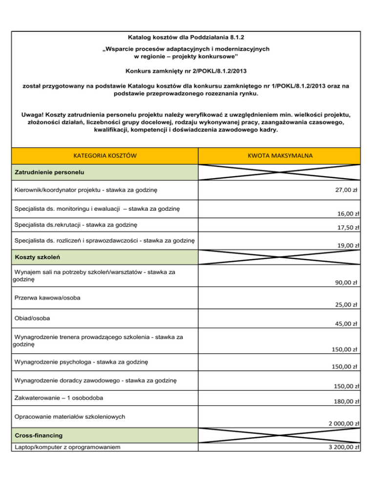 Katalog kosztów dla Poddziałania 8.1.2 „Wsparcie procesów adaptacyjnych i modernizacyjnych w regionie – projekty konkursowe” Konkurs zamknięty nr 2/POKL/8.1.2/2013 został przygotowany na podstawie Katalogu kosztów dla konkursu zamkniętego nr 1/POKL/8.1.2/2013 oraz na podstawie przeprowadzonego rozeznania rynku. Uwaga! Koszty zatrudnienia personelu projektu należy weryfikować z uwzględnieniem min. wielkości projektu, złożoności działań, liczebności grupy docelowej, rodzaju wykonywanej pracy, zaangażowania czasowego, kwalifikacji, kompetencji i doświadczenia zawodowego kadry. KATEGORIA KOSZTÓW KWOTA MAKSYMALNA Zatrudnienie personelu Kierownik/koordynator projektu - stawka za godzinę Specjalista ds. monitoringu i ewaluacji – stawka za godzinę Specjalista ds.rekrutacji - stawka za godzinę Specjalista ds. rozliczeń i sprawozdawczości - stawka za godzinę 27,00 zł 16,00 zł 17,50 zł 19,00 zł Koszty szkoleń Wynajem sali na potrzeby szkoleń/warsztatów - stawka za godzinę 90,00 zł Przerwa kawowa/osoba 25,00 zł Obiad/osoba Wynagrodzenie trenera prowadzącego szkolenia - stawka za godzinę Wynagrodzenie psychologa - stawka za godzinę Wynagrodzenie doradcy zawodowego - stawka za godzinę Zakwaterowanie – 1 osobodoba 45,00 zł 150,00 zł 150,00 zł 150,00 zł 180,00 zł Opracowanie materiałów szkoleniowych 2 000,00 zł Cross-financing Laptop/komputer z oprogramowaniem 3 200,00 zł Laptop/komputer bez oprogramowania Roll-up Rzutnik Urządzenie wielofunkcyjne Drukarka Niszczarka Szafa do przechowywania dokumentów projektu 2 500,00 zł 350,00 zł 2 800,00 zł 2 300,00 zł 600,00 zł 600,00 zł 950,00 zł Rekrutacja i działania promocyjne Opracowanie ulotek i plakatów Druk ulotek - 1 szt. Zaprojektowanie i wykonanie strony internetowej Utrzymanie i aktualizacja strony internetowej/miesiąc Ogłoszenia - artykuł Ogłoszenia- spot 1 200,00 zł 0,75 zł 2 000,00 zł 300,00 zł 350,00 zł 1 000,00 zł
