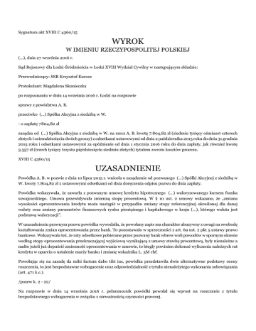 Sygnatura akt XVIII C 4360/15 WYROK W IMIENIU RZECZYPOSPOLITEJ POLSKIEJ (...), dnia 27 września 2016 r. Sąd Rejonowy dla Łodzi-Śródmieścia w Łodzi XVIII Wydział Cywilny w następującym składzie: Przewodniczący: SSR Krzysztof Kurosz Protokolant: Magdalena Skonieczka po rozpoznaniu w dniu 14 września 2016 r. Łodzi na rozprawie sprawy z powództwa A. B. przeciwko (...) Spółka Akcyjna z siedzibą w W. - o zapłatę 7 804,82 zł zasądza od (...) Spółka Akcyjna z siedzibą w W. na rzecz A. B. kwotę 7.804,82 zł (siedmiu tysięcy ośmiuset czterech złotych i osiemdziesięciu dwóch groszy) z odsetkami ustawowymi od dnia 2 października 2015 roku do dnia 31 grudnia 2015 roku i odsetkami ustawowymi za opóźnienie od dnia 1 stycznia 2016 roku do dnia zapłaty, jak również kwotę 3.357 zł (trzech tysięcy trzystu pięćdziesięciu siedmiu złotych) tytułem zwrotu kosztów procesu. XVIII C 4360/15 UZASADNIENIE Powódka A. B. w pozwie z dnia 10 lipca 2015 r. wniosła o zasądzenie od pozwanego (...) Spółki Akcyjnej z siedzibą w W. kwoty 7.804,82 zł z ustawowymi odsetkami od dnia doręczenia odpisu pozwu do dnia zapłaty. Powódka wskazywała, że zawarła z pozwanym umowę kredytu hipotecznego (...) waloryzowanego kursem franka szwajcarskiego. Umowa przewidywała zmienną stopę procentową. W § 10 ust. 2 umowy wskazano, że „zmiana wysokości oprocentowania kredytu może nastąpić w przypadku zmiany stopy referencyjnej określonej dla danej waluty oraz zmiany parametrów finansowych rynku pieniężnego i kapitałowego w kraju (…), którego waluta jest podstawą waloryzacji”. W uzasadnieniu prawnym pozwu powódka wywodziła, że powołany zapis ma charakter abuzywny z uwagi na swobodę kształtowania zmian oprocentowania przez bank. To pozostawało w sprzeczności z art. 69 ust. 2 pkt 5 ustawy prawo bankowe. Wskazywała też, że raty odsetkowe pobierane przez pozwany bank wbrew woli powodów w spornym okresie według stopy oprocentowania przekraczającej wyjściową wynikającą z umowy stawkę procentową, były nienależne a nadto jeżeli już dopuścić zmienność oprocentowania w umowie, to biegły powinien dokonać wyliczenia należnych rat kredytu w oparciu o ustalenie marży banku i zmianę wskaźnika L. 3M chf. Powołując się na zasadę da mihi factum dabo tibi ius, powódka przedstawiła dwie alternatywne podstawy oceny roszczenia, to jest bezpodstawne wzbogacenie oraz odpowiedzialność z tytułu nienależytego wykonania zobowiązania (art. 471 k.c.). /pozew k. 2 - 22/ Na rozprawie w dniu 14 września 2016 r. pełnomocnik powódki powołał się wprost na roszczenie z tytułu bezpodstawnego wzbogacenia w związku z nieważnością czynności prawnej. Protokół rozprawy k. 516 00:15:03 Pozwany wnosił o oddalenie powództwa w całości a nadto oponował przeciwko wnioskowi o dopuszczenie dowodu z opinii biegłego, wskazując, że strony zawarły umowę ze zmiennym oprocentowaniem (str. 3-4 odp. na pozew k. 144-145) a wyliczenie oprocentowania w oparciu o stałą marżę banku jest sprzeczne z treścią umowy, która takiej marży nie przewidywała (str. 4-5 odp. na pozew k. 145-146). Pozwany wywodził, że sporne postanowienie umowne nie narusza prawa, a w szczególności, że nie można uznać go za abuzywne. Podniósł zarzuty braku podstaw do żądania przez powodów zwrotu spełnionego świadczenia jako nienależnego. Pozwany powołał się m.in.na stanowisko SN zawarte w wyroku z 14 maja 2015 r., II CSK 768/14, że nawet przy najbardziej prokonsumenckiej wykładni umowy, nie można zastąpić oświadczenia woli stron o zmienności oprocentowania – stałym oprocentowaniem. Pozwany powołał się również na stanowisko NBP – Generalnego Inspektora Nadzoru Bankowego z dnia 30 listopada 2005 r., że do skuteczności klauzuli o zmiennym oprocentowaniu kredytu, koniecznym jest ale jednocześnie i wystarczającym, aby strony określiły w niej przesłanki (tj. stany faktyczne), których zaistnienie aktualizuje kompetencję banku do zmian oprocentowania kredytu (s. 14 odp. na pozew k. 155. Pozwany zaprzeczył jednocześnie dowolności ustalania wysokości oprocentowania, podnosząc, iż klauzula dotycząca zmiany oprocentowania musi być na tyle konkretna, aby możliwe było przeprowadzenie sądowej kontroli, czy określone w niej okoliczności wystąpiły (uchwała SN z 6 marca 1992 r., III CZP 141/91 – s. 12 odp. na pozew k. 153). Nadto ze sformułowania o możliwości zmiany oprocentowania wynika, że zmienia się ono na skutek zmiany czynników powołanych w umowie a nie na podstawie decyzji banku (s. 14 odp.na pozew – k. 155). Pozwany podniósł także, że „zmienna stopa musi być wyliczalna w chwili wystąpienia zmiany”, przy czym „zmiany dokonywane będą z ważnych przyczyn (…), przy zachowaniu sprawdzalnych parametrów” (s. 16 odp. na pozew – k. 157). Pozwany powołał się również m.in. na fakt braku ustabilizowanej linii orzeczniczej, dotyczącej szeroko rozumianych kredytów walutowych oraz okres poszukiwania właściwych rozwiązań przez sądy. Pozwany powoływał się również na ekspertyzę J. J., Głównego ekonomisty (...), który wyjaśniał, że za parametry finansowe rynku pieniężnego i kapitałowego uznaje się: oprocentowanie depozytów i kredytów międzybankowych (w tym w szczególności stopę (...) oraz L.), czyli stopy procentowe rynku międzybankowego, ceny (lub ekwiwalentnie – rentowność bonów skarbowych i obligacji (rządowych i komercyjnych), kursy walutowe bieżące (spot) oraz terminowe (forward), ceny akcji, ceny warrantów i certyfikatów depozytowych, ceny kontraktów forward i futures, ceny swapów, ceny instrumentów (...), ceny warunkowych umów odkupu (repo), ceny opcji (k. 218). Innym dokumentem, na który powołał się pozwany było opracowanie Instytutu (...) kształtujące cenę pieniądza na rynku bankowym w Polsce – analiza i projekcja, G. 2010. Wskazano w nim m.in. to, ż