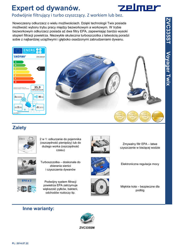 Expert od dywanów. Nowoczesny odkurzacz o wielu możliwościach. Dzięki technologii Twix posiada możliwość wyboru trybu pracy między bezworkowym a workowym. W trybie bezworkowym odkurzacz posiada aż dwa filtry EPA, zapewniając bardzo wysoki stopień filtracji powietrza. Niezwykle skuteczna turboszczotka z łatwością poradzi sobie z najbardziej uciążliwymi i głęboko osadzonymi zabrudzeniami dywanu. ZVC335ST Podwójnie filtrujący i turbo czyszczący. Z workiem lub bez. Voyager Twix Zalety 2 in 1 2 w 1: odkurzanie do pojemnika (oszczędność pieniędzy) lub do dużego worka (oszczędność czasu) Turboszczotka – doskonała do zbierania sierści i czyszczenia dywanów Podwójny system filtracji powietrza EPA zatrzymuje większość pyłków, bakterii, odchodów roztoczy itp. Elektroniczna regulacja mocy Miękkie koła – bezpieczne dla podłóg Inne warianty: ZVC335SM PL: 2014.07.22 Zmywalny filtr EPA – łatwe czyszczenie w bieżącej wodzie ZVC335ST Voyager Twix Specyfikacja techniczna klasa efektywności energetycznej klasa skuteczności zbierania kurzu z dywanu klasa skuteczności zbierania kurzu z twardej podłogi klasa reemisji kurzu poziom hałasu [dB] moc nominalna [W] zużycie energii [kWh/rok] waga netto (bez akcesoriów) [kg] wymiary (szerokość / głębokość / wysokość) [cm] okres gwarancji [miesiące] C D B A 80 1000 35,9 5,3 24 / 32 / 43 24 Cechy rodzaj filtra zasięg pracy [m] miękkie gumowe kółka funkcja autostart wskaźnik wymiany worka pojemność worka / pojemnika [l] rodzaj pojemnika na kurz kolor regulacja mocy EAN 2 x EPA E10 zmywalny 9 + + 3,5 / 1,5 zbiornik cyklonowy / Safbag ZVCA100B niebieski granatowy elektroniczna 5 900 215 024 349 Akcesoria w zestawie: Pojemnik oraz worek na kurz typu Safbag Metalowa rura teleskopowa Dwa zmywalne filtry EPA Szczotka przełączalna Zestaw dodatkowych szczotek i ssawek Turboszczotka do czyszczenia dywanów Wąż CBS Możliwość zastosowania: Turboszczotki ZVCA90T Szczotki do parkietów ZVCA80P Elektroszczotki ZVCA94Q + + -