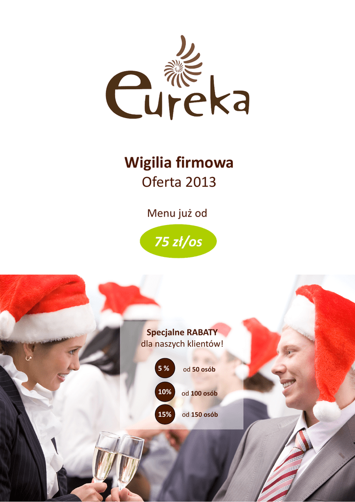 Wigilia firmowa Oferta 2013 Menu już od 75 zł/os Specjalne RABATY dla naszych klientów! 5% od 50 osób 10% od 100 osób 15% od 150 osób WIGILIA 2013 Propozycja I 75 zł/os Wigilia we wskazanym miejscu lub w restauracji Eureka Bufet szwedzki Na ciepło… Barszcz czerwony z uszkami Pierogi z kapustą i grzybami Dzwonki karpia smażone na maśle Ziemniaki z koprem Na zimno… Sola w złotym cieście Sałatka śledziowa z majonezem Tymbaliki rybne z marchewką i koperkiem Śledź w oliwie z natką i szalotką Placuszki z cukinii z musem koperkowym i wędzonym łososiem Pieczywo Na słodko… Ciastka piernikowe z bakaliami Sernik na kruchym spodzie Napoje... Kawa, herbata Woda, soki Cena dotyczy poczęstunku powyżej 20 osób. W cenę wliczono poczęstunek na bufecie szwedzkim z obrusem, dekoracją nawiązującą do symboliki świąt, pełną zastawę, transport na terenie Gdyni i okolic oraz obsługę do przygotowania stołów. Na Państwa życzenie skomponujemy indywidualne menu. WIGILIA 2013 Propozycja II 90 zł/os Wigilia we wskazanym miejscu lub w restauracji Eureka Bufet szwedzki Na ciepło… Barszcz czerwony z uszkami Pierogi mieszane ruskie i z kapustą i grzybami Łosoś w sosie cytrynowo-maślanym Puree ziemniaczano-marchewkowe Kapusta wigilijna z grzybami Na zimno… Dorsz po grecku w jarzynach duszonych w pomidorach Tartaletki z łososiem w szpinaku Łosoś z warzywami w ziołach zapiekany w cieście francuskim Tymbaliki rybne z marchewką i koperkiem Śledź pod pierzynka z cebulą i tartymi jabłkami Sałatka jarzynowa tradycyjna w majonezie Pieczywo Na słodko… Ciasto kruche ze śliwkami Seromakowiec Ciasteczka piernikowe Napoje… Kawa, herbata Woda, soki Cena dotyczy poczęstunku powyżej 20 osób. W cenę wliczono poczęstunek na bufecie szwedzkim z obrusem, dekoracją nawiązującą do symboliki świąt, pełną zastawę, transport na terenie Gdyni i okolic oraz obsługę do przygotowania stołów. Na Państwa życzenie skomponujemy indywidualne menu. WIGILIA 2013 Propozycja III 110 zł/os Wigilia we wskazanym miejscu lub w restauracji Eureka Bufet szwedzki Na ciepło… Wyborna grzybowa z kluseczkami Zupa rybna z pulpecikami rybnymi Łosoś pieczony w całości a do tego dipy Dzwonki karpia w sosie borowikowym Ziemniaki z koprem Buraczki zasmażane Na zimno… Łosoś w Pinot Grigio Tarta z ryb wędzonych i morskich Kulebiak z kapustą i grzybami Roladki z białych ryb morskich z kawałkami łososia Śledź w pierniku Śledź w kremie z tartego chrzanu Kompozycja sałat z marynowanym łososiem Brokuły z prażonymi migdałami Na słodko… Piernik z konfiturą owocową polany czekoladą Makowiec z bakaliami Ciasto kakaowe polane czekoladą Sernik z karmelem i orzechami Napoje… Kompot z suszonych owoców Kawa, herbata Woda, soki Cena dotyczy poczęstunku powyżej 20 osób. W cenę wliczono poczęstunek na bufecie szwedzkim z obrusem, dekoracją nawiązującą do symboliki świąt, pełną zastawę, transport na terenie Gdyni i okolic oraz obsługę do przygotowania stołów. Na Państwa życzenie skomponujemy indywidualne menu. Przedstawiona oferta dotyczy grup od 20 osób i stanowi jedynie propozycję. Na Państwa życzenie skomponujemy indywidualne menu. W zależności od preferencji oferta może zawierać dania mięsne. Kontakt: Restauracja Eureka Al. Zwycięstwa 96/98 81- 451 Gdynia tel. 58 698 21 11 e-mail: [email protected] www.eureka-restauracja.pl