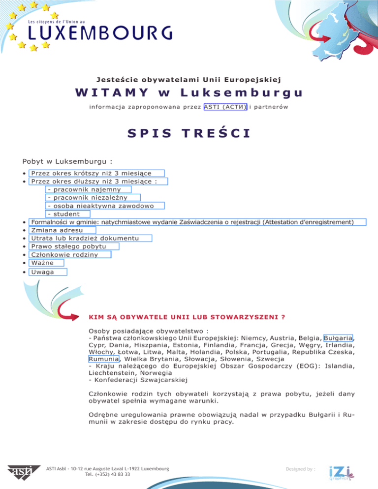 Les citoyens de l'Union au Jesteście obyw a t e l a m i U n i i E u r op e j s k i e j WITAMY w Luksemburgu i n f o r m a c j a z a p r o p o n owana przez ASTI (АСТИ ) i partnerów SPIS TREŚCI Pobyt w Luksemburgu : • Przez okres krótszy niż 3 miesiące • Przez okres dłuższy niż 3 miesiące : - pracownik najemny - pracownik niezależny - osoba nieaktywna zawodowo - student • Formalności w gminie: natychmiastowe wydanie Zaświadczenia o rejestracji (Attestation d’enregistrement) • Zmiana adresu • Utrata lub kradzież dokumentu • Prawo stałego pobytu • Członkowie rodziny • Ważne • Uwaga KIM SĄ OBYWATELE UNII LUB STOWARZYSZENI ? Osoby posiadające obywatelstwo : - Państwa członkowskiego Unii Europejskiej: Niemcy, Austria, Belgia, Bułgaria, Cypr, Dania, Hiszpania, Estonia, Finlandia, Francja, Grecja, Węgry, Irlandia, Włochy, Łotwa, Litwa, Malta, Holandia, Polska, Portugalia, Republika Czeska, Rumunia, Wielka Brytania, Słowacja, Słowenia, Szwecja - Kraju należącego do Europejskiej Obszar Gospodarczy (EOG): Islandia, Liechtenstein, Norwegia - Konfederacji Szwajcarskiej Członkowie rodzin tych obywateli korzystają z prawa pobytu, jeżeli dany obywatel spełnia wymagane warunki. Odrębne uregulowania prawne obowiązują nadal w przypadku Bułgarii i Rumunii w zakresie dostępu do rynku pracy. ASTI Asbl - 10-12 rue Auguste Laval L-1922 Luxembourg Tel. (+352) 43 83 33 Designed by : Les citoyens de l'Union au Pobyt krótszy niż 3 miesiące Pobytu do trzech miesięcy nie trzeba nigdzie zgłaszać. Wystarczy posiadać ważny doku ment tożsamości (paszport lub dowód osobisty). Pobyt dłuższy niż 3 miesiące W takim wypadku należy w ciągu 3 miesięcy od przyjazdu zameldować się w gminie zamieszkania, aby otrzymać zaświadczenie o rejestracji. Wymagane dokumenty : - paszport lub krajowy dowód tożsamości a także dokumenty: - potwierdzające status pracownika najemnego lub niezależnego; - zaświadczające o dysponowaniu dostatecznymi środkami na utrzymanie siebie i rodziny w przypadku osoby nieaktywnej zawodowo; - potwierdzające status studenta. Zaświadczenie o rejestracji Jeżeli dokumenty są kompletne gmina miejsca zamieszkania wydaje natychmiast zaświadczenie o rejestracji. Dokument ten wystawiany jest na czas nieokreślony. Jest bezpłatny. Jest odtąd jedynym dokumentem potwierdzającym legalny pobyt w Luksemburgu. Nie posiada jednak wartości dokumentu tożsamości. Pracownicy najemni Wymagane dokumenty : Osoba zatrudniona na etacie musi dostarczyć umowę o pracę (z datą zawarcia i podpisaną przez obie strony) lub promesę zatrudnienia, przekazaną przez pracodawcę (z datą i podpisem przyszłego pracodawcy). Przypomnienie: obywatele Bułgarii i Rumunii powinni ponadto przedłożyć pozwolenie na pracę. ASTI Asbl - 10-12 rue Auguste Laval L-1922 Luxembourg Tel. (+352) 43 83 33 Designed by : Les citoyens de l'Union au Pracownik najemny to osoba wykonująca działalność gospodarczą odpłatną na rzecz innej osoby. Działalność ta powinna być realna i efektywna z wykluczeniem działalności o tak ograniczonym zakresie czasowym, że uznawana jest za marginalną lub dodatkową (np. praca przez mniej niż 10 godzin na tydzień). Promesa zatrudnienia to dokument, na mocy którego pracodawca zobowiązuje się zawrzeć umowę o pracę z kandydatem, jeżeli ten się zgadza. Aby była prawomocna, musi zawierać rodzaj wykonywanego świadczenia, datę zatrudnienia, czas trwania zobowiązania oraz wysokość wynagrodzenia. Pracownicy niezależni Wymagane dokumenty: Zaświadczenie o prowadzeniu niezależnej działalności Na przykład : zezwolenie na osiedlenie się, zezwolenie na prowadzenie działalności w przypadku gdy wymagane są pozwolenia, w danym wypadku pismo z Ministerstwa Klas średnich stwierdzające, że dla danej działalności pozwolenie nie jest wymagane, uprawnienia do wykonywania zawodu reglamentowanego (lekarz, terapeuta, adwokat, ...). Osoby nieaktywne zawodowo Wymagane dokumenty: - zaświadczenia o wystarczających środkach na utrzymanie, żeby nie stać się obciążeniem dla systemu pomocy społecznej, wysokość powinna odpowiadać minimum RMG. Na przykład :emerytura lub renta inwalidzka, zaświadczenie bankowe, zobowiązania opiekuńcze, wynagrodzenia lub świadczenia pobierane w innym kraju. - włączenie do systemu ubezpieczenia chorobowego. Studenci lub stażyści nie otrzymujący wynagrodzenia Wymagane dokumenty: - potwierdzenie zapisu na uczelnię państwową lub autoryzowaną w Luksemburgu uczelnię prywatną. - w przypadku studenta zaświadczenie dysponowaniu wystarczającymi środkami na utrzymanie. - włączenie do systemu ubezpieczenia chorobowego. ASTI Asbl - 10-12 rue Auguste Laval L-1922 Luxembourg Tel. (+352) 43 83 33 Designed by : Les citoyens de l'Union au Zmiana miejsca zamieszkania ... ... na obszarze Wielkiego Księstwa Luksemburga: w ciągu ośmiu dniu od przybycia zgłosić się z zaświadczeniem do «nowej» gminy, Jeżeli w wyniku wielokrotnej zmiany adresu na zaświadczeniu nie ma już wolnego miejsca, wystawiony zostanie nowy dokument z zaznaczoną datą wydania pierwszego zaświadczenia o rejestracji. Kopia przekazywana jest do ministerstwa. Utrata lub kradzież zaświadczenia o rejestracji Należy zgłosić ten fakt na policji i poprosić ministerstwo na piśmie o nowy dokument. Ministère des Affaires étrangères et de L’Immigration Direction de l’Immigration Service des Etrangers 12-16 avenue Monterey L - 2017 Luxembourg Na nowym zaświadczeniu widnieć będzie data wydania pierwszego dokumentu rejestracji. Ministerstwo informuje gminę o wydaniu nowego zaświadczenia. Prawo stałego pobytu Po 5 latach nieprzerwanego legalnego pobytu i przed upływem okresu 5 lat można uzyskać prawo stałego pobytu pod następującymi warunkami: - otrzymywanie emerytury lub renty inwalidzkiej albo korzystanie z przywilejów przejścia na wcześniejszą emeryturę, - w przypadku mieszkania