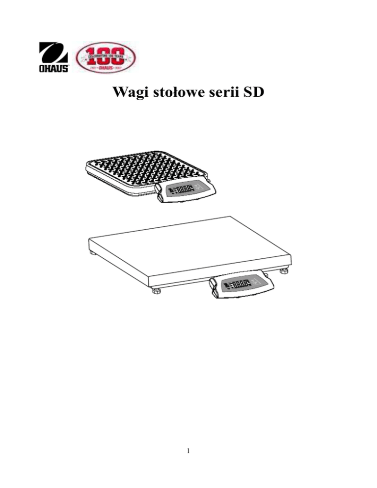 Wagi stołowe serii SD 1 Produkt spełnia wymagania dyrektywy dotyczącej zgodności elektromagnetycznej nr 89/3336/EEC i dyrektywy dla urządzeń niskonapięciowych nr 73/23/EEC. Kompletna deklaracja zgodności jest dostępna w firmie Ohaus. Utylizacja zuŜytego sprzętu Zgodnie z Dyrektywą Europejską nr 2002/96/ EC dotyczącą utylizacji zuŜytego sprzętu elektrycznego i elektronicznego (WEEE) urządzenie nie moŜe być wyrzucone do ogólnodostępnego śmietnika. Dotyczy to takŜe państw spoza UE z uwzględnieniem obowiązujących w nich przepisów. Prosimy o przekazywanie zuŜytego sprzętu zgodnie z lokalnymi przepisami do punktów zbierających zuŜyty sprzęt elektryczny i elektroniczny. W przypadku jakichkolwiek pytań prosimy o kontakt z dystrybutorem urządzenia. JeŜeli urządzenie ma zostać przekazane do uŜytku w innej branŜy (np. do uŜytku domowego lub profesjonalnego), powyŜszy zapis takŜe zachowuje waŜność. Dziękujemy za Twój wkład w ochronę środowiska. Uwaga: Niniejsze urządzenie zostało sprawdzone i spełnia ograniczenia stawiane urządzeniom cyfrowym klasy B, wypełniając zapis punktu 15 przepisów FCC. Ograniczenia te zostały opracowane w celu ochrony przed wpływami szkodliwymi w sytuacji, gdy sprzęt jest eksploatowany w środowisku komercyjnym. Niniejsze urządzenie generuje, wykorzystuje i moŜe emitować energię o częstotliwościach radiowych, oraz jeŜeli nie jest zainstalowane i wykorzystywane zgodnie z instrukcją obsługi, moŜe mieć szkodliwy wpływ na komunikację radiową. Nie ma gwarancji, Ŝe zakłócenia nie wystąpią w niektórych instalacjach. JeŜeli urządzenie ma szkodliwy wpływ na odbiór audycji radiowych lub telewizyjnych, co moŜna ustalić przez wyłączenie i ponowne włączenie urządzenia, uŜytkownik jest zobowiązany do usunięcia zakłóceń poprzez podjęcie jednego lub kilku z niŜej opisanych działań: Zmienić kierunek lub przenieść antenę odbiorczą; Zwiększyć odległość między sprzętem i odbiornikiem; Podłączyć sprzęt do fazy innej niŜ ta, do której jest podłączony odbiornik radiowy lub telewizyjny; Poprosić o pomoc dostawcę urządzenia lub techników RTV. Rejestracja ISO 9001 W 1994 r. Korporacja Ohaus w USA uzyskała certyfikat ISO 9001 z Bureau Veritus Quality International (BVQI) potwierdzający, Ŝe system zarządzania jakością firmy Ohaus jest zgodny z wymaganiami normy ISO 9001. 15 maja 2003 r Korporacja Ohaus USA otrzymała certyfikat ISO 9001: 2000. 2 Wagi stołowe serii SD firmy Ohaus INSTRUKCJA OBSŁUGI Zawartość niniejszej instrukcji obsługi dotyczy wszystkich modeli wag stołowych serii SD. OdwaŜniki kalibracyjne nie są dostarczane z urządzeniem. W celu uzyskania jak najlepszych wyników naleŜy uŜywać urządzenia w zakresie temperatur wskazanym w niniejszej instrukcji. W celu uzyskania jak najlepszej dokładności naleŜy dokonywać pomiarów w czystym otoczeniu, z dala od pól elektrostatycznych i magnetycznych, kurzu i zabrudzeń oraz unikać drgań i ruchów powietrza. Z wagami serii SD naleŜy się obchodzić z naleŜytą dbałością i delikatnie umieszczać produkty, które mają być waŜone w centralnym punkcie platformy waŜącej. Dbałość o urządzenie pozwoli na przedłuŜenie jego Ŝywotności. 3 Wstęp Niniejsza instrukcja obsługi opisuje zasady uŜytkowania wag stołowych serii SD firmy Ohaus. Rozpakowanie Wagi serii SD są dostarczane z następującym wyposaŜeniem: Panelem wskaźnikowym Platformą waŜącą Wspornikami montaŜowymi Zasilaczem sieciowym Instrukcją obsługi Kartą gwarancyjną Poziomowanie platformy Przed rozpoczęciem pracy platforma waŜąca powinna być ustawiona na poziomej, stabilnej powierzchni. Modele SD75L i SD200L są wyposaŜone w nóŜki regulowane. W celu wypoziomowania platformy naleŜy odpowiednio wyregulować cztery nóŜki platformy. Rodzaje zasilania Zasilanie przy pomocy zasilacza sieciowego Zasilacz sieciowy (dostarczany z urządzeniem) moŜe być wykorzystywany do zasilania wagi, gdy nie jest dostępne zasilanie z baterii. Sprawdzić, czy napięcie zasilacza sieciowego jest zgodne z napięciem lokalnej sieci zasilającej. Podłączyć okrągłą wtyczkę zasilacza do gniazdka umieszczonego z boku panelu wskaźnikowego (patrz rysunek 1). Podłączyć zasilacz do gniazda sieciowego. Rysunek 1. Podłączenie wtyczki zasilacza do panelu wskaźnikowego. 4 Wkładanie baterii (opcja) Otworzyć pokrywę przedziału baterii umieszczoną w dolnej części panelu wskaźnikowego i włoŜyć trzy baterie alkaliczne rozmiaru "C" (LR 14). Baterie włoŜyć zgodnie z oznaczeniem biegunowości wskazanym na wewnętrznej części obudowy. Zamknąć pokrywę przedziału baterii. Uwaga: Baterie nie są dostarczane z urządzeniem. Rysunek 2. Wkładanie baterii. UWAGA: ZuŜytych baterii nie wolno wyrzucać do ogólnodostępnych śmietników. NaleŜy przestrzegać odpowiednich przepisów dotyczących składowania i recyclingu obowiązujących w danym kraju. Sposoby montaŜu i ustawienia panelu wskaźnikowego Ustawienie na stole Panel wskaźnikowy moŜe być ustawiony na poziomej powierzchni stołu bez potrzeby uŜywania dodatkowych elementów montaŜowych. Cztery gumowe nóŜki zapobiegają ślizganiu się panelu na większości powierzchni. Bezpośredni montaŜ na ścianie Panel wskaźnikowy moŜe być zamontowany bezpośrednio na ścianie przy pomocy dwóch wkrętów (nie są dostarczane z urządzeniem). NaleŜy wybrać wkręty odpowiedniej wielkości, które pasują do otworów umieszczonych w dolnej części obudowy panelu wskaźnikowego. Patrz - rysunek 3. Przy montaŜu na ścianie bez tynku naleŜy uŜyć odpowiednich elementów dystansowych. 5 Rysunek 3. Bezpośredni montaŜ panelu wskaźnikowego na ścianie. MontaŜ na ścianie z uŜyciem wsporników / montaŜ na stole Zamontować dwa wsporniki montaŜowe zgodnie z rysunkiem 4. Ustawić panel wskaźnikowy zgodnie z Ŝyczeniem na stole lub na ścianie. Przykręcić dwa wkręty