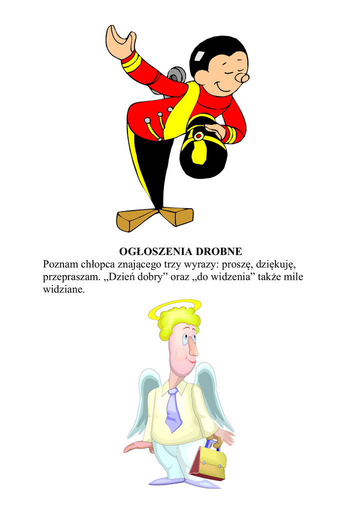 OGŁOSZENIA DROBNE Poznam chłopca znającego trzy wyrazy: proszę, dziękuję, przepraszam. „Dzień dobry” oraz „do widzenia” także mile widziane. ADA, TO NIE WYPADA CZYLI ALFABET DOBRYCH MANIER DLA NASTOLATKA Arogancja – okazywana słowami, minami, gestami wobec dorosłych jest nie do wybaczenia Bekanie – albo też czkanie, traktowane przez niekulturalnych młodzieńców za „wspaniały” dowcip, a będące wyłącznie kompromitującym dowodem chamstwa Cześć – nie żałujmy tego słowa (bardziej czule może być: pa, buźka, hej) Czułość – w miejscach publicznych trzeba zachować umiar w tym względzie i pamiętać, że patrzą na nas inni Decybele – wrzaski, krzyki i głośna muzyka, unikajmy tego (cichego głosu słucha się uważniej i jest on cieplejszy) Do widzenia – elementarny wyraz kultury Drzwi – przepuszczamy wychodzących, zawsze pozwalamy wejść najpierw kobietom, dziewczętom i starszym Dyskrecja – umiejętność zachowania tajemnicy, nie powtarzamy osobom postronnym powierzonych nam sekretów Dzień dobry – obowiązkowo mówić, mówić, mówić, nigdy nie zaszkodzi, nic nie kosztuje Dziękuję – używać przy każdej sposobności (patrz: dzień dobry) Elegancja – to styl bycia i ubierania się, polega na „dyskretnym uroku” Fair play – szlachetna gra, w życiu codziennym polegająca na tym, żeby nie oszukiwać, nie wygrywać cudzym kosztem, nie wykorzystywać swojej przewagi Filiżanka – trzymamy za ucho wszystkimi palcami Gafa – zachowanie nietaktowne, raczej nie zamierzone, wynikające z nieuwagi, niewiedzy czy roztargnienia, gdy się zdarzy, nie wpadajmy w panikę i szybko przeprośmy Goście – wypada zapytać rodziców, czy mogą przyjść, przyzwoitość nakazuje również po zabawie doprowadzić mieszkanie do stanu poprzedniego Grzechy szkolne – zwalenie na kogoś swojej winy, skarżenie, podlizywanie się, przezywanie kolegów, wyśmiewanie lub przedrzeźnianie nauczyciela Herbata “maczanka” – wyciągamy za „ogon”, wyciskamy łyżeczką i odkładamy na specjalny talerzyk Higiena – obowiązuje codzienne mycie się od stóp do głów. Uwaga! Polewanie brudu wodą kolońską daje efekty żałosne. Imieniny – nie zapominajmy solenizantom złożyć życzeń Jedzenie – mlaskanie, siorbanie, cmokanie, czyli jedzenie głośne i niechlujne bardzo kompromitujące! Kłanianie się – młodsi kłaniają się starszym, uczniowie nauczycielom i innym pracownikom szkoły, chłopcy dziewczętom (reguła: uprzejmiejszy kłania się pierwszy) Książki – pożyczone oddajemy we właściwym terminie! Listy – cudza korespondencja to rzecz święta, nie do wybaczenia jest otwieranie i czytanie cudzych listów Lojalność - to bardzo rzadka, a bardzo ważna cecha charakteru. Należy być lojalnym wobec rodziny i przyjaciół. Łyżeczka – zawsze wyjmujemy ze szklanki, gdy pijemy herbatę (w przeciwnym wypadku grozi wybiciem oka!) Mowa sztućców – po skończonym posiłku odkładamy sztućce na talerzu równolegle do siebie po prawej stronie Niepunktualność – ten, kto się spóźnia, zraża do siebie ludzi, jeszcze zanim ich zobaczy Obgryzanie paznokci – unikajmy, zwłaszcza w towarzystwie Obrażanie się – dąsanie o byle co, „muchy w nosie” to mało elegancki (a przy tym nudny!) sposób załatwiania swoich porachunków Odpowiedzialność za swoje czyny – gotowość do przyznania się do swoich błędów Odprowadzanie do domu – chłopiec odprowadza swoją dziewczynę, koleżankę do domu, jest to zarazem obowiązek, jak i przyjemność Pierwszeństwo – w drzwiach, na schodach, przy częstowaniu ma dziewczyna, kobieta, osoba starsza Plotka - jest w bardzo złym tonie. Świadczy o osobie, która plotkuje, że jest pusta i nie ma nic do powiedzenia na inne tematy. Takiej osobie nie należy ufać. Plucie – czynność szczeniacka i obrzydliwa Podawanie ręki – pierwsza podaje rękę osoba ważniejsza: starsza młodszej, dziewczyna chłopcu Podrywanie – nie ma nic zdrożnego w podrywaniu, byle było to zręczne, dowcipne, kulturalne i miłe dla obu stron Pomoc – nigdy nie odmawiamy pomocy potrzebującemu czy przyjacielowi, obowiązuje wzajemna troskliwość, czynimy to taktownie i serdecznie, nie wypominamy nikomu, co dla niego uczyniliśmy Prezent – jest wyrazem uczuć do obdarowywanej osoby, liczy się pomysł, dowcip, oryginalność (a nie cena!). Powinien być ładnie opakowany. Uwaga! Na prezenty nie nadają się rzeczy używane. Proszę – oznacza nie tylko prośbę, używamy również, gdy przepuszczamy kogoś w drzwiach, podając coś, pomagając w czymś, ustępując miejsca itp. Przedstawianie kogoś – zawsze należy najpierw wymienić nazwisko osoby przedstawianej, a dopiero potem tej, której kogoś przedstawiamy (kobiecie przedstawiamy mężczyznę, starszemu młodszego, koleżance kolegę). Przepraszam – nie jest to tylko słówko dla tych, którzy czują się winni. Przepraszamy, gdy niechcący sprawiliśmy kłopot, przykrość, niewygodę. Pamiętajmy o bezpłatnym dodatku czyli uśmiechu do wszystkich grzecznościowych zwrotów. Ręce – zawsze są widoczne, więc choćby z tego powodu muszą być czyste i zadbane. Nie rozmawiamy z koleżanką, kobietą i osobą starszą trzymając je w kieszeniach. Rodzice – nie do wybaczenia jest niegrzeczne zachowanie wobec rodziców przy ludziach lub lekceważące wyrażanie się o nich przy kolegach Rozmowa – nie wpadamy nikomu w słowo, nie mówimy jednocześnie, nie przerywamy, nie szeptamy na ucho Serwetka – papierowa służy do wycierania ust i palców Śmiecenie – człowiek cywilizowany nie wyrzuca śmieci, gdzie popadnie Taneczny bon-ton – chłopiec zaprasza dziewczynę do tańca, po tańcu odprowadza na miejsce i dziękuje za taniec Telefon – dzwoniąc do kogoś witamy się i zawsze przedstawiamy, nie telefonujemy po godzinie 22.00 Ubiór szkolny – żadnych wyzywających rzeczy i błyszczących ozdób, nie 