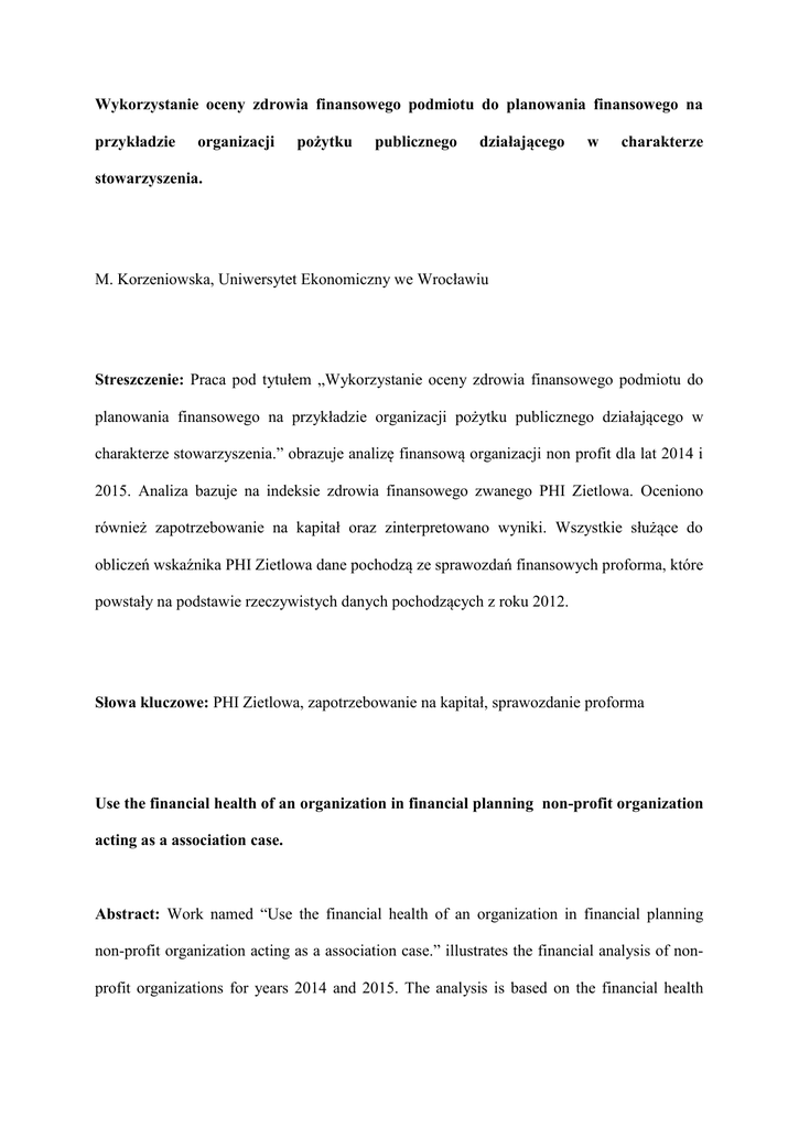 Wykorzystanie oceny zdrowia finansowego podmiotu do planowania finansowego na przykładzie organizacji pożytku publicznego działającego w charakterze stowarzyszenia. M. Korzeniowska, Uniwersytet Ekonomiczny we Wrocławiu Streszczenie: Praca pod tytułem „Wykorzystanie oceny zdrowia finansowego podmiotu do planowania finansowego na przykładzie organizacji pożytku publicznego działającego w charakterze stowarzyszenia.” obrazuje analizę finansową organizacji non profit dla lat 2014 i 2015. Analiza bazuje na indeksie zdrowia finansowego zwanego PHI Zietlowa. Oceniono również zapotrzebowanie na kapitał oraz zinterpretowano wyniki. Wszystkie służące do obliczeń wskaźnika PHI Zietlowa dane pochodzą ze sprawozdań finansowych proforma, które powstały na podstawie rzeczywistych danych pochodzących z roku 2012. Słowa kluczowe: PHI Zietlowa, zapotrzebowanie na kapitał, sprawozdanie proforma Use the financial health of an organization in financial planning non-profit organization acting as a association case. Abstract: Work named “Use the financial health of an organization in financial planning non-profit organization acting as a association case.” illustrates the financial analysis of nonprofit organizations for years 2014 and 2015. The analysis is based on the financial health index called Zietlow PHI. Also assessed the need for capital, and interpreted the results. All used for index calculation Zietlow PHI data comes from a pro-forma financial statements, which are based on actual data from 2012. Key words: Zietlow PHI, the demand of capital, report pro-forma JEL: D92, L29,L31,M21 Recenzent 1 D. Placek https://eportal.ue.wroc.pl/blog/index.php?entryid=253 Recenzent 2 C. Perzyna http://figshare.com/articles/recenzja_2_pdf/979289 Wstęp W obecnych czasach rozległa wiedza z działu ekonomii daje możliwość pojawiania się rozlicznych modeli i wskaźników ekonomicznych, które pomagają ocenić jak wygląda kondycja finansowa podmiotów gospodarczych. Zdobyta w ten sposób wiedza służy do planowania finansowego w jednostkach. Pozytywne oddziaływanie badań wskaźników ekonomicznych powoduje osiąganie stabilnego rozwoju. PHI Zietlowa uznawany jest za jeden z najbardziej cenionych i najczęściej wykorzystywanych wskaźników ekonomicznych. Inaczej nazywany również FHI Zietlowa jest wskaźnikiem określającym zdrowie finansowe jednostki. Gdy wskaźnik ten osiąga zbyt niskie lub zbyt wysokie wartości, jest to sygnał o występowaniu określonych zjawisk w jednostce. PHI Zietlowa został stworzony aby badać organizacje non profit, dlatego też w raporcie tym do badania wybrano jednostkę działającą w obszarze organizacji pożytku publicznego w charakterze stowarzyszenia1. Aby móc obliczyć wskaźnik PHI Zietlowa dla danych z 2014 i 2015 r. należy skorzystać z możliwości sporządzenia sprawozdań finansowych pro-forma2 dla tych okresów dla badanej jednostki. Jednym z założeń przy tworzeniu tych sprawozdań był coroczny wzrost przychodów w organizacji non profit. Według danych roku 20123 w porównaniu do roku 20114 było to 5%. Wynika to z faktu, iż co roku zauważa się wzrost wielkości funduszy przekazywanych organizacjom pożytku publicznego, w tym także stowarzyszeniom. Ma to miejsce dzięki programowi „ 1% podatku dochodowego”. Ponadto dla lat 2014 i 2015 przewidywany jest przez Komisję Europejską wzrost gospodarczy Polski5. Wskaźnik zdrowia finansowego PHI Zietlowa obliczany jest według następującego wzoru: Równanie 1 PHI Zietlowa Φ (wartość indeksu zdrowia finansowego) = (0,10 x kategorie ogólne) + (0,40 x kategorie natychmiastowe) + (0,30 x kategorie krótkoterminowe) + (0,20 x kategorie średnioterminowe) źródło: Zietlow J., A Financial Health Index for Achieving Nonprofit Financial Sustainability 1 http://www.mpips.gov.pl/bip/wykaz-organizacji-pozytku-publicznego/#akapit1 Pluta Wiesław, Planowanie finansowe w przedsiębiorstwie, strona 143 3 http://www.jedenprocentpodatku.pl/index.php?p=statystyki&a=1proc_2012 4 http://www.jedenprocentpodatku.pl/index.php?p=statystyki&a=1proc_2011 5 http://wyborcza.biz/biznes/1,101562,14896558,Bruksela_prognozuje_w_Polsce_wzrost_PKB_o_2_3_proc_.ht ml 2 Indeks ten pozwala na zidentyfikowanie słabych i mocnych stron jednostki. Jego wartość zależy od czterech kategorii: ogólnej, natychmiastowej, krótkoterminowej i średnioterminowej. Zaś do tych kategorii należy piętnaście wskaźników oraz odpowiednie wagi. Kategoria ogólna jest pierwszą z badanych kategorii i składa się z trzech składników: 1. Wskaźnik logarytmu naturalnego wieku 2. Wskaźnik logarytmu naturalnego rozmiaru 3. Wskaźnik niestabilności aktywów Pierwszy wskaźnik powinien osiągać jak najwyższe wartości, ponieważ im badana jednostka ma większe doświadczenie tym lepszą ma pozycję na rynku. W przypadku drugiego wskaźnika osiągane wartości również powinny być jak największe, a informuje on o poziomie stabilności i elastyczności finansowej jednostki. Trzeci wskaźnik, zwany wskaźnikiem niestabilności aktywów, jest miarą elastyczności finansowej jednostki. Dla badanej fundacji wskaźniki kategorii ogólnych wyniosły: Tabela 1 Kategorie ogólne Kategorie ogólne ln wieku ln rozmiaru indeks niestabilności aktywów podsumowanie 2014 2015 1,39 1,61 10,52 10,53 369,21 71,45 5,200433029 5,485438682 Na podstawie uzyskanych wyników można stwierdzić, iż jednostka ta będzie się rozwijać w nieznacznym stopniu, ale za to sukcesywnie. Jedynie wskaźnik niestabilności aktywów ulega drastycznym wahaniom i zmniejszeniu co nie jest dobrym znakiem dla sytuacji podmiotu. Kolejną z kategorii, na podstawie których oblicza się wskaźnik PHI Zietlowa jest kategoria najbliższej przyszłości. Posiada ona następujące składowe: 1. Współczynnik dostatecznej rezerwy gotówkowej 2. Zmodyfikowany wskaźnik gotówki 3. Docelowa płynność Lambda6 4. Skorygowany wskaźnik płynności Współc