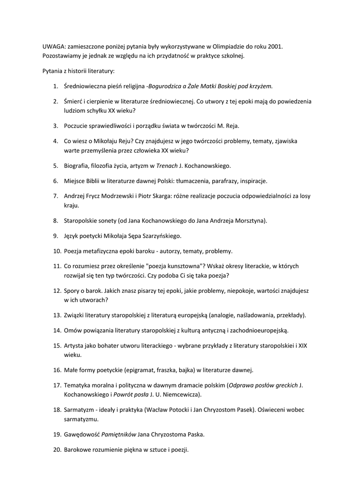 UWAGA: zamieszczone poniżej pytania były wykorzystywane w Olimpiadzie do roku 2001. Pozostawiamy je jednak ze względu na ich przydatnośd w praktyce szkolnej. Pytania z historii literatury: 1. Średniowieczna pieśo religijna -Bogurodzica a Żale Matki Boskiej pod krzyżem. 2. Śmierd i cierpienie w literaturze średniowiecznej. Co utwory z tej epoki mają do powiedzenia ludziom schyłku XX wieku? 3. Poczucie sprawiedliwości i porządku świata w twórczości M. Reja. 4. Co wiesz o Mikołaju Reju? Czy znajdujesz w jego twórczości problemy, tematy, zjawiska warte przemyślenia przez człowieka XX wieku? 5. Biografia, filozofia życia, artyzm w Trenach J. Kochanowskiego. 6. Miejsce Biblii w literaturze dawnej Polski: tłumaczenia, parafrazy, inspiracje. 7. Andrzej Frycz Modrzewski i Piotr Skarga: różne realizacje poczucia odpowiedzialności za losy kraju. 8. Staropolskie sonety (od Jana Kochanowskiego do Jana Andrzeja Morsztyna). 9. Język poetycki Mikołaja Sępa Szarzyoskiego. 10. Poezja metafizyczna epoki baroku - autorzy, tematy, problemy. 11. Co rozumiesz przez określenie "poezja kunsztowna"? Wskaż okresy literackie, w których rozwijał się ten typ twórczości. Czy podoba Ci się taka poezja? 12. Spory o barok. Jakich znasz pisarzy tej epoki, jakie problemy, niepokoje, wartości znajdujesz w ich utworach? 13. Związki literatury staropolskiej z literaturą europejską (analogie, naśladowania, przekłady). 14. Omów powiązania literatury staropolskiej z kulturą antyczną i zachodnioeuropejską. 15. Artysta jako bohater utworu literackiego - wybrane przykłady z literatury staropolskiei i XIX wieku. 16. Małe formy poetyckie (epigramat, fraszka, bajka) w literaturze dawnej. 17. Tematyka moralna i polityczna w dawnym dramacie polskim (Odprawa posłów greckich J. Kochanowskiego i Powrót posła J. U. Niemcewicza). 18. Sarmatyzm - ideały i praktyka (Wacław Potocki i Jan Chryzostom Pasek). Oświeceni wobec sarmatyzmu. 19. Gawędowośd Pamiętników Jana Chryzostoma Paska. 20. Barokowe rozumienie piękna w sztuce i poezji. 21. Jak rozumiesz termin "klasycyzm". Zanalizuj na przykładzie wybranego utworu główne cechy poetyki klasycystycznej. 22. Twoja lektura Satyr i Bajek I. Krasickiego. Jakie sprawy zainteresowały Cię w tych utworach, jakie uznałbyś za aktualne? 23. Środki poetyckiego wyrazu w liryce F. Karpioskiego i F.D. Kniaźnina. 24. Funkcje ironii w literaturze polskiej czasu Oświecenia i romantyzmu (na wybranych przykładach). 25. "Prawidła" i "swobodna imigracja" - spór o sposób i zakres poznawania świata u progu romantyzmu. 26. Ballada romantyczna jako wyraz nobilitacji ludowego świata wartości. 27. Przedstaw biografięjednego z wielkich polskich romantyków. Czy biografia ta przynosi wiedzę wyłącznie o indywidualnych losach jednego człowieka? Jaką rolępełnią w kulturze biografie wybitnych postaci? 28. Między urodą świata a udręką duszy. Świat doznao podmiotu mówiącego sonetów odeskich i Sonetów krymskich A. Mickiewicza. 29. Maria Antoniego Malczewskiego wobec wybranej powieści poetyckiej Adama Mickiewicza ( typ bohatera romantycznego, nasycenie pesymizmem, uniwersalizm problemów, realizm psychologiczny, nowatorstwo). 30. Kordian Juliusza Słowackiego jako głos poety w dialogu na tematy polityczne i egzystencjalne. 31. Tragizm jednostki i tragizm dziejów w Nie - Boskiej komedii Zygmunta Krasioskiego. 32. Jak w Nie - Boskiej komedii przedstawione są główne hasła Wielkiej Rewolucji Francuskiej: wolnośd, równośd, braterstwo 33. Nie - Boska komedia - Zygmunta Krasioskiego refleksja o historii. 34. Konrad i Ksiądz Piotr -dwie hierarchie wartości, dwa style działania. W jakich utworach romantyzmu odnajdujesz jeszcze antynomie pychy i pokory? 35. Dziadów cz. II i III jako wyraz jedności materialnego z duchowym, kultury ludowej z kulturą "wysoką", dobra jednostki z interesem ogółu. 36. Pan Tadeusz i Trylogia wobec sarmatyzmu. 37. Pan Tadeusz - poemat liryczny? Zwród uwagę na sytuację osoby mówiącej, aurę emocjonalną, koloryt postaci, sposób opowiadania i opisu. 38. Kto w Panu Tadeuszu opowiada o świecie szlacheckim? Jakie role pełni postad narratora w utworze? 39. Komedie Fredry wobec romantyzmu i tradycji klasycystycznyh. 40. Komedie Fredry a Pan Tadeusz: świat przedstawiony, bohaterowie liryzm. 41. Ludzie wybitni w wierszach J. Słowackiego (np. Na sprowadzenie prochów Napoleona, Pogrzeb kapitana Myznera) i C.K. Norwida (Bema pamięci żałobny - rapsod, Na zgon śp. Jana Gajewskiego). Przedstaw podobieostwa i różnice w ujęciu. 42. "Od uwielbienia do wzgardy" - rozpiętośd i barwa uczud w wybranych utworach okresu romantyzmu. 43. Kim jest poeta? Spróbuj odpowiedzied na to pytanie posługując się wierszami J. Słowackiego (np. Los mię już żaden nie może zatrwożyd..., Bo to jest wieszcza najjaśniejsza chwała...). 44. Adam Mickiewicz i Juliusz Słowacki wobec problemu niepodległości narodowej - postulany społecznej odnowy i przenikliwośd osądu. 45. Jak możliwe jest pisanie o świecie własnych przeżyd? Spróbuj omówid romantyczne środki poetyckiego wyrazu, które pozwalają uzewnętrznid i uwiarygodnidintensywne i skomplikowane życie wewnętrzne. 46. Liryka lozaoska jako punkt dojścia przemian bohatera lirycznego wierszy A. Mickiewicza. 47. Omów znane Ci przykłady romantycznej epistolografii. Porównaj kreowaną w nich rzeczywistośd z dostępną gdzie indziej wiedzą o życiu autora i epoce. 48. W jaki sposób Norwid dopełnia myślenie romantyków o sztuce i powołaniu artysty? 49. Historia, chwila obecna i wiecznośd w przemyśleniach Norwida. 50. Vade - Mecum jako cykl poetycki. Język artystyczny, problematyka, kompozycja. 51. Jakie utwory kształtowały mit powstania styczniowego? Czy znasz takie teksty, także spoza epoki, które prowadziły do demitologizacji tego wydarzenia? 52. Pozytywiści warszawscy: jak oceniasz pozycję tego ugrupowania? Co stanowiło o sile pozytywist