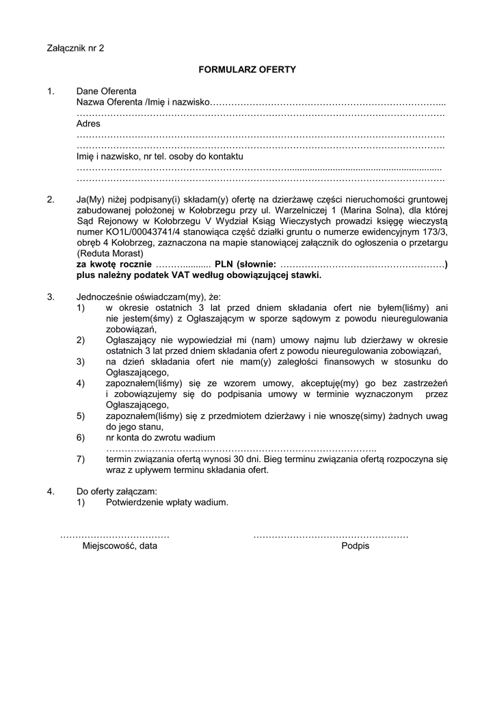 Załącznik nr 2 FORMULARZ OFERTY 1. Dane Oferenta Nazwa Oferenta /Imię i nazwisko…………………………………………………………………... …………………………………………………………………………………………………………. Adres …………………………………………………………………………………………………………. …………………………………………………………………………………………………………. Imię i nazwisko, nr tel. osoby do kontaktu ……………………………………………………………............................................................. …………………………………………………………………………………………………………. 2. Ja(My) niżej podpisany(i) składam(y) ofertę na dzierżawę części nieruchomości gruntowej zabudowanej położonej w Kołobrzegu przy ul. Warzelniczej 1 (Marina Solna), dla której Sąd Rejonowy w Kołobrzegu V Wydział Ksiąg Wieczystych prowadzi księgę wieczystą numer KO1L/00043741/4 stanowiąca część działki gruntu o numerze ewidencyjnym 173/3, obręb 4 Kołobrzeg, zaznaczona na mapie stanowiącej załącznik do ogłoszenia o przetargu (Reduta Morast) za kwotę rocznie ………........... PLN (słownie: ………………………………………………) plus należny podatek VAT według obowiązującej stawki. 3. Jednocześnie oświadczam(my), że: 1) w okresie ostatnich 3 lat przed dniem składania ofert nie byłem(liśmy) ani nie jestem(śmy) z Ogłaszającym w sporze sądowym z powodu nieuregulowania zobowiązań, 2) Ogłaszający nie wypowiedział mi (nam) umowy najmu lub dzierżawy w okresie ostatnich 3 lat przed dniem składania ofert z powodu nieuregulowania zobowiązań, 3) na dzień składania ofert nie mam(y) zaległości finansowych w stosunku do Ogłaszającego, 4) zapoznałem(liśmy) się ze wzorem umowy, akceptuję(my) go bez zastrzeżeń i zobowiązujemy się do podpisania umowy w terminie wyznaczonym przez Ogłaszającego, 5) zapoznałem(liśmy) się z przedmiotem dzierżawy i nie wnoszę(simy) żadnych uwag do jego stanu, 6) nr konta do zwrotu wadium …………………………………………………………………………….. 7) termin związania ofertą wynosi 30 dni. Bieg terminu związania ofertą rozpoczyna się wraz z upływem terminu składania ofert. 4. Do oferty załączam: 1) Potwierdzenie wpłaty wadium. ……………………………… Miejscowość, data …………………………………………… Podpis