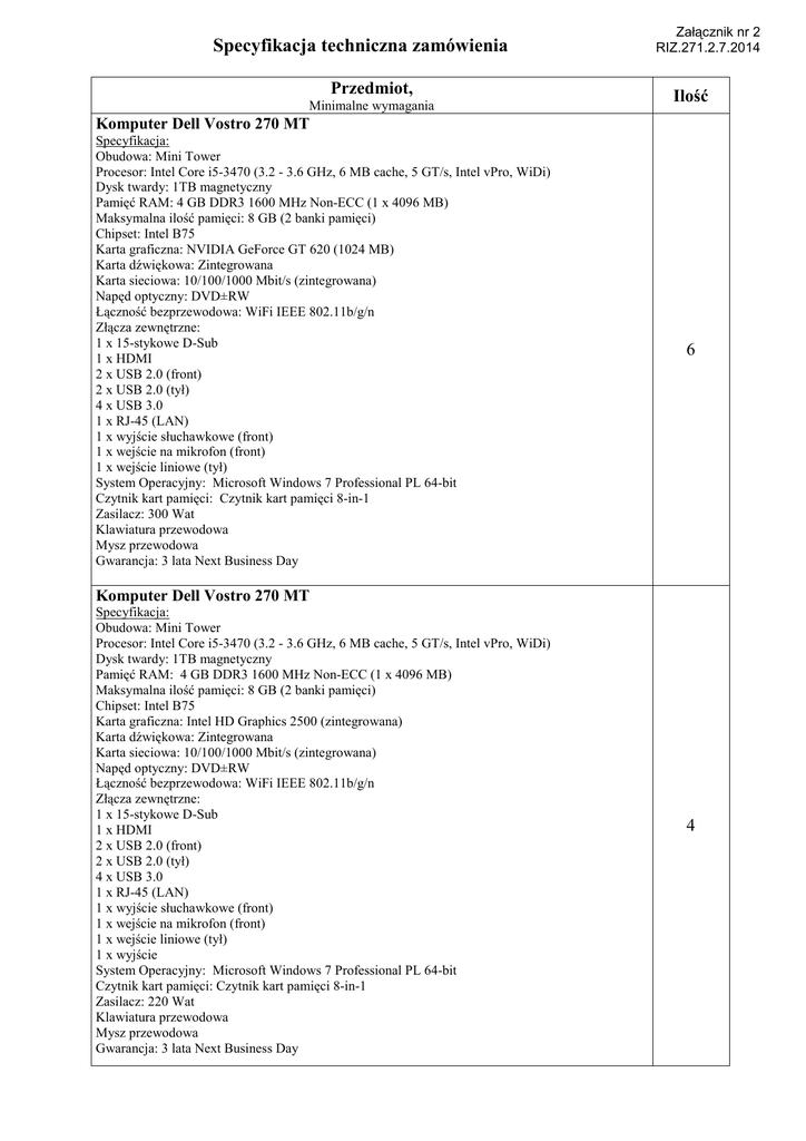 Specyfikacja techniczna zamówienia Przedmiot, Minimalne wymagania Załącznik nr 2 RIZ.271.2.7.2014 Ilość Komputer Dell Vostro 270 MT Specyfikacja: Obudowa: Mini Tower Procesor: Intel Core i5-3470 (3.2 - 3.6 GHz, 6 MB cache, 5 GT/s, Intel vPro, WiDi) Dysk twardy: 1TB magnetyczny Pamięć RAM: 4 GB DDR3 1600 MHz Non-ECC (1 x 4096 MB) Maksymalna ilość pamięci: 8 GB (2 banki pamięci) Chipset: Intel B75 Karta graficzna: NVIDIA GeForce GT 620 (1024 MB) Karta dźwiękowa: Zintegrowana Karta sieciowa: 10/100/1000 Mbit/s (zintegrowana) Napęd optyczny: DVD±RW Łączność bezprzewodowa: WiFi IEEE 802.11b/g/n Złącza zewnętrzne: 1 x 15-stykowe D-Sub 1 x HDMI 2 x USB 2.0 (front) 2 x USB 2.0 (tył) 4 x USB 3.0 1 x RJ-45 (LAN) 1 x wyjście słuchawkowe (front) 1 x wejście na mikrofon (front) 1 x wejście liniowe (tył) System Operacyjny: Microsoft Windows 7 Professional PL 64-bit Czytnik kart pamięci: Czytnik kart pamięci 8-in-1 Zasilacz: 300 Wat Klawiatura przewodowa Mysz przewodowa Gwarancja: 3 lata Next Business Day 6 Komputer Dell Vostro 270 MT Specyfikacja: Obudowa: Mini Tower Procesor: Intel Core i5-3470 (3.2 - 3.6 GHz, 6 MB cache, 5 GT/s, Intel vPro, WiDi) Dysk twardy: 1TB magnetyczny Pamięć RAM: 4 GB DDR3 1600 MHz Non-ECC (1 x 4096 MB) Maksymalna ilość pamięci: 8 GB (2 banki pamięci) Chipset: Intel B75 Karta graficzna: Intel HD Graphics 2500 (zintegrowana) Karta dźwiękowa: Zintegrowana Karta sieciowa: 10/100/1000 Mbit/s (zintegrowana) Napęd optyczny: DVD±RW Łączność bezprzewodowa: WiFi IEEE 802.11b/g/n Złącza zewnętrzne: 1 x 15-stykowe D-Sub 1 x HDMI 2 x USB 2.0 (front) 2 x USB 2.0 (tył) 4 x USB 3.0 1 x RJ-45 (LAN) 1 x wyjście słuchawkowe (front) 1 x wejście na mikrofon (front) 1 x wejście liniowe (tył) 1 x wyjście System Operacyjny: Microsoft Windows 7 Professional PL 64-bit Czytnik kart pamięci: Czytnik kart pamięci 8-in-1 Zasilacz: 220 Wat Klawiatura przewodowa Mysz przewodowa Gwarancja: 3 lata Next Business Day 4 Serwer/Macierz NAS Synology DS214+ Wraz z WD RED 3TB SATA3 6Gbps 7.2k rpm 64MB cache – 2 szt. Specyfikacja: Producent: Synology Nazwa: Synology DiskStation DS214+ Rodzaj obudowy: Box Maksymalna ilość dysków: 2 Interfejs dysków: 2x SATA 3 3.5 HDD i SSD Poziomy RAID: n.d. Interfejs sieciowy: 2x 1GbE Interfejsy zewnętrzne: 2x USB 3.0, 1x USB 2.0, 1x e SATA, 1x USBcopy Procesor: 2-Core Marvell Armada XP 1.33 GHz Pamięć RAM: 1GB DDR3 Gwarancja: 2 lata 1 Zasilacz awaryjny UPS Power Walker VFI 2000 LCD Specyfikacja: Obudowa: Tower Moc rzeczywista: 1600 Wat Moc pozorna: 2000 VA Sinus podczas pracy na baterii: Tak Porty komunikacji: RS232 (DB9)/USB Architektura: on-line Liczba gniazd wyjściowych: 8 Typ gniazda wejściowego: IEC320 C14 (10A) Maks. czas przełączenia: 0 ms Zimny start: Tak Układ AVR: Tak Gwarancja: 2 lata 1 Drukarka HP LaserJet Pro 400 M401dn Specyfikacja: technologia druku: laserowa monochromatyczna format: A4 rozdzielczość druku mono: 1200x1200 dpi automatyczny druk dwustronny: tak ethernet - druk w sieci LAN: tak standardowe rozwiązania komunikacyjne: USB 2.0, Ethernet 10/100/1000 Gwarancja: 1 rok 2 Microsoft Windows 7 Professional PL 32-bit Specyfikacja: Producent: Microsoft Wersja językowa: polska Typ licencji: Nowa licencja Wersja produktu: OEM Licencja na: 1 użytkownika Wersja bitowa: 32 bit Typ nośnika: Płyta DVD 8 Microsoft Windows 7 Professional PL 64-bit Specyfikacja: Producent: Microsoft Wersja językowa: polska Typ licencji: Nowa licencja Wersja produktu: OEM Licencja na: 1 użytkownika Wersja bitowa: 64 bit Typ nośnika: Płyta DVD 3 Microsoft Office 2013 dla Użytkowników Domowych i Małych Firm PL Specyfikacja Producent: Microsoft Wersja językowa: polska Składowe pakietu: Word - edytor tekstu Excel - arkusz kalkulacyjny PowerPoint - program do tworzenia prezentacji OneNote - organizator notatek Outlook - menedżer poczty elektronicznej oraz informacji Typ licencji: Nowa licencja Licencja na: 1 użytkownika Wersja bitowa: 32 bit/64 bit 9 Microsoft Office Word 2013 PL Specyfikacja Producent: Microsoft Wersja językowa: polska Składowe pakietu: Word - edytor tekstu Typ licencji: Nowa licencja Licencja na: 1 Użytkownik Wersja bitowa: 32 bit/64 bit 3