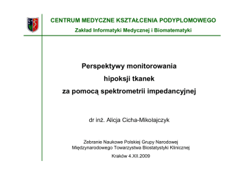 CENTRUM MEDYCZNE KSZTAŁCENIA PODYPLOMOWEGO Zakład Informatyki Medycznej i Biomatematyki Perspektywy monitorowania hipoksji tkanek za pomocą spektrometrii impedancyjnej dr inŜ. Alicja Cicha-Mikołajczyk Zebranie Naukowe Polskiej Grupy Narodowej Międzynarodowego Towarzystwa Biostatystyki Klinicznej Kraków 4.XII.2009 Hipoksja – definicja i przyczyny powstawania Hipoksja zjawisko charakteryzujące się zbyt małą podaŜą tlenu do tkanek (niedotlenienie) PodaŜ tlenu - ilość tlenu dostarczana komórkom w jednostce czasu PodaŜ O2 = Zawartość O2 we krwi tętniczej · Przepływ tkankowy Najczęstsze przyczyny niedotlenienia mięśnia serca: wrodzone wady serca, choroby układu oddechowego, choroby układu krąŜenia. Podział hipoksji w zaleŜności od przyczyny powstawania niedotlenienia: 1. hipoksemia (hipoksja hipoksemiczna) - obniŜenie pręŜności tlenu we krwi tętniczej 2. hipoksja hipokinetyczna (ischemia) - obniŜenie wielkości przepływu krwi 3. hipoksja w anemii - niewystarczające stęŜenie biologicznie czynnej hemoglobiny 4. hipoksja histotoksyczna - inaktywacja enzymów biorących udział w utlenianiu biologicznym i fosforylacji oksydacyjnej Diagnozowanie hipoksji w warunkach klinicznych Ischemia objawy kliniczne: przedmiotowe (bladość, lepki pot, spadek ciśnienia tętniczego, tachykardia lub inne zaburzenia tętna, pobudzenie ruchowe) podmiotowe (b. silny ból w klatce piersiowej, lęk przed śmiercią, duszność) elektrokardiografia oznaczanie biochemicznych markerów zawału uwalnianych do krwi pomiar stęŜenia enzymów i izoenzymów: np. troponiny cTnC, cTnI, kinazy kreatynowej CK (CK MB), mioglobiny MYO, dehydrogenazy mleczanowej LDH Hipoksemia objawy kliniczne wzrost częstości i głębokości oddychania, tachykardia oraz sinica gazometria krwi tętniczej pomiar pO2, pCO2 pomiar wysycenia hemoglobiny tlenem pomiar saturacji krwi tętniczej SaO2 oznaczanie równowagi kwasowo-zasadowej pomiar pH krwi, stęŜenia jonów wodorowęglanowych HCO-3, pomiar niedoboru bądź nadmiaru zasad Wartości referencyjne: pO2 = 65-95mmHg, pCO2 = 36-45mmHg, SaO2 = 95-99% Diagnozowanie hipoksji w warunkach klinicznych c.d. Dotychczas stosowane wskaźniki nie pozwalają na predykcję hipoksji, a po jej wystąpieniu na monitorowanie zmian związanych z niedotlenieniem, a ponadto w warunkach klinicznych ocena niedotlenienia mięśnia serca wymaga zastosowania róŜnych wskaźników – zaleŜnych od patomechanizmu jego powstawania. Zachodzi potrzeba znalezienia nowego markera hipoksji: prostego w uŜyciu, wiarygodnego i dokładnego, charakteryzującego się szybką odpowiedzią na niedotlenienie, niezaleŜnego od przyczyny powodującej hipoksję, nieinwazyjnego dla badanej tkanki. Metoda spektrometrii impedancyjnej Metoda spektrometrii impedancyjnej: pozwala na wykrywanie róŜnic pomiędzy tkankami normalnymi i patologicznymi, np. umoŜliwia wykrywanie tkanek nowotworowych, pozwala na monitorowanie stanu tkanki w sposób ciągły, była juŜ stosowana do oceny zmian w niedokrwionych narządach, ale dotychczas były to głównie badania post-mortem lub badania in-situ, (W eksperymentach in vitro przeprowadzonych na izolowanym mięśniu serca [1, 2] pomiary impedancji wykonano tylko dla jednej częstotliwości) Stan badań na dzień dzisiejszy: Brak badań impedancyjnych w warunkach krótkotrwałej ischemii, a przede wszystkim brak badań w warunkach chwilowej hipoksemii. Cel pracy: Zbadanie, opisanie i porównanie impedancji izolowanego mięśnia serca szczura perfundowanego metodą Langendorffa w warunkach prawidłowych i w warunkach indukowanej hipoksji oraz wykazanie, Ŝe monitorowanie zmian impedancji pozwala na wykrycie wystąpienia niedotlenienia mięśnia serca bez względu na patomechanizm jego powstawania. Materiał i metody - Izolowane serce szczura • Materiał badany: samce szczurów rasy Whistar (200-300g), anestezja (1000 i.u. heparyny, pentobarbital sodu 10mg/kg), torakotomia, kaniulowanie serca, umieszczenie w aparacie perfuzyjnym • Technika perfuzji metodą Langendorffa • perfuzja pod stałym ciśnieniem perfuzyjnym, • perfuzja płynem perfuzyjnym Krebsa-Henseleita o następujących właściwościach: - skład chemiczny (mM): 118,0 NaCl, 25,0 NaHC03, 4,7 KCl, 1,2 KH2PO4, 2,5 CaCl2, 1,2 MgSO4, 11,0 glukoza; - ciśnienie parcjalne tlenu w płynie K.-H.: 580-610 mmHg (nasycanie mieszaniną gazów o składzie 95%O2 + 5%CO2); Rys.1. Schemat stanowiska do pomiaru impedancji izolowanego mięśnia serca szczura perfundowanego metodą Langendorffa - kwasowość: 7,35-7,40 pH; - temperatura: 37ºC. • Ustalanie Ŝądanych warunków perfuzji warunki prawidłowe – perfuzja płynem K.–H. o pO2≈580-610 mmHg, hipoksja hipoksemiczna – perfuzja płynem K.–H. o pO2≈150-160 mmHg, hipoksja ischemiczna – zamknięcie dopływu płynu perfuzyjnego do serca Materiał i metody – Schematy układów eksperymentalnych i liczebność próby Tabela 1. Schemat układu eksperymentalnego w warunkach normoksji (Grupa 1A, n=5) i hipoksji hipoksemicznej (Grupa 2A, n=6) oraz przebieg eksperymentu (N=880) Eksperyment Faza wstępna Czas [min.] 30A 30B Normoksja 1 1 1 1 Hipoksemia 1 1 2 2 Tabela 2. Schemat układu eksperymentalnego w warunkach normoksji (Grupa 1B, n=8) i hipoksji ischemicznej (Grupa 2B, n=6) oraz przebieg eksperymentu (N=1120) Faza pomiarowa Eksperyment Faza wstępna Czas [min.] 30A 30B 1 Normoksja 1 1 1 1 1 2 Hipoksemia 1 1 3 1 1 45 t=0 t=15 t=30 t=45 Faza pomiarowa 33 t=0 Objaśnienia: A. B. 1. 2. 3. perfuzja przed wkłuciem elektrod, perfuzja po wkłuciu elektrod, perfuzja w warunkach prawidłowych (pO2=580-610mmHg), perfuzja w warunkach hipoksemii (pO2=150-160mmHg), globalna ischemia - brak dopływu płynu perfuzyjnego do serca. Punkty charakterystyczne fazy wstępnej eksperymentu, Punkty charakterystyczne fazy pomiarowej eksperymentu n – liczebność szczurów w grupie eksperymentalnej, N – liczba pomiarów w układzie eksperymentalnym t=3 t=18 t=33