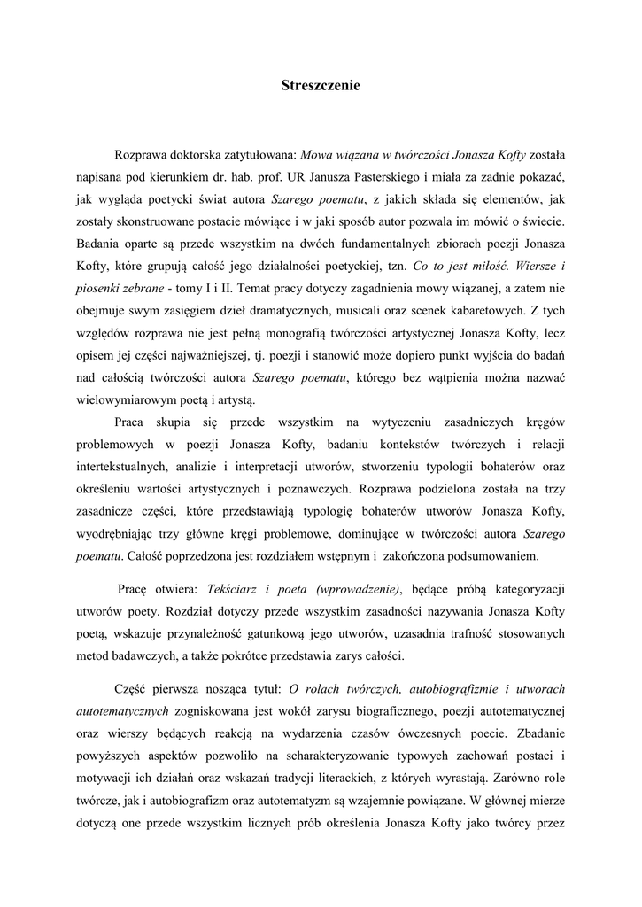 Streszczenie Rozprawa doktorska zatytułowana: Mowa wiązana w twórczości Jonasza Kofty została napisana pod kierunkiem dr. hab. prof. UR Janusza Pasterskiego i miała za zadnie pokazać, jak wygląda poetycki świat autora Szarego poematu, z jakich składa się elementów, jak zostały skonstruowane postacie mówiące i w jaki sposób autor pozwala im mówić o świecie. Badania oparte są przede wszystkim na dwóch fundamentalnych zbiorach poezji Jonasza Kofty, które grupują całość jego działalności poetyckiej, tzn. Co to jest miłość. Wiersze i piosenki zebrane - tomy I i II. Temat pracy dotyczy zagadnienia mowy wiązanej, a zatem nie obejmuje swym zasięgiem dzieł dramatycznych, musicali oraz scenek kabaretowych. Z tych względów rozprawa nie jest pełną monografią twórczości artystycznej Jonasza Kofty, lecz opisem jej części najważniejszej, tj. poezji i stanowić może dopiero punkt wyjścia do badań nad całością twórczości autora Szarego poematu, którego bez wątpienia można nazwać wielowymiarowym poetą i artystą. Praca skupia się przede wszystkim na wytyczeniu zasadniczych kręgów problemowych w poezji Jonasza Kofty, badaniu kontekstów twórczych i relacji intertekstualnych, analizie i interpretacji utworów, stworzeniu typologii bohaterów oraz określeniu wartości artystycznych i poznawczych. Rozprawa podzielona została na trzy zasadnicze części, które przedstawiają typologię bohaterów utworów Jonasza Kofty, wyodrębniając trzy główne kręgi problemowe, dominujące w twórczości autora Szarego poematu. Całość poprzedzona jest rozdziałem wstępnym i zakończona podsumowaniem. Pracę otwiera: Tekściarz i poeta (wprowadzenie), będące próbą kategoryzacji utworów poety. Rozdział dotyczy przede wszystkim zasadności nazywania Jonasza Kofty poetą, wskazuje przynależność gatunkową jego utworów, uzasadnia trafność stosowanych metod badawczych, a także pokrótce przedstawia zarys całości. Część pierwsza nosząca tytuł: O rolach twórczych, autobiografizmie i utworach autotematycznych zogniskowana jest wokół zarysu biograficznego, poezji autotematycznej oraz wierszy będących reakcją na wydarzenia czasów ówczesnych poecie. Zbadanie powyższych aspektów pozwoliło na scharakteryzowanie typowych zachowań postaci i motywacji ich działań oraz wskazań tradycji literackich, z których wyrastają. Zarówno role twórcze, jak i autobiografizm oraz autotematyzm są wzajemnie powiązane. W głównej mierze dotyczą one przede wszystkim licznych prób określenia Jonasza Kofty jako twórcy przez samego poetę. Ta próba autodefinicji stała się bowiem kluczowa dla późniejszych charakterystyk postępowań bohaterów lirycznych. Autor Samby przed rozstaniem tęskni za czasami cyganerii artystycznej i modernistycznej bohemy, jednocześnie dewaluując wartość własnej osoby jako poety. Z wyżej zaznaczoną niemożnością określenia roli twórczej wiąże się obraz samej poezji, która również ma dwojaki wymiar: lekki (teksty kabaretowe) i poważny (wiersze refleksyjne, społeczne, miłosne). Dysonans widoczny jest również w próbie odpowiedzi na pytanie: kim jest odbiorca wierszy Kofty. Poeta bowiem raz widział w nim erudytę, człowieka niszowego, by za chwilę stwierdzić, że język jego utworów przeznaczony jest dla masowej publiczności. Powyższa dwubiegunowość pojawia się zawsze wtedy, gdy Jonasz Kofta zaczyna próbować dokonać jakichś kategoryzacji. Gdy autor Szarego poematu uruchamia myślenie dyskursywne, próbując kreować się na twórcę pokroju swojego patrona Rimbauda, nie nadąża za tym jego styl poetycki, który, poprzez nagromadzenie metafor i symboli, staje się miejscami nieczytelny. Natomiast, gdy Kofta nie próbuje się definiować jako twórca, język jego wierszy, wolny od nałożonych przez samego siebie powinności, staje się odpowiednio zrytmizowany, czytelny, pełen trafnych spostrzeżeń. Na poetykę utworów mają również wpływ czasy PRL-u, w jakich żył i tworzył Jonasz Kofta. Izolacjonizm społeczny i kulturowy objawia się przede wszystkim w kreacjach bohaterów, ich melancholicznym widzeniu świata, a także w charakterystycznym wizerunku świata przedstawionego, często zbudowanym na opozycjach szarości i zieleni. Określenie wartości, którymi kierowali się bohaterowie wierszy Kofty przez pryzmat autobiografizmu, ról twórczych i autotematyzmu, pomogło odczytać ich postępowanie w kategoriach melancholii i uczuciowości oraz określić właściwe im postrzeganie świata. Rys biograficzny wydaje się więc szczególnie ważny, gdyż wiele kreacji bohaterów można uznać za porte-parole autora. Na szczególną uwagę zasługują według mnie dwie postawy: błazna i kapłana – moralizatora, za którymi swoje poglądy chowa sam autor. Jonasz Kofta, choć niekonsekwentnie, cały czas przybiera owe maski, by najpierw pouczyć czytelników, jednak już za chwilę uznać wszystko za żart. Takie zachowanie sprawia, że wiersze o tematyce społecznej czy etycznej jawią się jako nie do końca czytelne. Autor zdaje się bowiem nie mieć pewności, która z kreacji jest dla niego odpowiednia i z którą chce być utożsamiany. W części pierwszej widać narodziny postawy melancholicznej, szczegółowo opisanej w części następnej. Obawiając się zaszufladkowania, przynależności do określonej kategorii poeta ciągle balansuje między światem żartu scenicznego a twórczością moralizatorską. Wszystko to powoduje, że po raz kolejny zamazuje się granica między ironiczną krytyką poetycką a zabawą. Tego rodzaju dysonans pojawia się w całej twórczości poety i wydaje się jej cechą charakterystyczną. Część pierwsza wskazuje również na wzorce literackie i światopoglądowe artysty, co okazało się niezwykle ważne przy określaniu przestrzeni, obrazów uczucia czy też zachowań postaci mówiących. Zafascynowanie Kofty francuskimi symbol