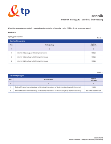 cennik Internet z usługą tv i telefonią internetową Wszystkie ceny podano w złotych z uwzględnieniem podatku od towarów i usług (VAT), o ile nie oznaczono inaczej. Rozdział 1. Opłaty jednorazowe Tabela 1 Op∏ata aktywacyjna Poz. Rodzaj us∏ugi Op∏ata koƒcowa 1 2 3 1. Internet 512 z usługą tv i telefonią internetową 168,99 2. Internet 1024 z usługą tv i telefonią internetową 168,99 3. Internet 2048 z usługą tv i telefonią internetową 168,99 Tabela 2 Op∏ata migracyjna Poz. Rodzaj us∏ugi Op∏ata koƒcowa 1 2 3 1. Zmiana Wariantu Internet z usługą tv i telefonią internetową na Wariant o niższej szybkości transmisji 110,00 2. Zmiana Wariantu Internet z usługą tv i telefonią internetową na Wariant o wyższej szybkości transmisji Bez op∏at dodatkowych strona 1 z 10 cennik – Internet z usługą tv i telefonią internetową Rozdzia∏ 2. Op∏aty miesi´czne Tabela 1 Miesi´czna op∏ata abonamentowa – umowa zawierana na czas nieokreÊlony (Oferta standardowa) Poz. Rodzaj us∏ugi Op∏ata koƒcowa 1 2 3 Internet 512 z usługą tv i telefonią internetową 1) usługa dostępu do Internetu świadczona przez TP w Wariancie do 512 – stały dostęp do sieci Internet z maksymalną szybkością transmisji do/od komputera Abonenta do 512/128 wyrażoną w kb/s 1. – dynamicznie przydzielany adres IP 259,90 – 20 MB w ramach usług hostingowych (e-mail, WWW) – brak limitu transferu 2) usługa tv – dostęp podstawowy do usługi telewizyjnej wraz z Dekoderem i Kartą 3) Platforma multimedialna 4) telefonia internetowa w planie „na okrągło” Internet 1024 z usługą tv i telefonią internetową 1) usługa dostępu do Internetu świadczona przez TP w Wariancie do 1024 – stały dostęp do sieci Internet z maksymalną szybkością transmisji do/od komputera Abonenta do 1024/256 wyrażoną w kb/s 2. – dynamicznie przydzielany adres IP 319,90 – 50 MB w ramach usług hostingowych (e-mail, WWW) – brak limitu transferu 2) usługa tv – dostęp podstawowy do usługi telewizyjnej wraz z Dekoderem i Kartą 3) Platforma multimedialna 4) telefonia internetowa w planie „na okrągło” Internet 2048 z usługą tv i telefonią internetową 1) usługa dostępu do Internetu świadczona przez TP w Wariancie do 2048 – stały dostęp do sieci Internet z maksymalną szybkością transmisji do/od komputera Abonenta do 2048/256 wyrażoną w kb/s 3. – dynamicznie przydzielany adres IP 369,90 – 50 MB w ramach usług hostingowych (e-mail, WWW) – brak limitu transferu 2) usługa tv – dostęp podstawowy do usługi telewizyjnej wraz z Dekoderem i Kartą 3) Platforma multimedialna 4) telefonia internetowa w planie „na okrągło” Tabela 2 Miesięczna opłata abonamentowa za utrzymanie Łącza Poz. Rodzaj us∏ugi Op∏ata koƒcowa 1 2 3 1. Utrzymanie Łącza dla usługi Internet z usługą tv i telefonią internetową (w przypadku niekorzystania z usługi telefonicznej w dostępie analogowym na tym Łączu) 29,00 strona 2 z 10 cennik – Internet z usługą tv i telefonią internetową ObjaÊnienia do Tabel 1 i 2. 1. Opłata abonamentowa jest płatna z góry za każdy okres rozliczeniowy świadczenia Usługi. 2. Usługa „bezpieczny dostęp” dostępna jest w ramach opłaty abonamentowej i obejmuje trzy warianty ochrony. Zmiana wariantu ochrony w ramach usługi „bezpieczny dostęp” następuje poprzez dodanie przez Abonenta, w momencie logowania się do usługi neostrady tp, przed ID jednego z wyrazów: „PODSTAWOWY-” w celu zmiany zakresu ochrony na poziom podstawowy obejmujący blokadę ruchu na portach (135, 137, 138, 139, 445) „BEZ_OCHRONY-” w celu dezaktywacji usługi „bezpieczny dostęp” Podanie samego ID powoduje zastosowanie najwyższego pakietu ochrony obejmującego blokadę ruchu na portach (25, 135, 137, 138, 139, 445). Szczegółowe informacje o usłudze dostępne są na stronie www.tp.pl.” Rozdzia∏ 3. Telefonia internetowa w planie „na okrągło” Informacje o połączeniach 1. Połączenia w ramach telefonii internetowej tp są realizowane w technologii VoIP i umożliwiają przesyłanie głosu w oparciu o sieć Internet. 2. Połączenia realizowane w planie VoIP tp na okrągło są rozliczane wg rzeczywistego czasu ich trwania. Opłata za połączenie naliczana jest jako suma: opłaty za inicjację połączenia, która jest stałym elementem sposobu naliczania opłat połączenia rozliczanego w czasie rzeczywistym oraz opłaty za czas połączenia, która jest iloczynem stawki netto za sekundę połączenia i ilości sekund. Opłata za inicjację połączenia jest pobierana niezależnie od czasu trwania połączenia. Powyższej zasady nie stosuje się do naliczania opłat za połączenia, za które pobierana jest opłata stała niezależna od czasu ich trwania. Opłata za połączenia obliczona według powyższego algorytmu jest powiększana o należny podatek od towarów i usług VAT. 3. Płatny czas połączenia jest rejestrowany od chwili zgłoszenia się urządzenia wywoływanego do chwili rozłączenia się urządzenia wywołującego lub wywoływanego. 4. Wolne od opłat są połączenia realizowane automatycznie na numery: 1) błękitna linia tp 19393 oraz faks błękitna linia tp 19394 i błękitna linia tp 19395 – dedykowana dla Abonentów indywidualnych; 2) błękitna linia tp biznes 19330 oraz faks: błękitna linia tp biznes 19331 i błękitna linia tp biznes 19332 – dedykowana dla Abonentów biznesowych. 5. W ramach telefonii internetowej tp nie są realizowane połączenia: do numerów skróconych poza wymienionymi w pkt 4. i ppkt 1 pkt 1 Usług dodatkowych (w szczególności ze służbami specjalnymi posiadającymi numery skrócone), z udziałem telefonistki, do systemów komórkowej telefonii satelitarnej, do sieci przywoławczej, do numerów: 0~70x1, 0~80x1, 0~201 i faksowe. Informacja o usługach do wyboru Pakiet minut komórkowych VoIP tp Usługa pakiet minut komórkowych VoIP tp polega na reali