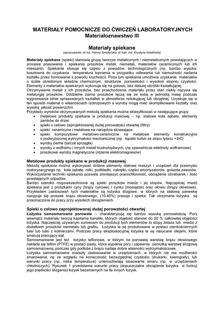 MATERIAŁY POMOCNICZE DO ĆWICZEŃ LABORATORYJNYCH Materiałoznawstwo III Materiały spiekane (opracowanie: dr inż. Hanna Smoleńska, dr hab. inż. Krystyna Imielińska) Materiały spiekane (spieki) stanowią grupę tworzyw metalicznych i niemetalicznych powstających w procesie prasowania i spiekania proszków metali, niemetali, materiałów ceramicznych lub ich mieszanin. Spiekanie stosuje się często z powodów: technologicznych (np. bardzo wysoka, kosztowna do uzyskania temperatura topnienia w przypadku odlewania lub niemożność nadania kształtu przez formowanie z powodu kruchości). Poza tym spiekanie umożliwia uzyskanie materiałów o ściśle określonym składzie chemicznym, strukturze, porowatości i wysokim stopniu czystości. Elementy z materiałów spiekanych wykonuje się na gotowo, bez dalszej obróbki kształtującej. Otrzymywanie metali z ich proszków, bez przechodzenia materiału przez stan ciekły nazywa się metalurgią proszków. Oddzielne ziarna proszków łączą się ze sobą w jednolitą masę podczas wygrzewania silnie sprasowanych kształtek w atmosferze redukującej lub obojętnej. Uzyskuje się w ten sposób materiał o własnościach izotropowych a wyroby mogą mieć skomplikowane kształty oraz wysoką jakość powierzchni. Przykłady wyrobów otrzymywanych metodą spiekania można sklasyfikować w następujące grupy: metalowe produkty spiekane w produkcji masowej – np. stalowe koła zębate, elementy zamków do drzwi spieki o celowo zaprojektowanej dużej porowatości otwartej (filtry) spieki ceramiczne i metalowe na narzędzia skrawające spieki kompozytowe metalowo-ceramiczne na metalowe elementy konstrukcyjne o podwyższonej wytrzymałości mechanicznej (np. łopatki turbin ze stopu tytanu +SiC) wyroby cierne (tarcze sprzęgła) wyroby z wolframu i innych metali trudnotopliwych, (np spawalnicze elektrody wolframowe) proszkowe wyroby magnetyczne (rdzenie elektromagnesów) Metalowe produkty spiekane w produkcji masowej Metodą spiekania można wykonywać drobne elementy stalowe maszyn i urządzeń dla przemysłu motoryzacyjnego np. koła zębate, rolki, podkładki, nakrętki, części amortyzatorów, gniazda zaworów. Wykorzystanie techniki spiekania pozwala zmniejszyć pracochłonność, obciążenie obrabiarek i ilość powstających odpadów. Bardzo szeroko rozpowszechnione są spieki proszków miedzi i jej stopów. Najczęściej miedź spiekana jest z proszkami cyny (brązy cynowe) i cynku (mosiądze) oraz ołowiu (brązy ołowiowe). Przykładem zastosowań tych materiałów są łożyska ślizgowe, w których na stalową panewkę nasypuje się proszek brązu ołowiowego, (10-40%) prasuje i spieka. Tak otrzymane łożyska są przeznaczone do pracy przy wysokich obciążeniach. Spieki o celowo zaprojektowanej dużej porowatości otwartej Łożyska samosmarowne porowate – charakteryzują się bardzo wysoką porowatością. Pory wewnątrz materiału tworzą kapilarne kanaliki, których objętość stanowi do 50 % całkowitej objętości łożyska. Najczęściej używanym surowcem do produkcji tych elementów to stopy żelaza lub miedzi z dodatkiem proszków niemetalu lub grafitu. Łożyska te są produkowane w postaci cienkościennych tulei lub tulei z kołnierzami. Podczas pracy eksploatacyjnej łożyska te są nasycane olejami, które smarują pracujący wał. Samosmarowne jest też łożysko teflonowe, w którym na porowatą warstwę brązu ołowiowego nakłada się teflon (PTFE) w postaci pasty, która wypełnia pory i zapewnia cieniutką warstwę ślizgową samosmarowną, podczas gdy podłoże z brązu nadaje dobre własności wytrzymałościowe. Łożyska samosmarowne znalazły zastosowanie w urządzeniach, w których nie ma możliwości smarowania, np ze względu na konieczność bezwzględnej czystości (drukarki, kserografy), lub warunki pracy (np. niska temperatura) uniemożliwiają stosowanie smaru (np. w urządzeniach chłodniczych). Rysunek 1 przedstawia warunki pracy (dopuszczalne obciążenie łożyska w funkcji jego prędkości ślizgania) łożysk bezsmarnych na tle innych łożysk. Rys. 1 Warunki (obciążenie, prędkość ślizgania) w których stosuje się łożyska bezsmarne na tle innych typów łożysk. Filtry porowate wykonuje się ze spieków proszków różnych metali i stopów np. brązów cynowych, stali chromowych i austenitycznych lub mosiądzów niklowych o porowatości do 50 %. Umożliwiają one -3 -4 oczyszczanie z cząstek o średnicy 10 - 10 mm. Filtry te posiadają dobre własności wytrzymałościowe tj. wytrzymałość na rozciąganie i zginanie, obciążenia udarowe i działanie wysokiej temperatury, odporność chemiczną. Mogą być oczyszczane przez przedmuchanie lub metodami chemicznymi. Materiały na narzędzia skrawające z dużymi prędkościami Najważniejszą współcześnie technologią kształtowania elementów maszyn i urządzeń jest w dalszym ciągu obróbka skrawaniem. Nawet w przypadku plastycznego kształtowania części na zimno lub na gorąco względnie przez odlewanie wiele końcowych zabiegów technologicznych wykonuje się przez skrawanie. Zasadnicze znaczenie w zakresie wzrostu wydajności i jakości obróbki skrawaniem mają nowoczesne, wysokowydajne narzędzia skrawające, umożliwiające skrawanie z dużymi prędkościami przy zastosowaniu obrabiarek sterowanych numerycznie. Spośród materiałów na narzędzia skrawające największe znaczenie mają stale szybkotnące, węgliki spiekane i ceramika narzędziowa, w mniejszym zakresie materiały super twarde: azotek boru i polikrystaliczny diament syntetyczny. Jednak największe wyzwanie stanowią dziś super twarde cienkie pokrycia przeciwzużyciowe nakładane na tradycyjnych podłożach (metodą CVD PVD). Eksploatacja narzędzi z takimi pokryciami wykazała kilkukrotny wzrost trwałości w porównaniu z narzędziami konwencjonalnymi (węglikami spiekanymi). a/ b/ c/ d/ Rys. 1 Kształty narzędziowych płytek ceramicznych, b/ trzo