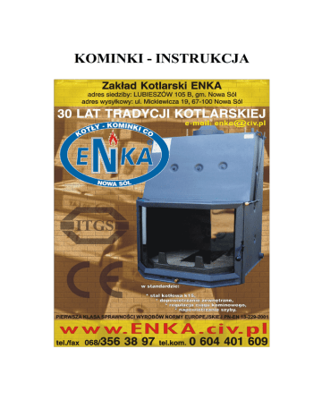 KOMINKI - INSTRUKCJA Informacje wstępne UWAGA : W CELU UNIKNIĘCIA NIEBEZPIECZEŃSTWA POŻARU WKŁAD KOMINKOWY WINIEN BYĆ ZAINSTALOWANY ZGODNIE Z ODPOWIEDNIMI PRZEPISAMI PRAWA BUDOWLANEGO, ORAZ Z ZALECENIAMI TECHNICZNYMI PODANYMI W NINIEJSZEJ INSTRUKCJI OBSŁUGI I EKSPLOATACJI. INSTALACJĘ WKŁADU KOMINKOWEGO POWINIEN WYKONAĆ WYKWALIFIKOWANY SPECJALISTA LUB AUTORYZOWANA __________________________________ FIRMA. __________________________________ Zakupiony przez Państwo wkład kominkowy z zespołem wodnym typu „EN-ka"jest przedstawicielem urządzeń grzewczych nowej generacji, opalanych drewnem opałowym. Łączy on w sobie walory estetyczne tradycyjnego wkładu kominkowego na drewno i funkcje kotła centralnego ogrzewania. Przed zainstalowaniem zakupionego wkładu kominkowego z zespołem wodnym: Radzimy Państwu przeczytać, uważnie i w całości, tekst niniejszej instrukcji aby osiągnąć jak największy pożytek oraz zadowolenie z wkładu kominkowego „EN-ka". Za skutki nie przestrzegania zaleceń instrukcji montażu odpowiedzialność ponosi użytkownik wkładu kominkowego. Wkład kominkowy z zespołem wodnym „EN-ka" powinien być zainstalowany zgodnie z niniejszą instrukcją obsługi. Szczególną uwagę należy zwrócić na: • Montaż elementów wkładu kominkowego z zespołem wodnym zgodnie z ich przeznaczeniem, • Podłączenie wkładu kominkowego z zespołem wodnym do przewodu odprowadzenia spalin oraz do przewodu kominowego, • Podłączenie wkładu kominkowego z zespołem wodnym do instalacji wodnej co. i/lub c.w.u., • Zapewnienie wymaganej wentylacji pomieszczenia, w którym będzie zainstalowany wkład kominkowy z zespołem wodnym. Szczegółowe zalecenia dotyczące instalowania wkładu kominkowego z zespołem wodnym w pomieszczeniu, w którym jest on instalowany podano w dalszych rozdziałach instrukcji. Zalecamy Państwu bezwzględne stosowanie się do wszelkich zaleceń przepisów budowlanych dotyczących instalacji wyciągowych spalin i kominów. Wymagania dotyczące warunków i zasad instalowania palenisk takich jak między innymi wkłady kominkowe, znaleźć można w obowiązujących na terenie każdego kraju normach jak również krajowych i lokalnych przepisach. Zawarte w nich postanowienia muszą być przestrzegane. Na terenie Polski, w tym zakresie obowiązują następujące akty prawne: - Rozporządzenie Ministra Infrastruktury z dn. 12.04.2002 r, w sprawie warunków technicznych, jakim powinny odpowiadać budynki i ich usytuowanie. Dz U Nr 75 z dn. 15.06.2002 r. Rozdział 4. - Norma PN-EN 13229:2001 Wkłady kominkowe włącznie z kominkami otwartymi na paliwa stałe. Wymagania i badania - Norma PN-91/B-02413 Ogrzewnictwo i ciepłownictwo. Zabezpieczenie instalacji ogrzewań wodnych systemu otwartego. Wymagania. Przeznaczenie wkładu kominkowego Wkłady kominkowe z zespołem wodnym „EN-ka" przeznaczone są do spalania drewna liściastego i służą do ogrzewania pomieszczeń, w których są zainstalowane. Mogą być stosowane jako samoistne lub dodatkowe źródła ciepła. Mogą również współpracować z zasobnikowymi podgrzewaczami ciepłej wody użytkowej. Obudowa wkładów kominkowych może być wykonana z marmuru, piaskowca lub cegły klinkierowej. Obudowa powinna być tak zaprojektowana, by wkład kominkowy z zespołem wodnym nie był na trwałe z nią związany z zachowaniem możliwości montażu i demontażu bez konieczności niszczenia lub uszkodzenia obudowy. Ponadto powinna zapewniać dostęp powietrza potrzebnego do spalania jak i wentylacji poprzez zastosowanie odpowiednich kratek oraz łatwy dostęp do obsługi przepustnicy spalin lub regulatora ciągu kominowego. UWAGA Wkłady kominkowe z zespołem wodnym typu „EN-ka" przeznaczone są do pracy jako źródło ciepła w instalacjach ogrzewań wodnych grawitacyjnych łub pompowych systemu odartego zgodnie z normą PN-91/B-02413, w których dopuszczalna temperatura wody na zasilaniu nie przekracza 95 °C, dopuszczalne ciśnienie robocze nie przekracza wartości 0,08 MPa a woda instalacyjna służy wyłącznie do celów grzewczych i nie może być pobierana z instalacji. Zabrania się stosowania wkładów kominkowych z zespołem wodnym typu „EN-ka" w instalacjach ogrzewań wodnych systemu zamkniętego z rozszerzalnościowymi naczyniami wzbiorczymi (przeponowymi). Opis wkładu kominkowego z zespołem wodnym Schemat budowy wkładu kominkowego z zespołem wodnym typu „EN-ka" pokazano na rys.l. Zasadniczą częścią korpusu wkładu kominkowego jest komora spalania (2) (dolna, przednia część korpusu) . Przednią ścianę komory spalania stanowią drzwiczki (3) wyposażone w płaską szybę żaroodporną osadzone w ramie (1) . Na spodzie komory spalania (2) ułożony jest pokład rusztowy (6) wykonany z żeliwnego rusztu segmentowego, całość pokładu rusztowego osadzona jest w wykładzinie szamotowej paleniska (7). W górnej części komory spalania zamontowane są opłomki (9). Na stropie korpusu wodnego zamontowany jest czopuch (10), stanowiący wylot spalin. Powietrze do spalania podawane jest za pomocą ręcznie sterowanej przepustnicy powietrza (4), otwieranie i zamykanie przepustnicy (4) wykonywane jest za pomocą uchwytu . Przepustnica (4) wraz z uchwytem zamontowane są pod drzwiczkami paleniskowymi (3). Powietrze do rozpalania ( ze stanu zimnego ) podawane jest poprzez ręcznie sterowaną żaluzyjną przepustnica powietrza (4), umieszczoną pod drzwiczkami paleniskowymi (3). Regulacja stopnia otwarcia przepustnicy powietrza (4) odbywa się za pomocą uchwytu , a kierunek napływu powietrza bezpośrednio na warstwę żaru wymusza ruszt pionowy (5) zabezpieczający dodatkowo wkład kominkowy przed wysypywaniem się rozżarzonego paliwa po otwarciu drzwiczek zasypowych (3). Natomiast powietrze wtórne, konieczne do dopalenia tlenku węgla pojawiającego się w czasie procesu spalania paliwa doprowadzane jest poprzez dwie przepustnice (8), rozmieszczone symetrycznie po ob