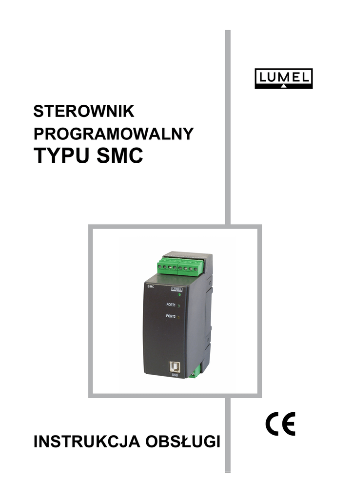 STEROWNIK PROGRAMOWALNY TYPU SMC INSTRUKCJA OBSŁUGI 2 SPIS TREŚCI 1. PRZEZNACZENIE I BUDOWA.......................................................................................... 1 2. ZESTAW STEROWNIKA .................................................................................................. 4 3. WYMAGANIA PODSTAWOWE, BEZPIECZEŃSTWO UśYTKOWANIA .......................... 5 4. OPIS KONSTRUKCJI I INSTALOWANIE ......................................................................... 5 4.1.Opis konstrukcji .................................................................................................... 5 4.2.Opis zacisków....................................................................................................... 6 4.3.Instalacja portu COM dla Windows ....................................................................... 7 4.4.Instalacja sterowników portu COM na komputerze ............................................... 7 5. KONFIGURACJA STEROWNIKA ..................................................................................... 7 5.2 Komunikacja SMC urządzenia (moduły SM).................................................. 10 5.3 Zapisanie programu do SMC .............................................................................. 15 6. OPIS FUNKCJI PROTOKOŁU TRANSMISJI .................................................................. 15 6.1.Odczyt n-rejestrów (kod 03)................................................................................ 15 6.2.Zapis wartości do rejestru (kod 06)..................................................................... 16 6.3.Zapis do n-rejestrów (kod 16) ............................................................................. 16 6.4.Raport identyfikujący urządzenie (kod 17) .......................................................... 16 7. KODY BŁĘDÓW ............................................................................................................. 17 8. DANE TECHNICZNE ...................................................................................................... 18 9. KOD WYKONANIA ......................................................................................................... 19 10. KONSERWACJA I SERWIS. ........................................................................................ 19 3 1. PRZEZNACZENIE I BUDOWA Sterownik programowalny SMC jest centralnym modułem decyzyjnym w rozproszonych systemach kontrolno–pomiarowych z szybką komunikacją Modbus (do 115.2 kbit/s). MoŜe obsługiwać zdalne moduły wejść/wyjść analogowych i binarnych, przetworniki pomiarowe, falowniki, mikrosterowniki, rejestratory, tablice świetlne, panele HMI touch screen itd. Dzięki integracji rozmaitych urządzeń uzyskuje się wszechstronny i elastyczny system rozproszony o szerokim zakresie zastosowań. • • • • • • Sterownik SMC jest programowany w języku ST (Structured Text) normy IEC 61131–3, która jako PN–EN 61131–3 obowiązuje w Polsce od 2004 r. Język ST, jako najwszechstronniejszy spośród języków IEC, pozwala implementować wszelkiego typu algorytmy. Do programowania SMC słuŜy pakiet narzędziowy CPDev (Control Program Developer) składający się z kompilatora CPDev, symulatora programów CPSim oraz konfiguratora komunikacji CPCon. Pakiet zawiera biblioteki – IEC_61131, Basic_blocks i Complex_blocks. Projektant moŜe tworzyć własne biblioteki z funkcjami, blokami funkcjonalnymi i programami. Do komunikacji są dwa porty szeregowe. Port 1 ma dwa układy interfejsu RS-485 do komunikacji z urządzeniami pracującymi na obiekcie. Port 2 ma interfejs RS485, RS232C i USB do komunikacji z systemem nadrzędnym przez łącza przewodowe. Na portach zaimplementowany został asynchroniczny znakowy protokół komunikacyjny MODBUS. Zestawienie parametrów łącza szeregowego sterownika SMC: − Adres: 1..247 − prędkość transmisji: 1.2, 2.4, 4.8, 9.6, 19.2, 38.4, 57.6, 115.2 kbit/s, − tryby pracy: ASCII: 8N1, 7E1, 7O1, 7N2; RTU: 8N2, 8E1, 8O1, 8N1 Przykładowa topologia sieci z zastosowaniem sterowników pokazana jest na rys.1. SMC RS485 RS485 RS232 SMC RS485 Rys. 1 Przykładowa topologia sieci z zastosowaniem sterowników typu SMC 2. ZESTAW STEROWNIKA W skład zestawu sterownika wchodzą: - sterownik SMC - instrukcja obsługi - instrukcja programowania - karta gwarancyjna - płyta CD z oprogramowaniem narzędziowym i sterownikami portu USB 1 szt, 1 szt, 1 szt, 1 szt, 1 szt. 4 3. WYMAGANIA PODSTAWOWE, BEZPIECZEŃSTWO UśYTKOWANIA Symbole umieszczone w instrukcji oznaczają: − Szczególnie waŜne, naleŜy zapoznać się przed podłączeniem modułu. Nieprzestrzeganie uwag oznaczonych tym symbolem moŜe spowodować uszkodzenie modułu. Uwaga: Zdjęcie obudowy modułu w trakcie trwania umowy gwarancyjnej powoduje jej uniewaŜnienie. W zakresie bezpieczeństwa uŜytkowania, moduł odpowiada wymaganiom normy PN-EN 61010-1. Uwagi dotyczące bezpieczeństwa: − − − − W instalacji budynku powinien istnieć wyłącznik lub wyłącznik automatyczny. Element ten powinien być w pobliŜu urządzenia, łatwo dostępny dla operatora. Powinien on być oznakowany jako przyrząd rozłączający urządzenia. Instalacji i podłączeń modułu powinien dokonywać wykwalifikowany personel. NaleŜy wziąć pod uwagę wszystkie dostępne wymogi ochrony. Przed włączeniem zasilania naleŜy sprawdzić poprawność połączeń kabla sieciowego. Nie podłączać modułu do sieci poprzez autotransformator. 4. OPIS KONSTRUKCJI I INSTALOWANIE 4.1. Opis konstrukcji Sterownik jest mocowany na wsporniku montaŜowym 35mm PN-EN 60715 w sposób pokazany na rys 2. SMC Rys. 2. Sposób mocowania sterownika SMC 5 4.2. Opis zacisków Zasilanie oraz sygnały zewnętrzne naleŜy podłączyć zgodnie z rysunkiem 3. W tablicy 1 opisano poszczególne wyprowadzenia. Uwaga: NaleŜy zwrócić szczególną uwagę na prawidłowe podłączenie sygnałów zewnętrznych (patrz tablica1). SMC