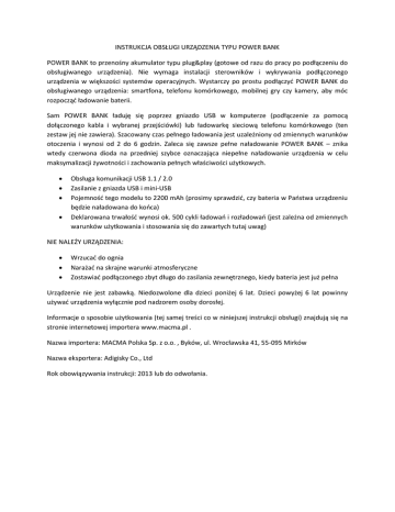 INSTRUKCJA OBSŁUGI URZĄDZENIA TYPU POWER BANK POWER BANK to przenośny akumulator typu plug&play (gotowe od razu do pracy po podłączeniu do obsługiwanego urządzenia). Nie wymaga instalacji sterowników i wykrywania podłączonego urządzenia w większości systemów operacyjnych. Wystarczy po prostu podłączyć POWER BANK do obsługiwanego urządzenia: smartfona, telefonu komórkowego, mobilnej gry czy kamery, aby móc rozpocząć ładowanie baterii. Sam POWER BANK ładuję się poprzez gniazdo USB w komputerze (podłączenie za pomocą dołączonego kabla i wybranej przejściówki) lub ładowarkę sieciową telefonu komórkowego (ten zestaw jej nie zawiera). Szacowany czas pełnego ładowania jest uzależniony od zmiennych warunków otoczenia i wynosi od 2 do 6 godzin. Zaleca się zawsze pełne naładowanie POWER BANK – znika wtedy czerwona dioda na przedniej szybce oznaczająca niepełne naładowanie urządzenia w celu maksymalizacji żywotności i zachowania pełnych właściwości użytkowych. Obsługa komunikacji USB 1.1 / 2.0 Zasilanie z gniazda USB i mini-USB Pojemność tego modelu to 2200 mAh (prosimy sprawdzić, czy bateria w Państwa urządzeniu będzie naładowana do końca) Deklarowana trwałość wynosi ok. 500 cykli ładowań i rozładowań (jest zależna od zmiennych warunków użytkowania i stosowania się do zawartych tutaj uwag) NIE NALEŻY URZĄDZENIA: Wrzucać do ognia Narażać na skrajne warunki atmosferyczne Zostawiać podłączonego zbyt długo do zasilania zewnętrznego, kiedy bateria jest już pełna Urządzenie nie jest zabawką. Niedozwolone dla dzieci poniżej 6 lat. Dzieci powyżej 6 lat powinny używać urządzenia wyłącznie pod nadzorem osoby dorosłej. Informacje o sposobie użytkowania (tej samej treści co w niniejszej instrukcji obsługi) znajdują się na stronie internetowej importera www.macma.pl . Nazwa importera: MACMA Polska Sp. z o.o. , Byków, ul. Wrocławska 41, 55-095 Mirków Nazwa eksportera: Adigisky Co., Ltd Rok obowiązywania instrukcji: 2013 lub do odwołania.