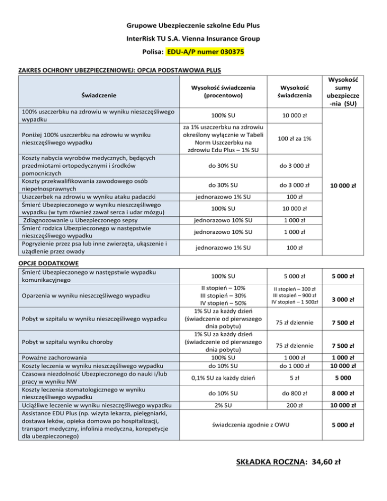 Grupowe Ubezpieczenie szkolne Edu Plus InterRisk TU S.A. Vienna Insurance Group Polisa: EDU-A/P numer 030375 ZAKRES OCHRONY UBEZPIECZENIOWEJ: OPCJA PODSTAWOWA PLUS Świadczenie 100% uszczerbku na zdrowiu w wyniku nieszczęśliwego wypadku Poniżej 100% uszczerbku na zdrowiu w wyniku nieszczęśliwego wypadku Koszty nabycia wyrobów medycznych, będących przedmiotami ortopedycznymi i środków pomocniczych Koszty przekwalifikowania zawodowego osób niepełnosprawnych Uszczerbek na zdrowiu w wyniku ataku padaczki Śmierć Ubezpieczonego w wyniku nieszczęśliwego wypadku (w tym również zawał serca i udar mózgu) Zdiagnozowanie u Ubezpieczonego sepsy Śmierć rodzica Ubezpieczonego w następstwie nieszczęśliwego wypadku Pogryzienie przez psa lub inne zwierzęta, ukąszenie i użądlenie przez owady OPCJE DODATKOWE Śmierć Ubezpieczonego w następstwie wypadku komunikacyjnego Oparzenia w wyniku nieszczęśliwego wypadku Pobyt w szpitalu w wyniku nieszczęśliwego wypadku Pobyt w szpitalu wyniku choroby Poważne zachorowania Koszty leczenia w wyniku nieszczęśliwego wypadku Czasowa niezdolność Ubezpieczonego do nauki i/lub pracy w wyniku NW Koszty leczenia stomatologicznego w wyniku nieszczęśliwego wypadku Uciążliwe leczenie w wyniku nieszczęśliwego wypadku Assistance EDU Plus (np. wizyta lekarza, pielęgniarki, dostawa leków, opieka domowa po hospitalizacji, transport medyczny, infolinia medyczna, korepetycje dla ubezpieczonego) Wysokość sumy ubezpiecze -nia (SU) Wysokość świadczenia (procentowo) Wysokość świadczenia 100% SU 10 000 zł za 1% uszczerbku na zdrowiu określony wyłącznie w Tabeli Norm Uszczerbku na zdrowiu Edu Plus – 1% SU 100 zł za 1% do 30% SU do 3 000 zł do 30% SU do 3 000 zł jednorazowo 1% SU 100 zł 100% SU 10 000 zł jednorazowo 10% SU 1 000 zł jednorazowo 10% SU 1 000 zł jednorazowo 1% SU 100 zł 100% SU 5 000 zł 5 000 zł II stopień – 10% III stopień – 30% IV stopień – 50% 1% SU za każdy dzień (świadczenie od pierwszego dnia pobytu) 1% SU za każdy dzień (świadczenie od pierwszego dnia pobytu) 100% SU do 10% SU II stopień – 300 zł III stopień – 900 zł IV stopień – 1 500zł 3 000 zł 75 zł dziennie 7 500 zł 75 zł dziennie 7 500 zł 1 000 zł do 1 000 zł 1 000 zł 10 000 zł 0,1% SU za każdy dzień 5 zł 5 000 do 10% SU do 800 zł 8 000 zł 2% SU 200 zł 10 000 zł świadczenia zgodnie z OWU 10 000 zł 5 000 zł SKŁADKA ROCZNA: 34,60 zł