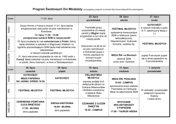 Program Światowych Dni Młodzieży (szczegółowy program na stronie http://www.krakow2016.com/program) WIECZÓR POŁUDNIE RANO Dzień Grupa l'Arche z Francji w dniach 11-21. lipca będzie przygotowywać swój pobyt na polu namiotowym w Kokotowie. 12. lipca 11:30 - 13:00 peregrynacja symboli ŚDM w naszej parafii 18. lipca przybędą do nas wolontariusze z Polski, którzy będą mieszkać w szkołach w Węgrzcach Wielkich i w tygodniu poprzedzającym ŚDM będą mieli szkolenia oraz nabożeństwa w naszym kościele parafialnym. 21. lipca wieczorem przybędzie do nas ok. 1000 osób z Francji. Będą mieszkać na polu namiotowym w Kokotowie, w szkole, domu ludowym i w Arce w Śledziejowicach. 25. lipca 26. lipca 27. lipca poniedziałek wtorek środa FESTIWAL MŁODYCH KATECHEZY w naszym kościele o godz. 9-11 zakończone Mszą o 11 Pozostałe grupy przydzielone do naszej parafii (z Węgier) będą przyjeżdżać w tym dniu do naszej parafii. Wieczorem od 20 do 22 na polu namiotowym w Kokotowie grupa z l'Arche zaprasza na koncert muzyki chrześcijańskiej. wydarzenia towarzyszące ŚDM w Wieliczce (arena lekkoatletyczna), Niepołomicach, Krakowie: koncerty, wystawy itp. MSZA ŚW. na Błoniach FESTIWAL MŁODYCH otwarcie ŚDM przez kard. Dziwisza papież Franciszek pojawi się w oknie papieskim na Franciszkańskiej 28. lipca 29. lipca 30. lipca 31. lipca 1. sierpnia czwartek piątek sobota niedziela poniedziałek KATECHEZY PIELGRZYMKA MŁODYCH MSZA ŚW. POSŁANIA KATECHEZY poprzez podjęty trud pielgrzymki pieszo na Campus Misericordiae młodzież uczestniczy w łaskach Roku Miłosierdzia sprawowana przez papieża Franciszka na Campusie Msza na zakończenie ŚDM 18:00 - BŁONIA CZUWANIE Z OJCEM ŚWIĘTYM okno papieskie 19:30 - CAMPUS SPOTKANIE WOLONTARIUSZY Z PAPIEŻEM PPŁ MSZA PAPIESKA NA JASNEJ GÓRZE 10:30 FESTIWAL MŁODYCH FESTIWAL MŁODYCH WIECZÓR RANO Dzień 11-24. lipca CEREMONIA POWITANIA OJCA ŚWIĘTEGO DROGA KRZYŻOWA 17:30 - BŁONIA okno papieskie 10:00 - CAMPUS 17:00 - TAURON ARENA W niedzielę i poniedziałek pielgrzymi opuszczą Kraków i nasze domy.