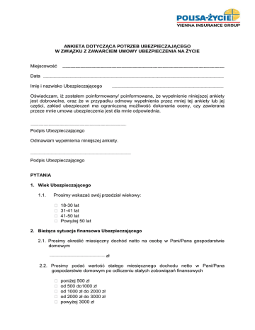 ANKIETA DOTYCZĄCA POTRZEB UBEZPIECZAJĄCEGO W ZWIĄZKU Z ZAWARCIEM UMOWY UBEZPIECZENIA NA ŻYCIE Miejscowość Data Imię i nazwisko Ubezpieczającego Oświadczam, iż zostałem poinformowany/ poinformowana, że wypełnienie niniejszej ankiety jest dobrowolne, oraz że w przypadku odmowy wypełnienia przez mniej tej ankiety lub jej części, zakład ubezpieczeń ma ograniczoną możliwość dokonania oceny, czy zawierana przeze mnie umowa ubezpieczenia jest dla mnie odpowiednia. Podpis Ubezpieczającego Odmawiam wypełnienia niniejszej ankiety. Podpis Ubezpieczającego PYTANIA 1. Wiek Ubezpieczającego 1.1. Prosimy wskazać swój przedział wiekowy: 18-30 lat 31-41 lat 41-50 lat Powyżej 50 lat 2. Bieżąca sytuacja finansowa Ubezpieczającego 2.1. Prosimy określić miesięczny dochód netto na osobę w Pani/Pana gospodarstwie domowym zł 2.2. Prosimy podać wartość stałego miesięcznego dochodu netto w Pani/Pana gospodarstwie domowym po odliczeniu stałych zobowiązań finansowych poniżej 500 zł od 500 do1000 zł od 1000 zł do 2000 zł od 2000 zł do 3000 zł powyżej 3000 zł 3. Cel zawarcia umowy ubezpieczenia. 3.1. Prosimy wskazać, które z poniższych określeń najtrafniej charakteryzuje cel zawarcia przez Panią/Pana umowy ubezpieczenia: ochronny tzn. zapewniający wypłatę świadczenia pieniężnego tylko w przypadku zdarzenia losowego, tj. jest np. śmierci ubezpieczonego lub dożycia przez niego określonego wieku zabezpieczenie emerytalne zabezpieczenie środków na kształcenie dzieci Inny …………………….. 4. Preferowana częstotliwość opłacania składki ubezpieczeniowej. 4.1. Prosimy wskazać preferowaną częstotliwość opłacania składki ubezpieczeniowej: Składka jednorazowa Składka regularna, opłacana z częstotliwością: o Miesięczną o Kwartalną o Półroczną o Roczną 5. Preferowany okres obowiązywania umowy ubezpieczenia. 5.1. Prosimy wskazać preferowany okres obowiązywania umowy ubezpieczenia na życie: Poniżej roku Od roku do 5 lat Powyżej 5 lat do 10 lat Powyżej 10 lat 6. Wiedza i źródła wiedzy w zakresie ubezpieczeń na życie: 6.2. Prosimy wskazać źródła wiedzy w zakresie ubezpieczeń na życie: Publikacje prasowe, w tym z portali internetowych i programów telewizyjnych Rozmowy ze specjalistami (agenci ubezpieczeniowy, pracownicy towarzystw ubezpieczeniowych) Nie posiadam wiedzy w zakresie ubezpieczeń na życie Inne ………………………. 7. Prosimy wskazać rodzaj/rodzaje zawieranych umów w zakresie ubezpieczeń na życie oraz produktów inwestycyjnych w ciągu ostatnich 5 lat: 7.1. Ubezpieczenia na życie z gwarantowaną sumą ubezpieczenia na wypadek śmierci Tak Nie Nie pamiętam 7.2. Ubezpieczenia na życie z zakresem ochrony rozszerzonym o ryzyka dot. pogorszenia się stanu zdrowia w związku z chorobą lub nieszczęśliwym wypadkiem Tak Nie Nie pamiętam 7.3. Ubezpieczenia na życie z ubezpieczeniowym funduszem kapitałowym Tak Nie Nie pamiętam 7.4. Ubezpieczenia rentowe na życie Tak Nie Nie pamiętam 7.5. Lokaty bankowe i/lub obligacje Skarbu Państwa Tak Nie Nie wiem 7.6. Fundusze inwestycyjne (akcyjne, pieniężne, obligacyjne, mieszane i inne) Tak Nie Nie pamiętam Podpis Ubezpieczającego Oświadczam, że otrzymałem/am informację o wyniku analizy Ankiety oraz wnioskuję o zawarcie umowy ubezpieczenia. Podpis Ubezpieczającego Podpis Agenta