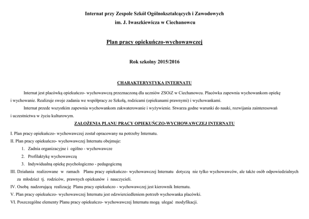 Internat przy Zespole Szkół Ogólnokształcących i Zawodowych im. J. Iwaszkiewicza w Ciechanowcu Plan pracy opiekuńczo-wychowawczej Rok szkolny 2015/2016 CHARAKTERYSTYKA INTERNATU Internat jest placówką opiekuńczo- wychowawczą przeznaczoną dla uczniów ZSOiZ w Ciechanowcu. Placówka zapewnia wychowankom opiekę i wychowanie. Realizuje swoje zadania we współpracy ze Szkołą, rodzicami (opiekunami prawnymi) i wychowankami. Internat przede wszystkim zapewnia wychowankom zakwaterowanie i wyżywienie. Stwarza godne warunki do nauki, rozwijania zainteresowań i uczestnictwa w życiu kulturowym. ZAŁOŻENIA PLANU PRACY OPIEKUŃCZO-WYCHOWAWCZEJ INTERNATU I. Plan pracy opiekuńczo- wychowawczej został opracowany na potrzeby Internatu. II. Plan pracy opiekuńczo- wychowawczej Internatu obejmuje: 1. Zadnia organizacyjne i ogólno - wychowawcze 2. Profilaktykę wychowawczą 3. Indywidualną opiekę psychologiczno - pedagogiczną III. Działania realizowane w ramach Planu pracy opiekuńczo- wychowawczej Internatu dotyczą nie tylko wychowawców, ale także osób odpowiedzialnych za młodzież tj. rodziców, prawnych opiekunów i nauczycieli. IV. Osobą nadzorującą realizację Planu pracy opiekuńczo - wychowawczej jest kierownik Internatu. V. Plan pracy opiekuńczo- wychowawczej Internatu jest odzwierciedleniem potrzeb wychowanka placówki. VI. Poszczególne elementy Planu pracy opiekuńczo- wychowawczej Internatu mogą ulegać modyfikacji. CELE WYCHOWAWCZE 1. Wszechstronny rozwój osobowości wychowanka w zakresie intelektualnym, psychicznym, moralnym, społecznym, estetycznym i zdrowotnym. 2. Kształtowanie świadomości obywatelskiej oraz więzi z krajem ojczystym, regionem. 3. Dążenie do rozwijania u podopiecznych dociekliwości poznawczej ukierunkowanej na poszukiwanie prawdy, dobra i piękna w świecie. 4. Kształtowanie świadomości moralnej w wymiarze indywidualnym i społecznym, dokonywania wyborów i hierarchii wartości. 5. Ukazywanie celu i potrzeby kształcenia oraz użyteczności nabywania wiedzy w przygotowywaniu się do zadań w czynnym życiu zawodowym i społecznym. 6. Wyrabianie umiejętności kreowania koncepcji własnego życia, realizacji postawionych celów poprzez rzetelną pracę i uczciwość. 7. Tworzenie klimatu miłości i szacunku do Ojczyzny, rodziny, rówieśników, słabszych i potrzebujących. 8. Rozwijanie wrażliwości na potrzeby drugiego człowieka i jego środowiska. TREŚCI 1. Organizacja życia w internacie. 2. Samorządność mieszkańców. 3. Wychowanie zdrowotne i profilaktyka uzależnień. 4. Sukces szkolny wychowanka 5. Edukacja kulturalna młodzieży. 6. Rozwijanie zainteresowań i uzdolnień wychowanków. Organizacja czasu wolnego. 7. Upowszechnianie zasad dobrego wychowania. Przeciwdziałanie agresji. 8. Współdziałanie z rodzicami i opiekunami wychowanków oraz środowiskiem społecznym. 9. Relacje interpersonalne. 10. Wspomaganie indywidualnego rozwoju wychowanków. I. Wstęp Wszelkie działania mają zmierzać do ukształtowania wizerunku wychowanka, który wykorzystując w pełni swoje możliwości, intelekt, emocje i umiejętności społeczne prawidłowo funkcjonuje we wszystkich dziedzinach życia. LP. 1. ZAŁOŻENIA Organizacja życia w internacie. DZIAŁANIA WYCHOWAWCZE FORMY REALIZACJI podział wychowanków na grupy wychowawcze, nad którymi opiekę sprawują wychowawcy grup (podział na grupy ze względu na płeć i przyporządkowanie do pokoi), zajęcia integracyjne dla młodzieży z klas pierwszych. ODPOWIEDZIALNY Kierownik internatu, TERMIN REALIZACJI Wrzesień Wychowawcy internatu. diagnoza środowiska wychowawczego młodzieży, systematyczne kontakty z rodzicami wychowanków, stała obserwacja zachowania podopiecznych, Rozmowy z wychowankami i ich rodzicami. Zebrania z rodzicami. Zapoznanie z dokumentacją zgromadzoną przez pedagoga szkolnego Codzienna obserwacja szczegółowe omówienie Regulaminu Internatu ze szczególnym zwróceniem uwagi na prawa i obowiązki wychowanka, zapoznanie z przepisami BHP oraz z przepisami przeciwpożarowymi. Zebranie z wychowankami w grupach wychowawczych Wychowawcy internatu Wrzesień wdrażanie wychowanków do wspólnej odpowiedzialności za ład i porządek w pokojach oraz pomieszczeniach wspólnego użytkowania, ogłoszenie, systematyczne prowadzenie i podsumowanie konkursu czystości, osobista odpowiedzialność materialna za poniesione szkody, porządkowanie terenu wokół internatu, dbałość o kwiaty doniczkowe Okresowa kontrola pokoi pod względem dbałości o wyposażenie, ład i porządek. Kontrola czystości w pokojach Regularne dbanie o otoczenie budynku Wychowawcy internatu Cały rok szkolny Wychowawcy internatu Cały rok szkolny 2. Samorządność mieszkańców. 3. Wychowanie zdrowotne i profilaktyka uzależnień. kształtowanie umiejętności analizowania własnego postępowania, uczenie umiejętności adekwatnej samooceny. wybór Samorządu Internatu edukacja w zakresie samorządności, pomoc w adaptacji i integracji mieszkańców internatu, tworzenie atmosfery otwarcia i życzliwości, wspieranie działalności samorządowej wychowanków, kształtowanie nawyków i przyzwyczajeń zdrowotnych, higienicznych oraz związanych z zachowaniem bezpieczeństwa, przeciwdziałanie negatywnym zachowaniom młodzieży, działania edukacyjne dotyczące uzależnień i zagrożeń współczesnego świata, kształtowanie świadomości w zakresie bezpieczeństwa osobistego, pomoc w uświadamianiu sytuacji problemowych, szukanie dróg wyjścia, realizacja zagadnień związanych z prawidłowym odżywianiem realizacja zagadnień związanych z bezpiecznym zachowaniem się w różnych sytuacjach życia codziennego (wyjście poza teren internatu, jazda samochodem, dyskoteka, wypoczynek, itp.) Rozmowy z wychowankami Zajęcia wychowawcze Wychowawcy internatu Cały rok szkolny Wybór przedstawicieli do Samorządu Internatu Wybór członków do sekcji Zajęcia integracyjne Współpraca z samorzą