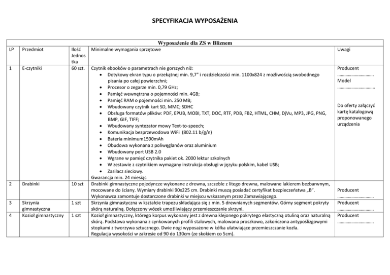 SPECYFIKACJA WYPOSAŻENIA Wyposażenie dla ZS w Bliznem LP Przedmiot 1 E-czytniki 2 3 4 Drabinki Skrzynia gimnastyczna Kozioł gimnastyczny Ilość Jednos tka 60 szt. 10 szt 1 szt 1 szt Minimalne wymagania sprzętowe Uwagi Czytnik ebooków o parametrach nie gorszych niż: Dotykowy ekran typu o przekątnej min. 9,7" i rozdzielczości min. 1100x824 z możliwością swobodnego pisania po całej powierzchni; Procesor o zegarze min. 0,79 GHz; Pamięć wewnętrzna o pojemności min. 4GB; Pamięć RAM o pojemności min. 250 MB; Wbudowany czytnik kart SD, MMC; SDHC Obsługa formatów plików: PDF, EPUB, MOBI, TXT, DOC, RTF, PDB, FB2, HTML, CHM, DjVu, MP3, JPG, PNG, BMP, GIF, TIFF; Wbudowany syntezator mowy Text-to-speech; Komunikacja bezprzewodowa WiFi (802.11 b/g/n) Bateria minimum1590mAh Obudowa wykonana z poliwęglanów oraz aluminium Wbudowany port USB 2.0 Wgrane w pamięć czytnika pakiet ok. 2000 lektur szkolnych W zestawie z czytnikiem wymagany instrukcja obsługi w języku polskim, kabel USB; Zasilacz sieciowy. Gwarancja min. 24 miesiąc Drabinki gimnastyczne pojedyncze wykonane z drewna, szczeble z litego drewna, malowane lakierem bezbarwnym, mocowane do ściany. Wymiary drabinki 90x225 cm. Drabinki muszą posiadać certyfikat bezpieczeństwa „B”. Wykonawca zamontuje dostarczone drabinki w miejscu wskazanym przez Zamawiającego. Skrzynia gimnastyczna w kształcie trapezu składająca się z min. 5 drewnianych segmentów. Górny segment pokryty skórą naturalną. Dołączony wózek umożliwiający przemieszczanie skrzyni. Kozioł gimnastyczny, którego korpus wykonany jest z drewna klejonego pokrytego elastyczną otuliną oraz naturalną skórą. Podstawa wykonana z cynkowanych profili stalowych, malowana proszkowo, zakończona antypoślizgowymi stopkami z tworzywa sztucznego. Dwie nogi wyposażone w kółka ułatwiające przemieszczanie kozła. Regulacja wysokości w zakresie od 90 do 130cm (ze skokiem co 5cm). Producent …………………………. Model ………………………….. Do oferty załączyć kartę katalogową proponowanego urządzenia Producent …………………………. Producent …………………………. Producent …………………………. SPECYFIKACJA WYPOSAŻENIA 5 Kuchnie gazowe 2 szt 6 Szafy metalowe 3 szt 7 Pracownia językowa 48 stano wisk Kuchnie gazowe o parametrach nie gorszych niż: 5 palnikowa na gaz ziemny GZ 50; Z wbudowanym piekarnikiem konwekcyjnym w standardzie GN 1/1; Wykonana ze stali nierdzewnej; 3 częściowy żeliwny ruszt; 2 wentylatory w piekarniku; Termostat do 275 stopni celcjusza; Przeszklone drzwi piekarnika; Timer do 120 minut W zestawie dołączone dysze na gaz propan butan Górny element grzewczy o mocy min. 2,5kW umożliwiający grillowanie Wbudowany elektryczny zapłon i zawór termopary Wymiary nie większe niż: 900/600/850/900 Waga nie większa niż 80kg Moc min. 14,3kW Możliwość regulowania nóżek kuchni Szafy metalowe nierdzewne o wymiarach min: Wysokość min. 180 cm Szerokość 100cm Głębokość min. 70cm Min. Dwupoziomowa, drzwi przesuwne Dwie pracownie językowe, każda 24 stanowiskowa + stanowisko nauczyciela. Do jednej z pracowni dodatkowo zestaw 24 laptopów dla uczniów wraz z oprogramowaniem. W skład każdej pracowni językowej wchodzą: (uwaga! Całość należy pomnożyć x2 w celu wyposażenia dwóch pracowni językowych, oprócz laptopów dla uczniów) Pulpit nauczyciela z wbudowanym wzmacniaczem stereofonicznym – 1szt pulpit z klawiaturą foliową odporną na zanieczyszczenia i zalanie lub jednostka centralna zamykana w szafce biurka nauczycielskiego zbudowany na bazie dwóch mikrokontrolerów(osobny dedykowany do komunikacji z komputerem oraz drugi specjalistyczny mikrokontroler dedykowany do cyfrowej obróbki dźwięku sterowanie pracownią z poziomu pulpitu lub za pomocą podłączonego do pracowni komputera z Producent …………………………. Model ………………………….. Producent …………………………. Model ………………………….. Producent pulpitu pracowni językowej …………………………. Model pulpitu ………………………….. Producent słuchawek …………………………. Model słuchawek ………………………….. Nazwa SPECYFIKACJA WYPOSAŻENIA odpowiednim oprogramowaniem. możliwość uruchomienia pracowni dzięki specjalnej karcie zbliżeniowej RFID zapewniającej odpowiednią kontrolę dostępu do pracowni lub hasła do komputera Pracownia musi posiadać wbudowany wyświetlacz Pracownia musi posiadać przyciski umożliwiające włączanie i wyłączanie poszczególnych mikrofonów uczniów, wybór źródła dźwięku, sterowanie mikrofonem i słuchawką nauczyciela, wybór sygnału, regulacja głośności indywidualnie dla każdego stanowiska z poziomu programu, sterowanie pracą timera wbudowana funkcjonalność timera umożliwiająca ustawienie przypomnienia po upływie określonego czasu brak elementów wystających (łatwych do uszkodzenia) możliwa praca w trybach: praca w grupach (podział uczniów na dwie, trzy, cztery, sześć, osiem, dowolnie lub losowo tworzonych grup pracujących w jednym czasie), praca w parach (możliwość prowadzenia dialogu w dowolnie lub losowo tworzonych parach; nauczyciel musi mieć możliwość podsłuchu par), symulacja rozmowy telefonicznej (praca w min. 3 trybach zniekształceń dźwięku, od niewielkich zakłóceń po zakłócenia zniekształcające sygnał, np. urywające fragmenty wyrazów); - wbudowany stereofoniczny wzmacniacz mocy współpracujący z zewnętrznymi głośnikami, cyfrowa regulacja głośności wzmacniacza, cyfrowe sterowanie siłą głosu indywidualne dla nauczyciela, osobno dla każdego ucznia i podłączonych źródeł audio programowalny poziom bezpiecznej głośności, możliwość podłączenia min 4 źródeł dźwięku z jednoczesną możliwością skierowania do 4 różnych grup. możliwość podłączenia dowolnego źródła dźwięku (o