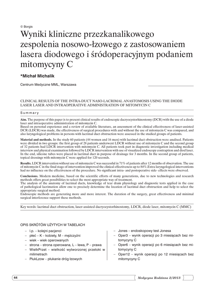 © Borgis Wyniki kliniczne przezkanalikowego zespolenia nosowo-łzowego z zastosowaniem lasera diodowego i śródoperacyjnym podaniem mitomycyny C *Michał Michalik Centrum Medyczne MML, Warszawa Clinical results of the intra-duct naso-lacrimal anastomosis using the diode laser laser and intraoperative administration of Mitomycin C Summary Aim. The purpose of this paper is to present clinical results of endoscopic dacryocystorhinostomy (DCR) with the use of a diode laser and intraoperative administration of mitomycin C. Based on personal experience and a review of available literature, an assessment of the clinical effectiveness of laser-assisted DCR (LDCR) was made, the effectiveness of surgical procedures with and without the use of mitomycin C was compared, and also laryngological problems in persons with lacrimal duct obstruction were assessed in the studied groups of patients. Material and methods. In the study 60 patients (44 women and 16 men) with lacrimal duct obstruction were analised. Patients were divided in two groups: the first group of 28 patients underwent LDCR without use of mitomycin C and the second group of 32 patients had LDCR intervention with mitomycin C. All patients took part in diagnostic investigation including medical interview and physical examination followed by LDCR intervention with use of visualized endoscopy contraption and diod laser. In the end, silicone tubes were placed in lacrimal duct in purpose of drainage for 3 months. In the second group of patients, topical dressings with mitomycin C were applied for 120 seconds. Results. LDCR intervention without use of mitomycin C was successful in 71% of patients after 12 months of observation. The use of mitomycin C in the final stage of intervention improved the clinical effectiveness up to 84%.Extra laryngological interventions had no influence on the effectiveness of the procedure. No significant intra- and postoperative side- effects were observed. Conclusions. Modern medicine, based on the scientific efforts of many generations, due to new technologies and research methods offers great possibilities to select the most appropriate way of treatment. The analysis of the anatomy of lacrimal ducts, knowledge of tear drain physiology and diagnostic tests applied in the case of pathological lacrimation allow one to precisely determine the location of lacrimal duct obstruction and help to select the appropriate surgical method. Endoscopic methods are generating more and more interest. The duration of the surgery, great effectiveness and minimal surgical interference support these methods. Key words: lacrimal duct obstruction, laser-assisted dacryocystorhinostomy, LDCR, diode laser, mitomycin C (MMC) OPIS SKRÓTÓW UŻYTYCH W TABELACH –– –– –– –– –– l.p. – kolejni pacjenci płeć – K – kobiety, M – mężczyźni wiek – wiek operowanych strona – strona operowana, L – lewa, P – prawa WielkPrzet – wielkość wytworzonej przetoki w milimetrach –– PlukLzow – płukanie dróg łzowych 44 –– Jones – endoskopowy test Jonesa –– Oper3 – wynik operacji po 3 miesiącach bez mitomycyny C –– Oper6 – wynik operacji po 6 miesiącach bez mitomycyny C –– Oper12 – wynik operacji po 12 miesiącach bez mitomycyny C Medycyna Rodzinna 2/2013 Wyniki kliniczne przezkanalikowego zespolenia nosowo-łzowego z zastosowaniem lasera diodowego... WSTĘP Współczesna medycyna, oparta na dorobku naukowym wielu pokoleń, dzięki nowym technologiom i metodom badawczym oraz zaangażowaniu ludzi nauki w pracę nad ich skutecznością i udoskonalaniem, oferuje ogromne możliwości w wyborze właściwej drogi leczenia. Postęp medycyny pozwala nie tylko lepiej i szybciej leczyć, lecz również zapobiec wielu powikłaniom i następstwom chorób czy wręcz wyeliminować przyczynę pewnych schorzeń. Ciekawym przypadkiem klinicznym, którego przyczyny są trudne do zdiagnozowania, a efekty zastosowania właściwego leczenia pozwalają uchronić pacjenta od jego następstw, jest nadmierne łzawienie. Patologiczne, nadmierne łzawienie może być spowodowane przez zbyt dużą produkcję łez, niedrożność dróg odpływowych oraz tzw. blok czynnościowy, czyli niewydolność dróg łzowych. Obecnie łzawienie będące wynikiem niedrożności dróg łzowych, stanowi około 3% wszystkich dolegliwości okulistycznych, z którymi pacjenci zgłaszają się do lekarza. U dzieci objaw ten pojawia się częściej i wynosi około 6%. Lekarz laryngolog styka się z tym problemem najczęściej po wcześniejszej diagnostyce i leczeniu okulistycznym. Analiza anatomii dróg odprowadzających płyn łzowy, znajomość fizjologii odpływu łez oraz badania diagnostyczne, stosowane w przypadku patologicznego łzawienia, pozwalają na precyzyjne określenie miejsca niedrożności dróg łzowych i pomagają w wyborze właściwej metody operacyjnej. Metody okulistyczne wykorzystywane w diagnostyce nadmiernego patologicznego łzawienia to przede wszystkim: test kanalikowy, testy barwne (test zanikania fluoresceiny, testy Jonesa), dakrocystografia i dakroscyntygrafia, natomiast w diagnostyce laryngologicznej korzysta się z endoskopii jamy nosa, badania TK i MRI. Chirurgia dróg łzowych, w zależności od poziomu niedrożności dróg odprowadzających łzy, może dotyczyć każdego z odcinków, począwszy od korekty i prawidłowego ustawienia punktu łzowego, poprzez chirurgię kanalików, woreczka i przewodu nosowo-łzowego, po klasyczną operację zespolenia workowo-nosowego zewnętrznego. Stanowi ona nadal podstawową metodę leczenia. Od wielu lat przyjętą zasadą w operacjach rekonstrukcyjnych dróg łzowych jest ich czasowa intubacja rurkami silikonowymi, przez co możliwe jest uzyskanie skuteczności na poziomie 85%. Obecnie wśród metod operacyjnych, polegających na udrażnianiu dróg łzowych, coraz większe zainteresowanie budzą metody endoskopowe. Czas trwania zabiegu, duża skuteczność i mi