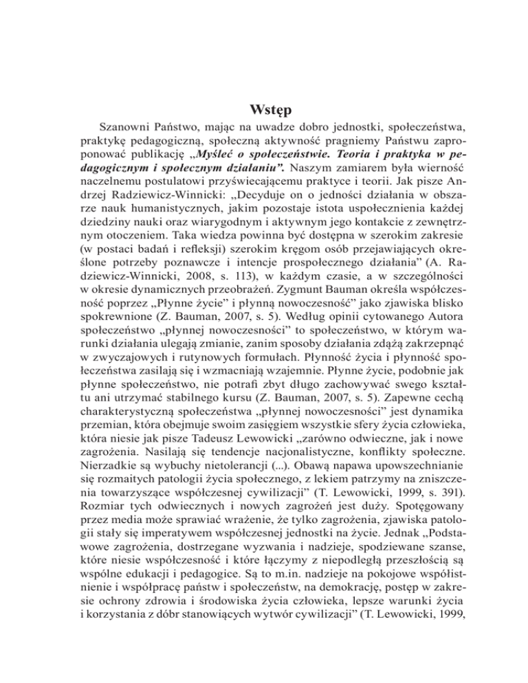 Wstęp Szanowni Państwo, mając na uwadze dobro jednostki, społeczeństwa, praktykę pedagogiczną, społeczną aktywność pragniemy Państwu zaproponować publikację „Myśleć o społeczeństwie. Teoria i praktyka w pedagogicznym i społecznym działaniu”. Naszym zamiarem była wierność naczelnemu postulatowi przyświecającemu praktyce i teorii. Jak pisze Andrzej Radziewicz-Winnicki: „Decyduje on o jedności działania w obszarze nauk humanistycznych, jakim pozostaje istota uspołecznienia każdej dziedziny nauki oraz wiarygodnym i aktywnym jego kontakcie z zewnętrznym otoczeniem. Taka wiedza powinna być dostępna w szerokim zakresie (w postaci badań i refleksji) szerokim kręgom osób przejawiających określone potrzeby poznawcze i intencje prospołecznego działania” (A. Radziewicz-Winnicki, 2008, s. 113), w każdym czasie, a w szczególności w okresie dynamicznych przeobrażeń. Zygmunt Bauman określa współczesność poprzez „Płynne życie” i płynną nowoczesność” jako zjawiska blisko spokrewnione (Z. Bauman, 2007, s. 5). Według opinii cytowanego Autora społeczeństwo „płynnej nowoczesności” to społeczeństwo, w którym warunki działania ulegają zmianie, zanim sposoby działania zdążą zakrzepnąć w zwyczajowych i rutynowych formułach. Płynność życia i płynność społeczeństwa zasilają się i wzmacniają wzajemnie. Płynne życie, podobnie jak płynne społeczeństwo, nie potrafi zbyt długo zachowywać swego kształtu ani utrzymać stabilnego kursu (Z. Bauman, 2007, s. 5). Zapewne cechą charakterystyczną społeczeństwa „płynnej nowoczesności” jest dynamika przemian, która obejmuje swoim zasięgiem wszystkie sfery życia człowieka, która niesie jak pisze Tadeusz Lewowicki „zarówno odwieczne, jak i nowe zagrożenia. Nasilają się tendencje nacjonalistyczne, konflikty społeczne. Nierzadkie są wybuchy nietolerancji (...). Obawą napawa upowszechnianie się rozmaitych patologii życia społecznego, z lekiem patrzymy na zniszczenia towarzyszące współczesnej cywilizacji” (T. Lewowicki, 1999, s. 391). Rozmiar tych odwiecznych i nowych zagrożeń jest duży. Spotęgowany przez media może sprawiać wrażenie, że tylko zagrożenia, zjawiska patologii stały się imperatywem współczesnej jednostki na życie. Jednak „Podstawowe zagrożenia, dostrzegane wyzwania i nadzieje, spodziewane szanse, które niesie współczesność i które łączymy z niepodległą przeszłością są wspólne edukacji i pedagogice. Są to m.in. nadzieje na pokojowe współistnienie i współpracę państw i społeczeństw, na demokrację, postęp w zakresie ochrony zdrowia i środowiska życia człowieka, lepsze warunki życia i korzystania z dóbr stanowiących wytwór cywilizacji” (T. Lewowicki, 1999, Wstęp s. 39) . Współczesny czas współczesna doba nastawiona jest na działanie, na poszukiwanie, rozwiązań, zmian jakościowych w funkcjonowaniu wszystkich dziedzin życia społecznego, również w życiu pedagogicznym, a co zatem idzie, wszelkich form i poziomów edukacji i praktyki pedagogicznej. Wydaje się konieczne skierowanie wszelkich możliwych aktywności, w tym dyskursu pedagogicznego wokół teorii i praktyki pedagogicznej. Działanie to pozwoli na uznanie refleksji, diagnozy, oceny i analizy pedagogicznej, w kontekście odpowiedzialności społecznej, czynników ją warunkujących, które mogą/powinny stać się przyczynkiem do prognozowania, a następnie podejmowanych trafnych decyzji dotyczących pedagogicznego i społecznego działania, z którymi związana jest opieka, pomoc społeczna, praca socjalna jako tradycyjnymi przedmiotami zainteresowań pedagogiki. Współczesny pedagog powinien być przygotowany na rozwiązywanie różnorakich problemów człowieka funkcjonującego w społeczeństwie wielokulturowym, w ponowoczesności, z uwzględnieniem bagażu własnych doświadczeń socjalizacyjnych. Jak pisze Bogusław Śliwerski: „Być pedagogiem to przecież także w jakiejś mierze sprawowanie delegowanej przez rodziców czy społeczeństwo władzy „nad rządem dusz ludzkich” (B. Śliwerski, 2011, s. 77). Prezentowana praca składa się z trzech części/rozdziałów. Pierwszy został zatytułowany – „Wybrane problemy funkcjonowania współczesnego człowieka”, drugi – „Dylematy wspólczesnej pracy socialnej”, natomiast trzeci – „Problemy współczesnej rodziny”. W opinii redaktorów naukowych zaproponowane tytuły i przedstawione treści rozdziałów w części pierwszej, drugiej jak i trzeciej oddają istotę proponowanej problematyki zagadnień. Każdy z nich składa się ze wstępu/wprowadzenia, podrozdziałów, a po podsumowaniu/zakończeniu, wnioskach każdego tekstu wskazano użytą w nim literaturę. Przedstawiona poniżej, wyjątkowo skrótowo, tematyka artykułów ma na celu zainteresowanie Szanownego Czytelnika prezentowaną problematyką. Część pierwszą: Wybrane problemy funkcjonowania współczesnego człowieka otwiera artykuł ks. profesora Czesława Cekiery: Człowiek w świecie uzależnień. Zawarta, teza, iż „Człowiek uzależniony w świecie współczesnym stanowi poważny problem społeczny, medyczny, psychologiczny i pedagogiczny”. Uzależnienie od środków psychotropowych i od aktywności (hazard, gry komputerowe) oraz od środków audiowizualnych (komputer, TV, komórka) stanowią poważne zagrożenie dla zdrowi, i życia” nie brzmi optymistycznie. Jednak wskazania do działań profilaktycznych osadzonych w środowisku rodzinnym, szkoły na wartościach wyższych jest dobrą prognozą do przeciwdziałania patologiom. Teoretyczno-praktyczne implikacje nowej analizy instytucjonalnej i jej przydatność w ocenie skutków transformacji prezentuje Iwona Wagner. Autorka zwraca uwagę 10 Wstęp na problem analizy instytucjonalnej jako jeden z kierunków badań różnych typów ładu społecznego i jego zmian instytucjonalnych. W wielosektorowej polityce społ