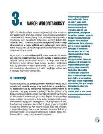 3. Nabór wolontariuszy Wybór odpowiedniej osoby do pracy w naszej organizacji lub do pracy z osobami potrzebującymi gwarantuje późniejszy sukces realizowanych projektów i zadowolenie osób, które wspieramy. To samo dotyczy wyboru odpowiednich wolontariuszy, którzy zaangażowani będą w pracę społeczną. Dobrze skonstruowana oferta i skutecznie przeprowadzona promocja znajdzie swoje odzwierciedlenie w liczbie aplikacji osób spełniających nasze oczekiwania. Pozostaje nam już wtedy tylko przeprowadzenie dobrej selekcji wśród kandydatów, którzy się zgłosili. Nie jest to proces łatwy. Pamiętajmy jednak zawsze o szacunku dla wszystkich, z którymi się spotykamy oraz o docenieniu tego, że poświęcają nam swój czas. Bądźmy również ostrożni, aby nie urazić nikogo, nawet wówczas gdy będziemy musieli odmówić. Nasze kontakty i spotkania z kandydatami muszą być prowadzone w sposób profesjonalny i rzetelny. Za proces rekrutacji wolontariuszy odpowiedzialna jest osoba zarządzająca wolontariatem w organizacji (koordynator wolontariuszy). III.1 Rekrutacja Przeprowadzając rekrutację, zawsze powinniśmy kierować się zasadą poszanowania woli niesienia pomocy przez kandydatów na wolontariuszy. Nie zapomnijmy więc, by podziękować wszystkim zainteresowanym za zgłoszenie i chęć pracy w naszej organizacji. Z każdym zgłaszającym się do nas wolontariuszem powinniśmy jak najszybciej się skontaktować (mailowo lub telefonicznie) i poinformować go o naszej decyzji i dalszym przebiegu naboru, przekazać mu informacje na temat terminu spotkania rekrutacyjnego, odpowiedzieć na jego pytania. Przebieg procesu zależeć będzie m.in. od tego, ilu wolontariuszy szukamy i do jakich zadań. W sytuacji, gdy do realizacji akcji na dużą skalę potrzebne jest nam wsparcie większej liczby osób, wystarczy, że zorganizujemy jedno, dwa grupowe spotkania informacyjne. Jeśli jednak potrzebujemy osób o specyficznych umiejętnościach, niezbędne będą indywidualne spotkania z każdym z wytypowanych kandydatów. W informacjach dotyczących naborów Fundacja „Dobrze Że Jesteś” podaje skrót najważniejszych informacji: wolontariusz pracuje raz w tygodniu, najwyżej pięć godzin dziennie. Chodzi przede wszystkim o obecność i wsparcie. Nie są wymagane umiejętności medyczne ani wcześniejsze doświadczenia. Ważną informacją jest to, że chodzi o opiekę nad dorosłymi. Na spotkaniach informacyjnych jest też czas, aby odpowiedzieć na pytania zainteresowanych. Dlaczego to ważne? Podawanie podstawowych informacji oraz organizowanie spotkań informacyjnych usprawnia nabór kandydatów. Odpowiednio wcześnie mogą zrezygnować osoby oczekujące innego rodzaju pracy. Dobrze przeprowadzona rekrutacja pozwala na pozyskanie wolontariuszy, którzy od początku będą świadomi zadań, jakie na nich czekają. (Fundacja „Dobrze Że Jesteś” pracuje z pacjentami oddziałów onkologicznych i hematologicznych). 21 Spotkanie informacyjno-organizacyjne dla dużych grup Jednym ze sposobów rekrutacji jest zorganizowanie spotkania dla grupy zainteresowanych. Sprawdza się to zwłaszcza w przypadku wolontariatu akcyjnego. Spotkanie może mieć charakter informacyjny – po przedstawieniu się mamy okazję przybliżyć naszą organizację, omówić cel projektu, powody, dla których się nim zajęliśmy, oraz zadania, do realizacji których poszukujemy wolontariuszy. To dobra okazja, by ukazać także wzajemne korzyści ze współpracy oraz odpowiedzieć na pytania i rozwiać wątpliwości. Na koniec możemy rozdać formularze zgłoszeniowe, które złożą wszyscy, którzy zdecydują się podjąć współpracę. Kontynuacją tego spotkania powinno być kolejne o charakterze czysto organizacyjnym. Udział powinny w nim wziąć tylko te osoby, które ostatecznie potwierdzą swoje zaangażowanie. Podczas spotkania organizacyjnego przejdźmy krok po kroku przez wszystkie zadania wolontariuszy oraz omówmy zasady współpracy. Wyposażmy też wolontariuszy w niezbędne narzędzia i/lub materiały. Spotkania informacyjnoorganizacyjne są formą rekrutacji wykorzystywaną przede wszystkim podczas wolontariatu akcyjnego, gdzie mamy wielu zainteresowanych, a brakuje nam czasu na indywidualne spotkania z każdym z ochotników. Rozmowa indywidualna Jeżeli poszukujemy osób z określonymi kompetencjami czy też specyficznymi umiejętnościami, ale także osób, które cechować powinna szczególna wrażliwość, konieczne jest przeprowadzenie indywidualnej rozmowy. Znajdźmy do tego komfortowe miejsce – pomieszczenie, w którym nikt nam nie będzie przeszkadzał. Przygotujmy niezbędne materiały: coś do robienia notatek, informacje o naszej organizacji, opis zadań i zakres obowiązków wolontariusza. Przed spotkaniem przeanalizujemy raz jeszcze przesłane przez kandydata dokumenty/formularze. Przygotujmy się do rozmowy, opracujmy zestaw pytań, które pomogą nam lepiej poznać daną osobę i podjąć właściwą decyzję. Pamiętajmy o miłej i przyjaznej atmosferze podczas takiego spotkania. Rozmówca powinien czuć się swobodnie, powinien się przed nami otworzyć. To nie może być spotkanie rekrutacyjne, jakie przeprowadza się z kandydatem na etat. Rozmawiamy z ochotnikiem, który chce nam pomóc. Na początku przedstawmy naszą organizację oraz zasady w niej panujące. Następnie zaprezentujmy projekt oraz zadania wolontariusza z nim związane. Na kolejnym etapie zapytajmy kandydata o kwestie najważniejsze z perspektywy naszego projektu i organizacji, poczynając od tych standardowych: Dlaczego jesteś zainteresowany wolontariatem u nas/w tego rodzaju przedsięwzięciu? Jakie są twoje oczekiwania w stosunku do naszej organizacji? Przejdźmy później do pytań szczegółowych, ściśle związanych z charakterem przeznaczonych dla wolontariusza zadań. Zarezerwujmy też czas na pytania wolontariusza. Pamiętajmy, by na takim spotkaniu jak najbardziej szczegółowo 