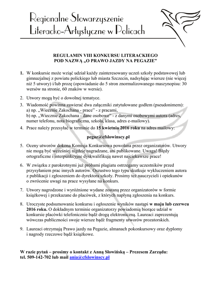 REGULAMIN VIII KONKURSU LITERACKIEGO POD NAZWĄ „O PRAWO JAZDY NA PEGAZIE” 1. W konkursie może wziąć udział każdy zainteresowany uczeń szkoły podstawowej lub gimnazjalnej z powiatu polickiego lub miasta Szczecin, nadsyłając wiersze (nie więcej niż 5 utwory) i/lub prozę (opowiadanie do 5 stron znormalizowanego maszynopisu: 30 wersów na stronie, 60 znaków w wersie). 2. Utwory mogą być o dowolnej tematyce. 3. Wiadomość powinna zawierać dwa załączniki zatytułowane godłem (pseudonimem): a) np. „Wiecznie Zakochana - prace” - z pracami, b) np. „Wiecznie Zakochana - dane osobowe” - z danymi osobowymi autora (adres, numer telefonu, nota biograficzna, szkoła, klasa, adres e-mailowy). 4. Prace należy przesyłać w terminie do 15 kwietnia 2016 roku na adres mailowy: [email protected] 5. Oceny utworów dokona Komisja Konkursowa powołana przez organizatorów. Utwory nie mogą być wcześniej nigdzie nagradzane, ani publikowane. Uwaga! Błędy ortograficzne i interpunkcyjne dyskwalifikują nawet najciekawsze prace! 6. W związku z parokrotnymi już próbami plagiatu ostrzegamy uczestników przed przysyłaniem prac innych autorów. Oszustwo tego typu skutkuje wykluczeniem autora z publikacji i zgłoszeniem do dyrektora szkoły. Prosimy też nauczycieli i opiekunów o zwrócenie uwagi na prace wysyłane na konkurs. 7. Utwory nagrodzone i wyróżnione wydane zostaną przez organizatorów w formie książkowej i przekazane do placówek, z których napłyną zgłoszenia na konkurs. 8. Uroczyste podsumowanie konkursu i ogłoszenie wyników nastąpi w maju lub czerwcu 2016 roku. O dokładnym terminie organizatorzy powiadomią biorące udział w konkursie placówki telefonicznie bądź drogą elektroniczną. Laureaci zaprezentują wówczas publiczności swoje wiersze bądź fragmenty utworów prozatorskich. 9. Laureaci otrzymają Prawo jazdy na Pegazie, almanach pokonkursowy oraz dyplomy i nagrody rzeczowe bądź książkowe. W razie pytań – prosimy o kontakt z Anną Słowińską – Prezesem Zarządu: tel. 509-142-702 lub mail [email protected]