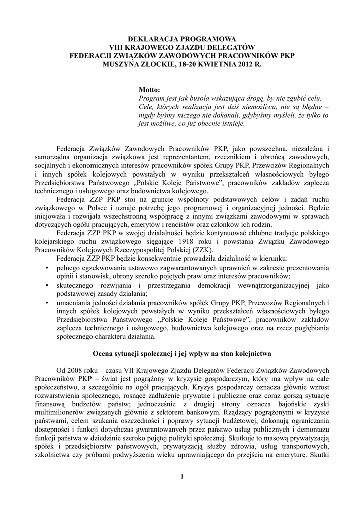 deklaracja programowa viii krajowego zjazdu delegatów fzzp pkp