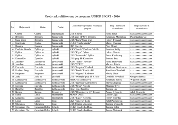 Osoby zakwalifikowane do programu JUNIOR SPORT - 2016 Lp. 1 2 3 4 5 6 7 8 9 10 11 12 13 14 15 16 17 18 19 20 21 22 23 24 25 26 Miejscowość Czarna Brzozów Stara Wieś Grabówka Haczów Pustków Osiedle Dębica Dębica Korzeniów Jarosław Jarosław Pruchnik Rozbórz Długi Radymno Jasło Kolbuszowa Kolbuszowa Niwiska Raniżów Krosno Dukla Korczyna Lesko Olszanica Grodzisko Dln. Grodzisko Dln. Gmina Czarna Brzozów Brzozów Dydnia Haczów Dębica gm. Dębica m. Dębica m. Żyraków Jarosław m. Jarosław m. Pruchnik Pruchnik Radymno Jasło m. Kolbuszowa Kolbuszowa Niwiska Raniżów Krosno Dukla Korczyna Lesko Olszanica Grodzisko Dolne Grodzisko Dolne Powiat bieszczadzki brzozowski brzozowski brzozowski brzozowski dębicki dębicki dębicki dębicki jarosławski jarosławski jarosławski jarosławski jarosławski jasielski kolbuszowski kolbuszowski kolbuszowski kolbuszowski Krosno gr. krośnieński krośnieński leski leski leżajski leżajski Jednostka bezpośrednio realizująca program UKS Czarna UKS przy SP Nr 1 Brzozów UKS "Iskra" Stara Wieś ULKS "Grabowianka" LKS Haczów KS "Chemik" Pustków Osiedle UKS "Kępa" Dębica UKS "Jedenastka" Dębica UKS przy SP Korzeniów KSW "Sokół" Jarosław UKS "TOP-9" UKS "Jedynka" Pruchnik UKS "Fortis" Rozbórz Dł. UKS "Giganci" Radymno UKS "Olimpia" przy SP 4 Jasło FnRKFiS Kolbuszowa UKS "Jedynka" Kolbuszowa UKS "Niwa" Niwiska Stow. Gm. Raniżów UKS "Olimpijczyk 143" Krosno MOSiR Dukla UKS "Ligol" Korczyna LKS "Sanovia" Lesko UKS Uherce Mineralne GUKS Grodzisko Dolne GUKS Grodzisko Górne Imię i nazwisko I szkoleniowca Jacek Bihun Katarzyna Michalska Hubert Tymczak Maciej Oleniacz Piotr Ekiert Jarosław Kulig Łukasz Nowak Paweł Konieczny Bernard Stec Jacek Bronowski Mariusz Litwin Waldemar Wańkowicz Stanisław Olszański Maciej Lizoń Dominik Kowalski Katarzyna Panek Marek Krogulec Zbigniew Fryc Tomasz Lis Antoni Bykowski Daniel Ożga Hubert Wierdak Rafał Paszkowski Tomasz Winiarski Tomasz Sołek Roman Matuszek Imię i nazwisko II szkoleniowca xxxxxxxxxxxxxxxxxxx Paweł Jurkiewicz xxxxxxxxxxxxxxxxxxx xxxxxxxxxxxxxxxxxxx xxxxxxxxxxxxxxxxxxx xxxxxxxxxxxxxxxxxxx xxxxxxxxxxxxxxxxxxx xxxxxxxxxxxxxxxxxxx xxxxxxxxxxxxxxxxxxx xxxxxxxxxxxxxxxxxxx xxxxxxxxxxxxxxxxxxx xxxxxxxxxxxxxxxxxxx xxxxxxxxxxxxxxxxxxx xxxxxxxxxxxxxxxxxxx Grzegorz Janusz Wojciech Szydło xxxxxxxxxxxxxxxxxxx xxxxxxxxxxxxxxxxxxx xxxxxxxxxxxxxxxxxxx Jakub Heimroth xxxxxxxxxxxxxxxxxxx xxxxxxxxxxxxxxxxxxx xxxxxxxxxxxxxxxxxxx xxxxxxxxxxxxxxxxxxx xxxxxxxxxxxxxxxxxxx xxxxxxxxxxxxxxxxxxx 27 28 29 30 31 32 33 34 35 36 37 38 39 40 41 42 43 44 45 46 47 48 49 50 51 52 53 54 55 56 57 58 59 Wierzawice Leżajsk Leżajsk Horyniec-Zdrój Wielkie Oczy Białobrzegi Czarna Sonina Łańcut Gawłuszowice Wola Mielecka Jeżowe Jeżowe Nisko Krasiczyn Babice Medyka Ostrów Żurawica Żurawica Przemyśl Dębów Jawornik Polski Manasterz Krzeczowice Przeworsk Przeworsk Zarzecze Zarzecze Skrzyszów Lubzina Ropczyce Błażowa Leżajsk gm. Leżajsk m. Leżajsk m. Horyniec-Zdrój Wielkie Oczy Białobrzegi Czarna Łańcut gm. Łańcut m. Gawluszowice Mielec gm. Jeżowe Jeżowe Nisko m. Krasiczyn Krzywcza Medyka Przemyśl gm. Żurawica Żurawica Przemyśl m. Gać Jawornik Polski Jawornik Polski Kańczuga Przeworsk m. Przeworsk m. Zarzecze Zarzecze Ostrów Ropczyce Ropczyce Błażowa leżajski leżajski leżajski lubaczowski lubaczowski łańcucki łańcucki łańcucki łańcucki mielecki mielecki niżański niżański niżański przemyski przemyski przemyski przemyski przemyski przemyski Przemyśl gr. przeworski przeworski przeworski przeworski przeworski przeworski przeworski przeworski ropczycko-sędz. ropczycko-sędz. ropczycko-sędz. rzeszowski UKS "Lotnik" Wierzawice MOSiR Leżajsk UKS przy SP Nr 2 Leżajsk LKS "Zdrój" Horyniec - Zdrój UKS "Orzeł" Wielkie Oczy CS-R przy Gim. Białobrzegi LKS "Wisłok" Czarna UKS "Soninianka" Sonina ŁKS "Stal" Łańcut UKS "Atlas" Gawłuszowice UKS "Start" Wola Mielecka UKS "Olimpia" Jeżowe UKS "Sparta" Jeżowe UKS Nisko MUKS "Zamek" Krasiczyn PKS "Unum" Babice UKS "Jagiellonka" Medyka "ADSUM" SMoSOiZP LKS "Żurawianka" Żurawica UKS "Pancernia" Żurawica UKS przy SP Nr 14 Przemyśl UKS "Azymut" Dębów KS "Iskra" GOK Jawornik Polski UKS "Kmicic" Manasterz UKS "Feniks" Krzeczowice UKS "Olimpia" Przeworsk UKS "Jedynka" Przeworsk ULKS "Olimpia" Zarzecze UKS "Koliber" Zarzecze UKS "Orzeł" Skrzyszów LUKS Lubzina UKS "Sokół" Ropczyce LKS "Błażowianka" Błażowa Tadeusz Konnak xxxxxxxxxxxxxxxxxxx Tomasz Szmuc Konrad Welter Teresa Dydacka-Jarek xxxxxxxxxxxxxxxxxxx Barbara Jóźwik-Przednowek xxxxxxxxxxxxxxxxxxx Krzysztof Milo xxxxxxxxxxxxxxxxxxx Piotr Pomykała xxxxxxxxxxxxxxxxxxx Paweł Bróż xxxxxxxxxxxxxxxxxxx Witold Kuźniar xxxxxxxxxxxxxxxxxxx Adam Naróg xxxxxxxxxxxxxxxxxxx Grzegorz Nelec xxxxxxxxxxxxxxxxxxx Justyna Gąbka xxxxxxxxxxxxxxxxxxx Dawid Kiper xxxxxxxxxxxxxxxxxxx Krzysztof Kida xxxxxxxxxxxxxxxxxxx Andrzej Błądek xxxxxxxxxxxxxxxxxxx Marek Kuźmiek xxxxxxxxxxxxxxxxxxx Krzysztof Wanat xxxxxxxxxxxxxxxxxxx Bartłomiej Górka xxxxxxxxxxxxxxxxxxx Grzegorz Kozioł Bartosz Krucan Jerzy Sadowski-Frączek xxxxxxxxxxxxxxxxxxx Maria Korczyńska xxxxxxxxxxxxxxxxxxx Piotr Kroczek xxxxxxxxxxxxxxxxxxx Maria Ziętek-Leśnicka xxxxxxxxxxxxxxxxxxx Tadeusz Pieniądz xxxxxxxxxxxxxxxxxxx Urszula Targońska xxxxxxxxxxxxxxxxxxx Jerzy Zając xxxxxxxxxxxxxxxxxxx Marian Pieniążek Danuta Piekło Wojciech Jurkiewicz Witold Kruk Krzysztof Warchoł xxxxxxxxxxxxxxxxxxx Zygmunt Szumilak xxxxxxxxxxxxxxxxxxx Marzena Sokołowska-Andreasik xxxxxxxxxxxxxxxxxxx Andrzej Jedynak xxxxxxxxxxxxxxxxxxx Edyta Jedynak xxxxxxxxxxxxxxxxxxx Tomasz Drewniak xxxxxxxxxxxxxxxxxxx 60 61 62 63 64 65 66 67 68 69 70 71 72 73 74 75 76 77 78 79 80 Dynów Lubenia Sokołów Młp. Rzeszów Tyrawa Wołoska Odrzechowa Jastkowice Stalowa Wola Zaklików Zaleszany Czudec Czudec Gogołów Grodzisko Strzyżów Różanka Wiśniowa Tarnobrzeg Skopanie Żupawa Nowa Dęba Dynów m. Lubenia Sokołów Młp. Rzeszów m. T
