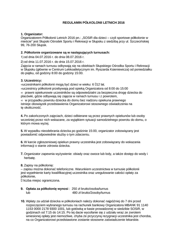 REGULAMIN PÓŁKOLONII LETNICH 2016 1. Organizator: Organizatorem Półkolonii Letnich 2016 pn.: „SOSiR dla dzieci – czyli sportowe półkolonie w mieście” jest Słupski Ośrodek Sportu i Rekreacji w Słupsku z siedzibą przy ul. Szczecińskiej 99, 76-200 Słupsk. 2. Półkolonie organizowane są w następujących turnusach: 1) od dnia 04.07.2016 r. do dnia 08.07.2016 r. 2) od dnia 11.07.2016 r. do dnia 15.07.2016 r. Zajęcia w ramach turnusu odbywają się na obiektach Słupskiego Ośrodka Sportu i Rekreacji w Słupsku (głównie w Centrum Lekkoatletycznym im. Ryszarda Ksieniewicza) od poniedziałku do piątku, od godziny 8:00 do godziny 15:00. 3. Uczestnicy: • uczestnikami półkolonii mogą być dzieci w wieku: 6 ‐12 lat. • uczestnicy półkolonii przebywają pod opieką Organizatora od 8:00 do 15:00 • prawni opiekunowie uczestników są odpowiedzialni za bezpieczna drogę dziecka do placówki, gdzie odbywają się zajęcia w ramach turnusu i z powrotem, • w przypadku powrotu dziecka do domu bez nadzoru opiekuna prawnego istnieje obowiązek przedstawienia Organizatorowi stosownego oświadczenia na tę okoliczność. 4. Po zakończonych zajęciach, dzieci odbierane są przez prawnych opiekunów lub osoby wcześniej przez nich wskazane, za wyjątkiem sytuacji samodzielnego powrotu do domu, o którym mowa wyżej. 5. W wypadku nieodebrania dziecka po godzinie 15:00, organizator zobowiązany jest powiadomić odpowiednie służby o tym zdarzeniu. 6. W karcie zgłoszeniowej opiekun prawny uczestnika jest zobowiązany do wskazania informacji o stanie zdrowia dziecka. 7. Organizator zapewnia wyżywienie: obiady oraz owoce lub lody, a także dostęp do wody i herbatę. 8. Zapisy na półkolonię: – zapisu można dokonać telefoniczne. Warunkiem uczestnictwa w turnusie półkolonii jest wypełnienie karty kwalifikacyjnej uczestnika oraz uregulowanie całości opłaty za półkolonie, ‐ liczba miejsc ograniczona. 9. Opłata za półkolonię wynosi : 250 zł brutto/osoba/turnus lub 480 zł brutto/2osoby/turnus 10. Wpłaty za udział dziecka w półkoloniach należy dokonać najpóźniej do 7 dni przed rozpoczęciem wybranego turnusu na rachunek bankowy Organizatora MBANK 91 1140 1153 0000 2178 9300 1001, lub gotówką w kasie prowadzonej w siedzibie SOSiR, w godzinach od 7:15 do 14:15. Po tej dacie wycofanie się z udziału wraz ze zwrotem wniesionej opłaty jest niemożliwe, chyba że przyczyną rezygnacji uczestnika jest choroba, na co Organizatorowi przedstawione zostanie stosowne zaświadczenie lekarskie. W przypadku choroby dziecka uniemożliwiającej udział w półkoloniach, Klientowi w ramach wniesionych opłat przysługuje prawo do skorzystania z innego turnusu na zasadach pierwszeństwa. W przypadku braku możliwości skorzystania z innego turnusu, Klient ma prawo do zwrotu wniesionych opłat w wysokości 70% ceny za każdy niewykorzystany dzień pobytu 11. Prawa uczestnika półkolonii: • udział we wszystkich zajęciach, wyjściach m.in. do Parku Linowego i Parku Trendla organizowanych w czasie trwania turnusu, • korzystanie ze wszystkich atrakcji, urządzeń i sprzętów przewidzianych do realizacji programu półkolonii. 12. Obowiązki uczestnika półkolonii: • stosowanie się do zapisów wewnętrznych regulaminów zajęć prowadzonych przez opiekunów oraz instruktorów, • stosowanie się do poleceń kierownika, wychowawcy i instruktorów półkolonii, • branie udziału we wszystkich zajęciach programowych, przewidzianych w trakcie turnusu. Zwolnienie z udziału w w/w może nastąpić jedynie przez wychowawcę lub lekarza, • przestrzeganie ramowego harmonogramu dnia, • przestrzeganie zasad bezpieczeństwa, a w razie jakiegokolwiek zagrożenia życia lub zdrowia uczestnika półkolonii lub osoby trzeciej poinformowanie kierownika lub wychowawcy półkolonii, zachowanie higieny osobistej, schludnego wyglądu i czystości w swoim otoczeniu, • szanowanie mienia, pomocy dydaktycznych, • kulturalne zachowanie podczas spożywania posiłków, • przestrzeganie zasad ruchu drogowego. 13. Organizatorzy ferii zobowiązuje się do zapewnienia: • ubezpieczenia uczestników półkolonii od następstw nieszczęśliwych wypadków, • 1 ciepłego posiłku dziennie, • wykwalifikowanej opieki pedagogicznej oraz kadry instruktorskiej do zajęć sportowych, • realizacji zajęć zgodnych z programem półkolonii, • materiałów do zajęć, • natychmiastowego powiadomienia rodziców lub opiekunów uczestnika ferii o zaistniałych wypadkach, urazach, problemach wychowawczych, • infrastruktury do realizacji programu półkolonii z zachowaniem zasad BHP i ppoż. oraz zapewnieniu podstawowej opieki medycznej 14. Za wszelkie szkody wyrządzone przez dziecko innym uczestnikom półkolonii oraz osobom trzecim odpowiedzialni są jego opiekunowie prawni. 15. Odszkodowanie z tytułu wyrządzonej przez uczestnika szkody pokrywają w całości jego opiekunowie prawni. 16. Organizator zastrzega sobie prawo do zmiany ustalonego programu zajęć, który dostępny będzie do wglądu u Kierownika półkolonii. 17. Regulamin obowiązuje wszystkich Uczestników, Wychowawców i Kierownika półkolonii. • 18. Wykaz przedmiotów potrzebnych do udziału w zajęciach podczas półkolonii letnich: • drugie śniadanie • obuwie zmienne (trampki, adidasy), • okrycie głowy, woda • strój kąpielowy, ręcznik – podczas wyjścia do Parku Trendla 19. Samowolne oddalenie się przez uczestnika z miejsca, gdzie odbywają się zajęcia, jakakolwiek inna niesubordynacja, niezdyscyplinowanie, niewykonywanie poleceń wychowawców, nieprzestrzeganie regulaminu będzie karane upomnieniem, naganą , a w ostateczności wykluczeniem uczestnika z udziału w półkoloniach. 20.W sprawach nieuregulowanych przedmiotowym regulaminem odpowiednie zastosowanie znajdą przepisy rozporządzenia MINISTRA EDUKACJI NARODOWEJ z dnia 30 marca 2016 r. w sprawie wypoczynku dzieci i młodzieży. Org