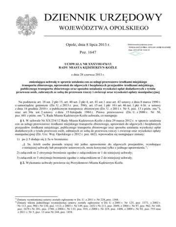 DZIENNIK URZĘDOWY WOJEWÓDZTWA OPOLSKIEGO Opole, dnia 8 lipca 2013 r. Elektronicznie podpisany przez: TERESA MATCZYŃSKA; OPOLSKI URZĄD WOJEWÓDZKI Poz. 1647 Data: 2013-07-08 15:05:15 UCHWAŁA NR XXXVIII/476/13 RADY MIASTA KĘDZIERZYN-KOŹLE z dnia 28 czerwca 2013 r. zmieniająca uchwałę w sprawie ustalenia cen za usługi przewozowe środkami miejskiego transportu zbiorowego, uprawnień do ulgowych i bezpłatnych przejazdów środkami miejskiego, publicznego transportu zbiorowego oraz sposobu ustalania wysokości opłat dodatkowych z tytułu przewozu osób, zabranych ze sobą do przewozu rzeczy i zwierząt oraz wysokości opłaty manipulacyjnej Na podstawie art. 18 ust. 2 pkt 15, art. 40 ust. 2 pkt 4, art. 41 ust.1 oraz art. 42 ustawy z dnia 8 marca 1990 r. o samorządzie gminnym (Dz. U. z 2013 r. poz. 594), art. 15 ust. 1 pkt 10 i art. 46 ust. 1 pkt 6 lit. a ustawy z dnia 16 grudnia 2010 r. o publicznym transporcie zbiorowym (Dz. U. z 2011 r. Nr 5, poz. 13 z późn. zm.1)), oraz art. 34a ust. 2 ustawy z dnia 15 listopada 1984 r. Prawo przewozowe (Dz. U. z 2000 r. Nr 50, poz. 601 z późn. zm.2)), Rada Miasta Kędzierzyn-Koźle uchwala, co następuje: § 1. W uchwale Nr XX/254/12 Rady Miasta Kędzierzyn-Koźle z dnia 29 marca 2012 r. w sprawie ustalenia cen za usługi przewozowe środkami miejskiego transportu zbiorowego, uprawnień do ulgowych i bezpłatnych przejazdów środkami miejskiego, publicznego transportu zbiorowego oraz sposobu ustalania wysokości opłat dodatkowych z tytułu przewozu osób, zabranych ze sobą do przewozu rzeczy i zwierząt oraz wysokości opłaty manipulacyjnej (Dz. Urz. Woj. Opolskiego z 2012 r. poz. 662), wprowadza się następujące zmiany: 1) po § 5 dodaje się § 5a w brzmieniu: „§ 5a. Jeżeli osoba posiada więcej niż jedno uprawnienie do ulgowych przejazdów, wynikające z niniejszej uchwały lub przepisów ustawowych, może korzystać tylko z jednego uprawnienia.”; 2) załącznik nr 2 otrzymuje brzmienie zgodne z załącznikiem nr 1 do niniejszej uchwały; 3) załącznik nr 3 otrzymuje brzmienie zgodne z załącznikiem nr 2 do niniejszej uchwały. § 2. Wykonanie uchwały powierza się Prezydentowi Miasta Kędzierzyn-Koźle. 1) 2) Zmiany wymienionej ustawy zostały ogłoszone w Dz. U. z 2011 r. Nr 228, poz. 1368. Zmiany tekstu jednolitego wymienionej ustawy zostały ogłoszone w Dz. U. z 2001 r. Nr 125, poz. 1371, z 2002 r. Nr 113, poz. 984 i Nr 130, poz. 1112, z 2003 r. Nr 149, poz. 1452 i Nr 211, poz. 2049, z 2004 r. Nr 97, poz. 962, Nr 160, poz. 1678 i Nr 281, poz. 2780, z 2006 r. Nr 133, poz. 935, z 2008 r. Nr 219, poz. 1408, z 2009 r. Nr 92, poz. 753 oraz z 2011 r. Nr 5, poz. 13 oraz Nr 244, poz. 1454. Dziennik Urzędowy Województwa Opolskiego –2– Poz. 1647 § 3. Uchwała podlega ogłoszeniu w Dzienniku Urzędowym Województwa Opolskiego i wchodzi w życie po upływie 14 dni od dnia ogłoszenia. Przewodniczący Rady Miasta Kędzierzyn-Koźle Wojciech Jagiełło Dziennik Urzędowy Województwa Opolskiego –3– Poz. 1647 Załącznik Nr 1 do Uchwały Nr XXXVIII/476/13 Rady Miasta Kędzierzyn-Koźle z dnia 28 czerwca 2013 r. Sposób ustalania wysokości opłat dodatkowych z tytułu przewozu osób, zabranych ze sobą do przewozu rzeczy i zwierząt oraz wysokość opłaty manipulacyjnej Lp. Rodzaj opłaty opłata dodatkowa za przejazd bez odpowiedniego dokumentu przewo1. zu 2. 3. 4. 5. 6. Wysokość opłaty dodatkowej 260,00 zł, to jest 100-krotność najtańszego biletu jednorazowego normalnego za niewypisany bilet okresowy imienny 104,00 zł, to jest 40-krotność najtańszego biletu jednorazowego normalnego opłata dodatkowa za przejazd bez ważnego dokumentu poświadczają104,00 zł, to jest 40-krotność cego uprawnienie do przejazdu bezpłatnego lub ulgowego najtańszego biletu jednorazowego normalnego opłata dodatkowa za zabranie ze sobą do autobusu rzeczy wyłączonych 104,00 zł, to jest 40-krotność z przewozu albo rzeczy dopuszczonych do przewozu na warunkach najtańszego biletu jednorazowego szczególnych, bez zachowania tych warunków normalnego opłata dodatkowa za spowodowanie przez pasażera, bez uzasadnionej 520,00 zł, to jest 200-krotność przyczyny (w tym również związanej z koniecznością ustalenia jego najtańszego biletu jednorazowego tożsamości) zatrzymania lub zmiany trasy autobusu normalnego opłatę manipulacyjną ustala się, uwzględniając ponoszone przez prze- 10,40 zł, to jest 4-krotność najtańwoźnika koszty czynności związanych ze zwrotem albo umorzeniem szego biletu jednorazowego noropłaty dodatkowej malnego Dziennik Urzędowy Województwa Opolskiego –4– Poz. 1647 Załącznik Nr 2 do Uchwały Nr XXXVIII/476/13 Rady Miasta Kędzierzyn-Koźle z dnia 28 czerwca 2013 r. Uprawnienia gminne do przejazdów bezpłatnych środkami lokalnego transportu zbiorowego w granicach administracyjnych Miasta Kędzierzyn-Koźle Lp. Osoby uprawnione do przejazdów bezpłatnych 1. Dzieci w wieku do 3 lat. 2. Osoby, które ukończyły 70 rok życia. 3. Osoby całkowicie niezdolne do pracy i samodzielnej egzystencji (dawna I grupa inwalidzka) oraz osoby o znacznym stopniu niepełnosprawności wraz z opiekunem towarzyszącym im w pojeździe. 4. Podstawa uprawnienia, dokument poświadczający uprawnienie Oświadczenie opiekuna lub dokument stwierdzający wiek dziecka Dokument potwierdzający wiek i tożsamość, a w przypadku obywateli państw członkowskich Unii Europejskiej – odpowiedni dokument wystawiony przez uprawniony organ. Wypis z orzeczenia właściwej komisji lekarskiej do spraw inwalidztwa i zatrudnienia, stwierdzający zaliczenie do I grupy inwalidzkiej, wypis z orzeczenia lekarza orzecznika ZUS (rzeczoznawcy KRUS) stwierdzającego całkowitą niezdolność do pracy i samodzielnej egzystencji, wypis z orzeczenia właściwego organu stwierdzający znaczny stopień niepełnosprawności, zaświadczenie ZUS stwierdzające zaliczenie wyrokiem sądu do I grupy inwalidzkiej bądź uznanie w tym 