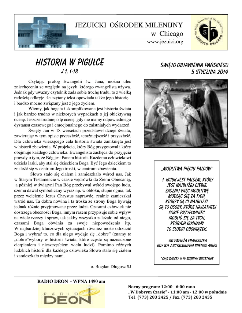 JEZUICKI OŚRODEK MILENIJNY w Chicago www.jezuici.org historia w pigułce ŚWIĘTO Objawienia pańskiego 5 stycznia 2014 J 1, 1-18 Czytając prolog Ewangelii św. Jana, można ulec zniechęceniu ze względu na język, którego ewangelista używa. Jednak gdy uważny czytelnik zada sobie trochę trudu, to z wielką radością odkryje, że czytany tekst opowiada także jego historię i bardzo mocno związany jest z jego życiem. Wiemy, jak bogata i skomplikowana jest historia świata i jak bardzo trudno w niektórych wypadkach o jej obiektywną ocenę. Jeszcze trudniej o tę ocenę, gdy nie mamy odpowiedniego dystansu czasowego i emocjonalnego do zaistniałych wydarzeń. Święty Jan w 18 wersetach przedstawił dzieje świata, zawierając w tym opisie przeszłość, teraźniejszość i przyszłość. Dla człowieka wierzącego cała historia świata zamknięta jest w historii zbawienia. W projekcie, który Bóg przygotował i który obejmuje każdego człowieka. Ewangelista zachęca do przyjęcia prawdy o tym, że Bóg jest Panem historii. Każdemu człowiekowi udziela łaski, aby stał się dzieckiem Boga. Być Jego dzieckiem to znaleźć się w centrum Jego troski, w centrum zbawienia. Słowo stało się ciałem i zamieszkało wśród nas. Jak w Starym Testamencie w czasie wędrówki do Ziemi Obiecanej, a później w świątyni Pan Bóg przebywał wśród swojego ludu, czemu dawał symboliczny wyraz np. w obłoku, słupie ognia, tak przez wcielenie Jezus Chrystus naprawdę, realnie zamieszkał wśród nas. Ta dobra nowina i ta troska ze strony Boga bywają jednak różnie przyjmowane przez ludzi. Czasami człowiek nie dostrzega obecności Boga, innym razem przypisuje sobie wpływ na wiele rzeczy i spraw, tak jakby wszystko zależało od niego, czasami Boga obwinia za swoje niepowodzenia itp. W najbardziej kluczowych sytuacjach również może odrzucić Boga i wybrać to, co dla niego wydaje się „dobre” (znamy te „dobre”wybory w historii świata, które często są naznaczone cierpieniem i nieszczęściem wielu ludzi). Pomimo różnych ludzkich historii dla każdego człowieka Słowo stało się ciałem i zamieszkało między nami. ,,Modlitwa pięciu palców” 1. Kciuk jest palcem, który jest najbliżej ciebie. Zacznij więc modlitwę modląc się za tych, którzy są ci najbliżsi. Są to osoby, które najłatwiej sobie przypomnieć. Modlić się za tych, których kochamy to słodki obowiązek. wg Papieża Franciszka gdy był arcybiskupem Buenos Aires * Ciąg dalszy w następnym builetynie o. Bogdan Długosz SJ RADIO DEON - WPNA 1490 am Nocny program: 12:00 - 6:00 rano ,,W Dobrym Czasie” - 11:00 am - 12:00 w południe Tel. (773) 283 2425 / Fax. (773) 283 2435 PORZĄDEK MSZY ŚWIĘTYCH Poniedziałek - pi¹tek: 8:00, 18:00, 19:00 (radiowa: WCEV 1450) I piątek miesiąca: 8:00, 19:00, 20:30 Środa: 19:00 - nowenna do Matki Bożej Nieustającej Pomocy Sobota: 8:00, tylko w I sobotę miesiąca o 17:00 dla chorych, 19:00 Niedziela: 8:00 (radiowa), 9:30, 11:00, 13:00, 19:00, 20:30 -=- SpowiedŸ św.: od poniedziałku do soboty - 7:30 i 18:30, w niedzielę - pó³ godziny przed ka¿d¹ Msz¹ Œwiêt¹, w1. pi¹tek miesi¹ca - od 18:30 do 21:00 Adoracja Najświętszego Sakramentu - od poniedziałku do czwartku - od 18:30 do 19:00 sobota - od 18:00 do 19:00 Sanktuarium Najświętszego Serca Pana Jezusa Jezuicki Ośrodek Milenijny 5835 W. Irving Park Rd.; Chicago, IL 60634, Tel. 773 777 7000; fax 773 427 0126 www.jezuici.org e-mail: [email protected] Audycje Radia DEON: tel. 773 283 2425 Fax. 773 283 2435 Biuro czynne: od poniedziałku do piątku: 8:30 - 9:00, 15:30 - 20:30 sobota: 9:30 - 20:30, niedziela: 8:30 - 14:30, 18:30 - 21:30 Biblioteka czynna: sobota: 18:00 - 19:00; niedziela: 10:30 - 14:30; 19:00 - 21:00 Kawiarenka czynna: niedz.: 10:00 - 15:00, 19:00 - 22:00 Sacred Heart Mission House 4105 N. Avers Ave., Chicago, IL 60618 Tel. 773 588 74 76; fax 773 588 65 17 Rektor Sanktuarium i Przełożony Jezuitów o. Jerzy Sermak, SJ (773-588-7476 - ext. 224) o. Józef Birecki, SJ (773-777-7000 - ext. 121) o. Jerzy Mordarski, SJ (773-588-7476 - ext. 234) o. Jerzy Karpiński, SJ (773-588-7476 - ext. 237) o. Piotr Kochanowicz, SJ (773-588-7476 - ext. 227) br. Adam Poręba, SJ (773-777-7000 - ext. 122) Wszelkie ofiary i donacje prosimy kierowaæ na adres Sanktuarium. Donacje s¹ wolne od podatku i mo¿na je odpisywaæ przy rozliczeniu z IRS. TRANSMISJE RADIOWE I INTERNETOWE od poniedziałku do piątku,transmisja Mszy Św. z godz. 19:00 Radio WCEV 1450 (www.wcev1450.com) w niedziele: godz 8-9, Radio WCEV 1450, oraz Polskie Radio Chicago 1030 WNVR (www.polskieradio.com) Codziennie przez całą dobę: Kamera internetowa z Sanktuarium (obraz i dźwięk; używać Internet Explorer): www.jezuici.org - link „Transmisje na żywo” – wpisać jako użytkownik i hasło: 5835 INTENCJE MSZY ŚWIĘTYCH Niedziela, 5 I 2014 8:00 za Dobroczyńców Jezuickiego Ośrodka Milenijnego 9:30 Zbiorowa 11:00 + Jan Łoś w 2. rocznicę śmierci, + + Rozalia i Michał Maź 13:00 + Emilia i Walenty Bąska i zmarli z rodziny 19:00 Zbiorowa 20:30 + Maria Blicharska Poniedziałek, 6 I 8:00 + Urszula Zabielska 18:00 + Julia Kosek w rocznicę śmierci , + mąż Stanisław 19:00 Zbiorowa Wtorek, 7 I 8:00 + Jan Kanty Mijal 18:00 + + Kazimierz i Katarzyna Łucarz 19:00 Zbiorowa Środa, 8 I 8:00 za Dobroczyńców Jezuickiego Ośrodka Milenijnego 18:00 dziękczynna do Najświętszego Serca Pana Jezusa za uwolnienie od złego ducha 19:00 Zbiorowa Czwartek, 9 I 8:00 dziękczynno-błagalna z prośbą o Boże błogosławieństwo i opiekę Matki Bożej dla Aleksandra i Elżbiety, Wiesława, Antoniego, Pawła Górka i ich rodzin 18:00 + Waldemar Mierzwa 19:00 Zbiorowa Piątek, 10 I 8:00 o zdrowie, opiekę Matki Bożej, błogosławieństwo Boże, pomoc w rozwiązaniu trudnych sprawach dla Danuty Reuter z okazji urodzin 18:00 + Kazimierz Liszka 19:00 Zbiorowa Sobota, 11 I 8:00 + Jan, Bogdan Pawlik 19:00 Zbiorowa ,,...Wczoraj do cie