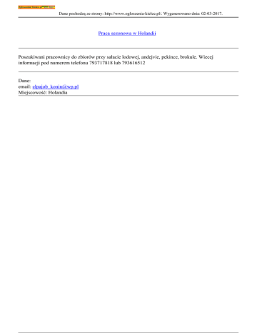 Dane pochodzą ze strony: http://www.ogloszenia-kielce.pl/. Wygenerowano dnia: 02-03-2017. Praca sezonowa w Holandii Poszukiwani pracownicy do zbiorów przy sałacie lodowej, andejvie, pekince, brokule. Wiecej informacji pod numerem telefonu 793717818 lub 793616512 Dane: email: [email protected] Miejscowość: Holandia
