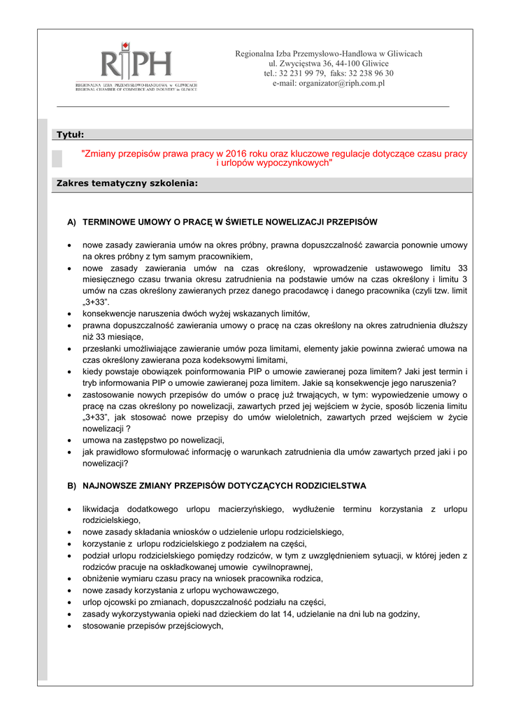 Regionalna Izba Przemysłowo-Handlowa w Gliwicach ul. Zwycięstwa 36, 44-100 Gliwice tel.: 32 231 99 79, faks: 32 238 96 30 e-mail: [email protected] Tytuł: "Zmiany przepisów prawa pracy w 2016 roku oraz kluczowe regulacje dotyczące czasu pracy i urlopów wypoczynkowych" Zakres tematyczny szkolenia: A) TERMINOWE UMOWY O PRACĘ W ŚWIETLE NOWELIZACJI PRZEPISÓW nowe zasady zawierania umów na okres próbny, prawna dopuszczalność zawarcia ponownie umowy na okres próbny z tym samym pracownikiem, nowe zasady zawierania umów na czas określony, wprowadzenie ustawowego limitu 33 miesięcznego czasu trwania okresu zatrudnienia na podstawie umów na czas określony i limitu 3 umów na czas określony zawieranych przez danego pracodawcę i danego pracownika (czyli tzw. limit „3+33”. konsekwencje naruszenia dwóch wyżej wskazanych limitów, prawna dopuszczalność zawierania umowy o pracę na czas określony na okres zatrudnienia dłuższy niż 33 miesiące, przesłanki umożliwiające zawieranie umów poza limitami, elementy jakie powinna zwierać umowa na czas określony zawierana poza kodeksowymi limitami, kiedy powstaje obowiązek poinformowania PIP o umowie zawieranej poza limitem? Jaki jest termin i tryb informowania PIP o umowie zawieranej poza limitem. Jakie są konsekwencje jego naruszenia? zastosowanie nowych przepisów do umów o pracę już trwających, w tym: wypowiedzenie umowy o pracę na czas określony po nowelizacji, zawartych przed jej wejściem w życie, sposób liczenia limitu „3+33”, jak stosować nowe przepisy do umów wieloletnich, zawartych przed wejściem w życie nowelizacji ? umowa na zastępstwo po nowelizacji, jak prawidłowo sformułować informację o warunkach zatrudnienia dla umów zawartych przed jaki i po nowelizacji? B) NAJNOWSZE ZMIANY PRZEPISÓW DOTYCZĄCYCH RODZICIELSTWA likwidacja dodatkowego urlopu macierzyńskiego, wydłużenie terminu korzystania z urlopu rodzicielskiego, nowe zasady składania wniosków o udzielenie urlopu rodzicielskiego, korzystanie z urlopu rodzicielskiego z podziałem na części, podział urlopu rodzicielskiego pomiędzy rodziców, w tym z uwzględnieniem sytuacji, w której jeden z rodziców pracuje na oskładkowanej umowie cywilnoprawnej, obniżenie wymiaru czasu pracy na wniosek pracownika rodzica, nowe zasady korzystania z urlopu wychowawczego, urlop ojcowski po zmianach, dopuszczalność podziału na części, zasady wykorzystywania opieki nad dzieckiem do lat 14, udzielanie na dni lub na godziny, stosowanie przepisów przejściowych, Regionalna Izba Przemysłowo-Handlowa w Gliwicach ul. Zwycięstwa 36, 44-100 Gliwice tel.: 32 231 99 79, faks: 32 238 96 30 e-mail: [email protected] C) URLOPY WYPOCZYNKOWE „W PIGUŁCE” - NAJWAŻNIEJSZE WYBRANE ZAGADNIENIA PRAKTYCZNE ustalanie wymiaru przysługującego urlopu wypoczynkowego, prawo do pierwszego urlopu, planowanie i ustalanie terminu udzielenia urlopu, obligatoryjne i fakultatywne zmiany terminu udzielenia urlopu wypoczynkowego, przerwanie biegu urlopu wypoczynkowego i odwołanie pracownika z urlopu, zasada 14 dni odpoczynku, zasady rozliczania urlopu w zależności od stosowanego systemu czasu pracy, urlop na żądanie i jego specyfika, zmiana „etatu” a przysługujący wymiar urlopu, urlopy „niepełnoetatowców”, wpływ dostarczenia przez pracownika „zaległego” świadectwa pracy na wymiar przysługującego pracownikowi urlopu wypoczynkowego, przedawnienie roszczenia o udzielenie urlopu wypoczynkowego i zapłatę ekwiwalentu, D) KLUCZOWE REGULACJE DOTYCZĄCE CZASU PRACY – PRAWIDŁOWE PLANOWANIE I ROZLICZANIE CZASU PRACY definicja czasu pracy, okresy, w których pracownik nie świadczy pracy, zaliczane do czasu pracy, profilaktyczne badania lekarskie a czas pracy, wymiar czasu pracy i jego obliczanie, podstawowy i równoważny system czasu pracy, zadaniowy system czasu pracy definicja doby pracowniczej i problem jej naruszenia, prawidłowe wprowadzenie i stosowanie przepisów pozwalających na zatrudnienie dwukrotnie w tej samej dobie pracowniczej czyli tzw. ruchomy czas pracy, konsekwencje zasady przeciętnie 5 dniowego tygodnia pracy, czyli praca w tzw. szóstym dniu tygodnia, przepisy o nieprzerwanej dobowym i tygodniowym odpoczynku, dopuszczalność ich naruszenia, rekompensowanie odpoczynków w wyjaśnieniach MPIPS oraz PIP. prawidłowe tworzenie harmonogramów (grafików) czasu pracy z uwzględnieniem ww. zagadnień, najczęściej występujące nieprawidłowości praca w niedzielę i święta, praca w godzinach nadliczbowych i jej rekompensata ,limit godzin nadliczbowych, zatrudnienie w niepełnym wymiarze czasu pracy, termin wypłaty wynagrodzenia i dodatków za dobowe i przeciętnie tygodniowe godziny nadliczbowe w świetle wyjaśnień Departamentu Prawnego Państwowej Inspekcji Pracy, grupy pracowników objęte zakazem pracy w godzinach nadliczbowych, problematyka pracy świadczonej w godzinach nadliczbowych przez „kadrę kierowniczą”, czas pracy pracowników niepełnosprawnych, czas szkoleń poza „zwykłymi” godzinami pracy a czas pracy. Regionalna Izba Przemysłowo-Handlowa w Gliwicach ul. Zwycięstwa 36, 44-100 Gliwice tel.: 32 231 99 79, faks: 32 238 96 30 e-mail: [email protected]