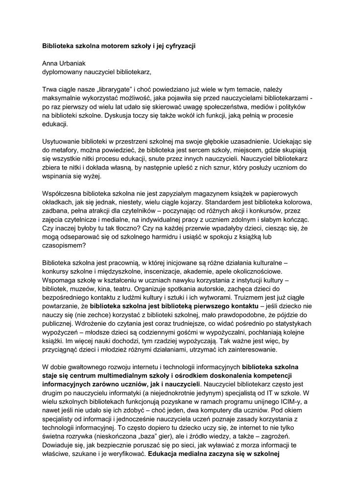 Biblioteka szkolna motorem szkoły i jej cyfryzacji Anna Urbaniak dyplomowany nauczyciel bibliotekarz, Trwa ciągle nasze „librarygate” i choć powiedziano już wiele w tym temacie, należy maksymalnie wykorzystać możliwość, jaka pojawiła się przed nauczycielami bibliotekarzami po raz pierwszy od wielu lat udało się skierować uwagę społeczeństwa, mediów i polityków na biblioteki szkolne. Dyskusja toczy się także wokół ich funkcji, jaką pełnią w procesie edukacji. Usytuowanie biblioteki w przestrzeni szkolnej ma swoje głębokie uzasadnienie. Uciekając się do metafory, można powiedzieć, że biblioteka jest sercem szkoły, miejscem, gdzie skupiają się wszystkie nitki procesu edukacji, snute przez innych nauczycieli. Nauczyciel bibliotekarz zbiera te nitki i dokłada własną, by następnie upleść z nich sznur, który posłuży uczniom do wspinania się wyżej. Współczesna biblioteka szkolna nie jest zapyziałym magazynem książek w papierowych okładkach, jak się jednak, niestety, wielu ciągle kojarzy. Standardem jest biblioteka kolorowa, zadbana, pełna atrakcji dla czytelników – poczynając od różnych akcji i konkursów, przez zajęcia czytelnicze i medialne, na indywidualnej pracy z uczniem zdolnym i słabym kończąc. Czy inaczej byłoby tu tak tłoczno? Czy na każdej przerwie wpadałyby dzieci, ciesząc się, że mogą odseparować się od szkolnego harmidru i usiąść w spokoju z książką lub czasopismem? Biblioteka szkolna jest pracownią, w której inicjowane są różne działania kulturalne – konkursy szkolne i międzyszkolne, inscenizacje, akademie, apele okolicznościowe. Wspomaga szkołę w kształceniu w uczniach nawyku korzystania z instytucji kultury – bibliotek, muzeów, kina, teatru. Organizuje spotkania autorskie, zachęca dzieci do bezpośredniego kontaktu z ludźmi kultury i sztuki i ich wytworami. Truizmem jest już ciągłe powtarzanie, że biblioteka szkolna jest biblioteką pierwszego kontaktu – jeśli dziecko nie nauczy się (nie zechce) korzystać z biblioteki szkolnej, mało prawdopodobne, że pójdzie do publicznej. Wdrożenie do czytania jest coraz trudniejsze, co widać pośrednio po statystykach wypożyczeń – młodsze dzieci są codziennymi gośćmi w wypożyczalni, pochłaniają kolejne książki. Im więcej nauki dochodzi, tym rzadziej wypożyczają. Tak ważne jest więc, by przyciągnąć dzieci i młodzież różnymi działaniami, utrzymać ich zainteresowanie. W dobie gwałtownego rozwoju internetu i technologii informacyjnych biblioteka szkolna staje się centrum multimedialnym szkoły i ośrodkiem doskonalenia kompetencji informacyjnych zarówno uczniów, jak i nauczycieli. Nauczyciel bibliotekarz często jest drugim po nauczycielu informatyki (a niejednokrotnie jedynym) specjalistą od IT w szkole. W wielu szkolnych bibliotekach funkcjonują pozyskane w ramach programu unijnego ICIM-y, a nawet jeśli nie udało się ich zdobyć – choć jeden, dwa komputery dla uczniów. Pod okiem specjalisty od informacji i jednocześnie nauczyciela uczeń poznaje zasady korzystania z technologii informacyjnej. To często dopiero tu dziecko uczy się, że internet to nie tylko świetna rozrywka (nieskończona „baza” gier), ale i źródło wiedzy, a także – zagrożeń. Dowiaduje się, jak bezpiecznie poruszać się po sieci, jak wyławiać z morza informacji te właściwe, szukane i je weryfikować. Edukacja medialna zaczyna się w szkolnej bibliotece. Informacja jest obecnie najcenniejszym i najbardziej poszukiwanym „produktem”, i to właśnie bibliotekarz wskazuje, jak ją znaleźć, wyselekcjonować i wykorzystać ku własnemu pożytkowi. Ogromną rolę spełnia biblioteka szkolna w procesie cyfryzacji polskiej oświaty. Często to bibliotekarze inicjują udział szkół w projektach związanych z TI, wspierają nauczycieli w poszukiwaniu i wykorzystywaniu narzędzi do tworzenia multimedialnych pomocy dydaktycznych. To w bibliotece pojawił się pierwszy komputer w szkole poza sekretariatem – elektroniczne kartoteki i bazy książek niezmiernie ułatwiły proces dydaktyczny. Nauczyciele bibliotekarze zakładają i prowadzą strony internetowe szkół i bibliotek, inicjują wprowadzanie innowacji, działania związane z różnymi projektami, zarówno lokalnymi, jak i o zasięgu krajowym czy międzynarodowym (np. e-Twinning). Biblioteka szkolna jest idealnym „miejscem” na tworzenie i administrację szkolnej platformy edukacyjnej (np. Moodle), która posłuży zarówno uczniom (materiały do lekcji przedmiotowych, zajęć pozalekcyjnych, miejsce do realizacji różnych projektów itd.), jak i nauczycielom (WDN, samodoskonalenie). Pokuszę się nawet o stwierdzenie, że taka platforma to świetna przestrzeń do działań ukierunkowanych na środowisko lokalne i ponadlokalne. Badania amerykańskie1 wskazały na dwa razy bardziej efektywną naukę w formie blended learning niż podczas tradycyjnego nauczania i coraz więcej szkół kieruje swoją uwagę w tym kierunku. Wszystkie działania, podejmowane przez nauczycieli bibliotekarzy, są ściśle powiązane z ich osobowością i nastawieniem do pracy. Standardem, nie wyjątkiem, jest bibliotekarz zaangażowany w całym tego słowa znaczeniu – zaangażowany w proces edukacji, w poznawanie dziecięcego świata i rozwijanie wyobraźni młodego pokolenia. Zaangażowany w pozyskiwanie sponsorów na nowy sprzęt, książki i inne materiały. Nierzadko własnym kosztem – czasu, zdrowia, finansów. Najbliższy czas pokaże czy i komu zależy na rozwoju bibliotek szkolnych i polepszeniu ich sytuacji. Czy marzeniem ściętej głowy jest roić sobie o nowych komputerach, stałym (może czterocyfrowym...?) budżecie na zakup nowości, remoncie pomieszczeń – ba, dużych, jasnych salach? Doprawdy, na cud zakrawa fakt, że nauczyciele bibliotekarze, gniotący się często w warunkach urągających wszelkiej logice i przyzwoitości (znam bibliotekę, kt
