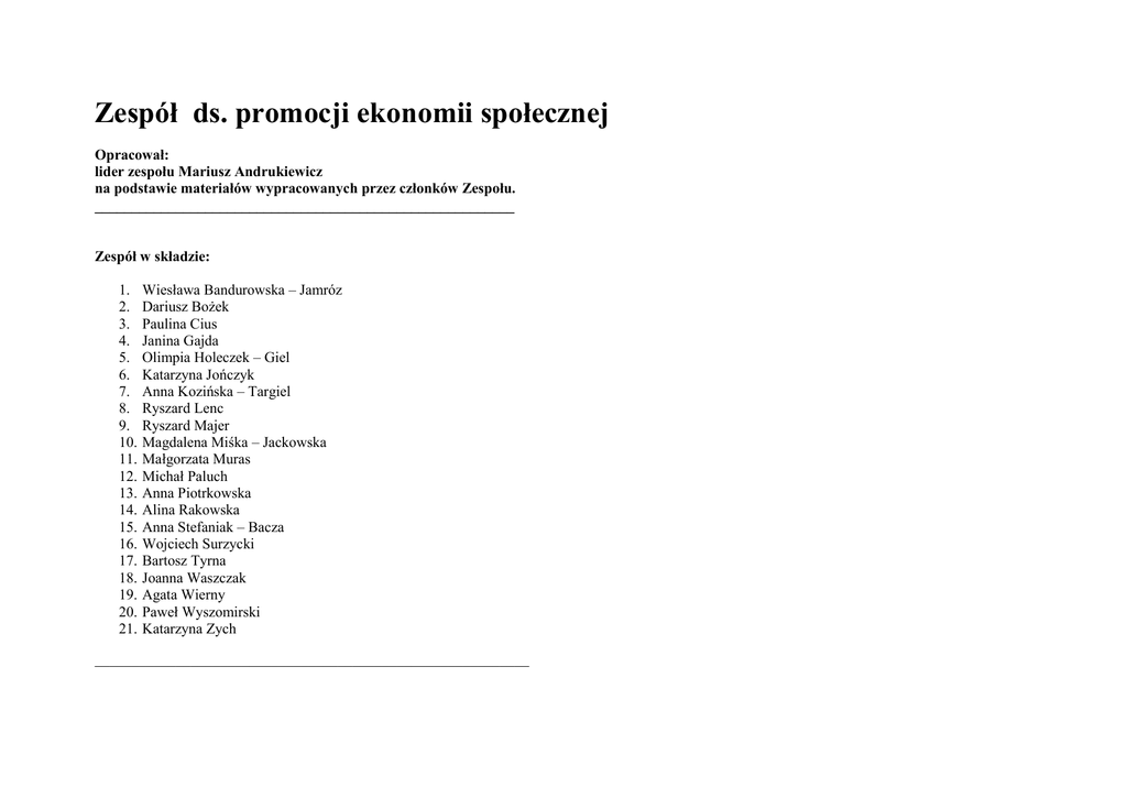 Zespół ds. promocji ekonomii społecznej Opracował: lider zespołu Mariusz Andrukiewicz na podstawie materiałów wypracowanych przez członków Zespołu. _________________________________________________________ Zespół w składzie: 1. 2. 3. 4. 5. 6. 7. 8. 9. 10. 11. 12. 13. 14. 15. 16. 17. 18. 19. 20. 21. Wiesława Bandurowska – Jamróz Dariusz Bożek Paulina Cius Janina Gajda Olimpia Holeczek – Giel Katarzyna Jończyk Anna Kozińska – Targiel Ryszard Lenc Ryszard Majer Magdalena Miśka – Jackowska Małgorzata Muras Michał Paluch Anna Piotrkowska Alina Rakowska Anna Stefaniak – Bacza Wojciech Surzycki Bartosz Tyrna Joanna Waszczak Agata Wierny Paweł Wyszomirski Katarzyna Zych ___________________________________________________________ Promocja ekonomii społecznej w województwie śląskim powinna zmierzać w kilku kierunkach: 1. Promocji podmiotów ekonomii społecznej niezależnie od ich formy organizacyjno – prawnej; 2. Promocji produktów i usług świadczonych przez podmioty ekonomii społecznej; 3. Promocji idei, metod i narzędzi ekonomii społecznej jako niezbędnych elementów lokalnej polityki społeczno - gospodarczej; 4. Promocji systemu wsparcia sektora ekonomii społecznej; Analiza SWOT MOCNE STRONY SŁABE STRONY 1. Doświadczenie wynikające z przeprowadzonych w województwie śląskim kampanii (Promes i Śląski Promes); 1. Niski poziom wiedzy społeczeństwa oraz różnych instytucji na temat możliwości jakie niesie sektor ekonomii społecznej; 2. Entuzjazm i zaangażowanie osób związanych z sektorem ekonomii społecznej; 2. Mała rozpoznawalność haseł branżowych związanych z ekonomią społeczną (język niedostosowany do większości społeczeństwa); 3. Dobre przykłady - kilka wiodących podmiotów ekonomii społecznej w regionie; 3. Ograniczony dostęp do informacji o podmiotach ekonomii społecznej; 4. Pozytywny stosunek mediów regionalnych do ES; 4. Brak pozytywnie nacechowanego wyobrażenia o produktach ES w świadomości potencjalnych odbiorców; 5. Koordynacja działań w zakresie promocji w ramach jednego ośrodka – ROPS; 6. Wsparcie polityczne programu promocji ES przez Śląski Urząd Marszałkowski; 7. Kształtowana stopniowo sieć OWES na terenie województwa oraz organizacji infrastrukturalnych; 8. Doświadczenie liderów przedsiębiorstw społecznych w zakresie promocji; 9. Funkcjonowanie w regionie ośrodka kształcenia trenerów przedsiębiorczości społecznej i systemów jakości trzeciego sektora o 6. Stereotypowe skojarzenia związane ze spółdzielniami socjalnymi, centrami integracji społecznej itp. 7. Nieznajomość technik marketingowych praktyków ES; 8. Brak środków na zlecanie usług promocyjnych dla PES; 9. Brak doświadczenia PES w promowaniu swoich produktów i usług 10. Brak jednolitej, spójnej strategii promocji ES; 11. Brak centralizacji działań promocyjnych; uznanej pozycji na poziomie ogólnopolskim (Centrum Szkoleń i Rozwoju Osobistego Meritum z Katowic); 10. Pozytywne skojarzenia w społeczeństwie i biznesie z działaniami mającymi charakter prospołeczny, w tym działalności podmiotów ekonomii społecznych; 11. Działania podmiotów społecznych w obszarze odpowiedzialnego biznesu; 12. Korzystny klimat dla swojej działalności kreowany przez podmioty ekonomii społecznej 13. Duży poziom zróżnicowania działalności podmiotów ekonomii społecznej (duża różnorodność); 14. Stosowanie przez wzorcowe podmioty ekonomii społecznej nowych technologii, dizajnu, internetu jako obszaru swojej działalności oraz jako narzędzi promocyjnych; 12. Brak wspólnego systemu identyfikacji wizualnej ES; 13. Trudności w firmowaniu wspólnym logiem ES każdego typu usług; 14. Różna jakość usług – uogólnione opinie rzutujące na sektor ES; 15. Brak wykorzystania nowoczesnych źródeł promocji; 16. Zbyt mało promocji w sieci, mało wykorzystane social media; 17. Brak zapisów dotyczących ekonomii społecznej i jej promocji, w dokumentach kształtujących lokalną politykę społeczną - strategiach rozwiązywania problemów społecznych; 18. Brak odrębnych dokumentów programujących ekonomię społeczną i jej promocję w środowiskach lokalnych; 15. Budowanie partnerstw PES z podmiotami publicznymi oraz prywatnym, które mogą współpracować przy ich promocji; 19. Zbyt zróżnicowany poziom wiedzy o ekonomii społecznej i jej promocji wśród przedstawicieli instytucji pomocy i integracji społecznej (PUP, OPS) oraz decydentów (wójtów, burmistrzów, prezydentów, radnych, urzędników samorządowych); 16. Baza klientów podmiotów ekonomii społecznej - możliwość prezentacji skuteczności PES na rynku; 20. Kojarzenie ekonomii społecznej z pomocą społeczną i szeroko pojętą integracją społeczną; SZANSE ZAGROŻENIA 1.Ujęcie ES i promocji ES w dokumentach strategicznych i programach operacyjnych – możliwość finansowania działań, w tym promocyjnych; 1.Brak świadomości społecznej z korzyści wynikających z rozwoju i promocji podmiotów ES; 2.Dynamiczny rozwój sektora ekonomii społecznej; 3.Rosnąca moda na "podejmowanie świadomych decyzji konsumenckich" co może zaowocować trendem do kupowania produktów i usług podmiotów ekonomii społecznej; 2.Brak centrum decyzyjnego prowadzącego, spójną politykę promocji ES; 3.Brak dobrej koncepcji promocji ES uwzględniającej jedność w różnorodności podmiotów ES; 4.Zainteresowanie firm społeczną odpowiedzialnością biznesu co może powodować większą chęć do współpracy z sektorem ekonomii społecznej poprzez wymianę gospodarczą, współpracę partnerską, wymianę doświadczeń, finansowanie działań PES; 4.Funkcjonujące w społeczeństwie stereotypy dotyczące ES; 5.Widoczna potrzeba Polaków kontaktu z ideami, oddolnymi, prawdziwymi inicjatywami – co za tym idzie szansa na wpisanie się w tą potrzebę poprzez działania promocyjne wskazujące nową, skuteczną i autentyczną metodę rozwi