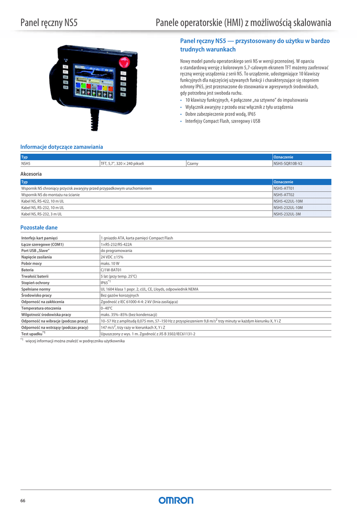 Panel ręczny NS5 Panele operatorskie (HMI) z możliwością skalowania Panel ręczny NS5 — przystosowany do użytku w bardzo trudnych warunkach Nowy model panelu operatorskiego serii NS w wersji przenośnej. W oparciu o standardową wersję z kolorowym 5,7-calowym ekranem TFT możemy zaoferować ręczną wersję urządzenia z serii NS. To urządzenie, udostępniające 10 klawiszy funkcyjnych dla najczęściej używanych funkcji i charakteryzujące się stopniem ochrony IP65, jest przeznaczone do stosowania w agresywnych środowiskach, gdy potrzebna jest swoboda ruchu. • 10 klawiszy funkcyjnych, 4 połączone „na sztywno” do impulsowania • Wyłącznik awaryjny z przodu oraz włącznik z tyłu urządzenia • Dobre zabezpieczenie przed wodą, IP65 • Interfejsy Compact Flash, szeregowy i USB Informacje dotyczące zamawiania Typ NSH5 Oznaczenie TFT, 5,7", 320 × 240 pikseli Czarny NSH5-SQR10B-V2 Akcesoria Typ Oznaczenie Wspornik NS chroniący przycisk awaryjny przed przypadkowym uruchomieniem NSH5-ATT01 Wspornik NS do montażu na ścianie NSH5-ATT02 Kabel NS, RS-422, 10 m UL NSH5-422UL-10M Kabel NS, RS-232, 10 m UL NSH5-232UL-10M Kabel NS, RS-232, 3 m UL NSH5-232UL-3M Pozostałe dane Interfejs kart pamięci 1 gniazdo ATA, karta pamięci Compact Flash Łącze szeregowe (COM1) 1×RS-232/RS-422A Port USB „Slave” do programowania Napięcie zasilania 24 VDC ±15% Pobór mocy maks. 10 W Bateria CJ1W-BAT01 Trwałość baterii 5 lat (przy temp. 25°C) Stopień ochrony IP65*1 Spełniane normy UL 1604 klasa 1 popr. 2, cUL, CE, Lloyds, odpowiednik NEMA Środowisko pracy Bez gazów korozyjnych Odporność na zakłócenia Zgodność z IEC 61000-4-4: 2 kV (linia zasilająca) Temperatura otoczenia 0–40°C Wilgotność środowiska pracy maks. 35%–85% (bez kondensacji) Odporność na wibracje (podczas pracy) 10–57 Hz z amplitudą 0,075 mm, 57–150 Hz z przyspieszeniem 9,8 m/s2 trzy minuty w każdym kierunku X, Y i Z Odporność na wstrząsy (podczas pracy) 147 m/s2, trzy razy w kierunkach X, Y i Z Test upadku*1 Upuszczony z wys. 1 m. Zgodność z JIS B 3502/IEC61131-2 *1 66 więcej informacji można znaleźć w podręczniku użytkownika Akcesoria NS Zintegrowany sterownik/skalowalny interfejs HMI Typ Opis Oznaczenie Kabel Kabel szeregowy do programowania XW2Z-S002 Kabel USB do programowania, 2 m Panele operatorskie (HMI) Informacje dotyczące zamawiania CP1W-CN221 Łączenie PT ze sterownikiem PLC Kabel łączący z PC Połączenie PT: 9 styków Połączenie PLC: 9 styków Długość 2 m XW2Z-200T Długość 5 m XW2Z-500T Akcesoria Wejście wideo Wejścia: 4 kanały NTSC/PAL NS-CA001 Wejścia: 2 kanały NTSC/PAL, 1 kanał RGB NS-CA002 Kabel do łączenia NS-CA00_ z konsolą wideo F150-VKP (2 m) F150-VKP (5 m) Moduł komunikacyjny Controller Link NS-CLK21 Adapter RS-422A/485 (50 m) CJ1W-CIF11 Adapter RS-422A (500 m) Powłoki antyrefleksyjne (5 powłok) Antyrefleksyjne powłoki ochronne (5 w pakiecie) Przezroczyste powłoki ochronne (5 w pakiecie) NS-AL002 NS15 NS15-KBA04 NS12/10 NS12-KBA04 NS8 NS7-KBA04 NS5 NT30-KBA04 NS12/10 NS12-KBA05 NS8 NS7-KBA05 NS5 NT31C-KBA05 NS15 (1 powłoka) NS15-KBA05N NS12/10 NS12-KBA05N NS8 NS7-KBA05N NS5 NT31C-KBA05N Powłoka odporna na substancje chemiczne (1 powłoka) NS5 NT30-KBA01 Adapter wyposażenia dodatkowego (Seria NT625C/631/631C do serii NS12) NS12-ATT01 (Seria NT625C/631/631C do serii NS12); czarny NS12-ATT01B (Seria NT620S/620C/600S do serii NS8) NS8-ATT01 (Seria NT600M/600G/610G/612G do serii NS8) NS8-ATT02 128 MB HMC-EF183 256 MB HMC-EF283 512 MB HMC-EF583 Karta pamięci Adapter kart pamięci do komputera PC HMC-AP001 Bateria CJ1W-BAT01 67