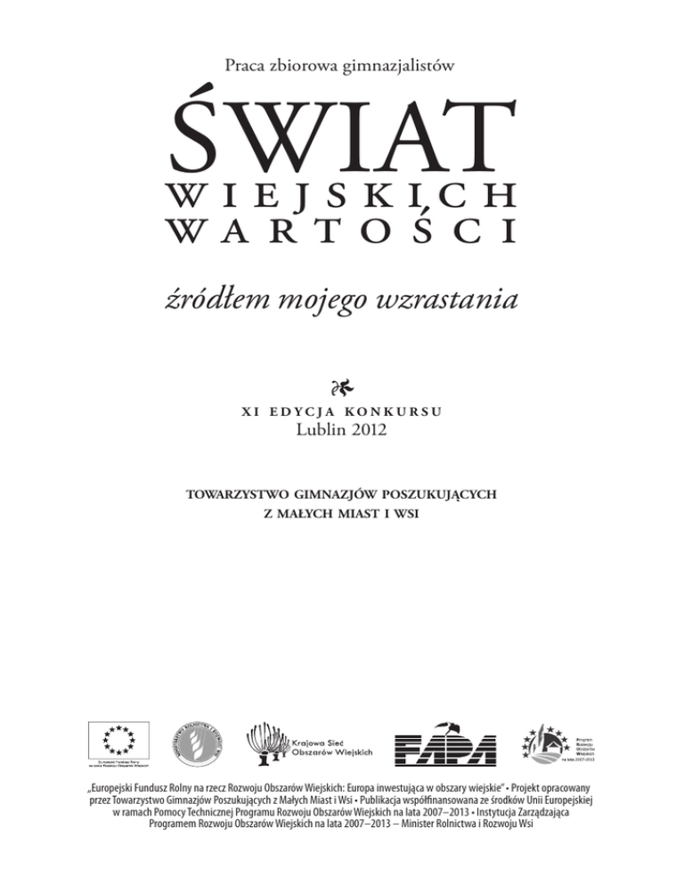 Praca zbiorowa gimnazjalistów świat wiejskich wartości źródłem mojego wzrastania 1 xi edycja konkursu Lublin 2012 towarzystwo gimnazjów poszukujących z małych miast i wsi 1 „Europejski Fundusz Rolny na rzecz Rozwoju Obszarów Wiejskich: Europa inwestująca w obszary wiejskie” • Projekt opracowany przez Towarzystwo Gimnazjów Poszukujących z Małych Miast i Wsi • Publikacja współfinansowana ze środków Unii Europejskiej w ramach Pomocy Technicznej Programu Rozwoju Obszarów Wiejskich na lata 2007–2013 • Instytucja Zarządzająca Programem Rozwoju Obszarów Wiejskich na lata 2007–2013 – Minister Rolnictwa i Rozwoju Wsi opiekun naukowy Towarzystwa Gimnazjów Poszukujących z Małych Miast i Wsi adres do korespondencji prof. zw. dr hab. Krystyna Chałas ul. Różana 21/11 20–538 Lublin korekta Mirosława Baczkowska‑Milian skład studioformat.pl isbn 978-83-62495-15-3 wydawnictwo Episteme 20-021 Lublin ul. Solna 4/9 (+48) 669924164 2 Spis treści Wprowadzenie . . . . . . . . . . . . . . 5 Michał Gasz Moi pierwsi i najlepsi nauczyciele . . . . . . . . . . 7 Katarzyna Snażyk Mam szczęście, że urodziłam się w Sułowie . . . . . . . 11 Nicole Zuzanna Reike Wieś – drogowskazem życia . . . . . . . . . . . 15 Maria Lengiewicz Moja wieś źródłem wiedzy, umiejętności i wielu doświadczeń . 19 Patryk Załęcki Moje życie na wsi . . . . . . . . . . Dawid Klimkiewicz Wiejska natura moim kręgosłupem moralnym . . . . . . . . 23 . . 25 Sylwia Ściepuk Wieś to przyjaciel mojej duszy i serca . . . . . . . . 29 Małgorzata Wolska Wieś – bogactwem tradycji . . . . . . . . . . . 33 Barbara Skrzypko Jestem dumna z moich korzeni . . . . . . . . . . 37 Monika Siwicka Żyję na wsi, nie czuję się gorsza . . . . . . . . . . 41 Zuzanna Cholewa To tu jest mój wielki świat, moje życie . . . . . . . . 45 Magdalena Koczwara Ojczyzna moich dziadków – moją ojczyzną . . . . . . 57 Aleksandra Przybylska Moje korzenie . . . . . . . . . . . . . . . 77 3 Angelika Stawska Mój mały zakątek . . . . . . . . . . . . . . 79 Karolina Ujma Moje „ja” . . . . . . . . . . . . . . . . 81 Karolina Gołębiewska Moje drugie życie . . . . Paulina Żółtańska *** (Tu, gdzie serce moje) . . . . . . . . . . . . . . . . . . . . 83 . . 91 Dominika Danilczuk Moje kochane wiejskie wartości . . . . . . . . . . 93 Julita Kluczyk Wieś moją przystanią . . . . . . . . . . 95 . . . Justyna Butwicka Rodzina wielopokoleniowa wielką wartością . . . . . . 99 Marta Strumińska Czy ze wsi to znaczy, że gorsi? . . . . . . . . . . 101 Katarzyna Dąbrowska Wieś moim światem wartości . . 103 Marta Olesek Wieś – cały mój świat . . . . . . . . . . . . 107 Agata Rajkiewicz Mój wiejski, cudowny świat . . . . . . . . . . . . . . . . . . . 109 Monika Rzepka Tu jest moje miejsce, tu jest mój dom . . . . . . . . 111 Damian Zmyślony Moja wieś – moje miejsce na Ziemi . . . . . . . . . 113 Wioletta Thomys Wartości wiejskie drogą do dojrzałego życia . . . . . . 115 Izabela Weihs Jest takie miejsce, do którego zawsze chętnie wracam . 4 . . . 117 Wprowadzenie Oddając do rąk czytelników kolejny tomik prac uczniowskich pisa‑ nych umysłem i sercem naszych gimnazjalistów, pragniemy zwrócić uwagę na znaczenie kultury urodzenia na rozwój młodego człowieka. Stoimy bowiem na stanowisku, że »trudna uroda« wsi – miejsca zamieszkania – jest skarbnicą wartości, które kształtują wrażliwość na piękno świata i człowieka; są źródłem wiedzy, postaw i zachowań; źródłem rodzącego się projektu życia budowanego na mocnych ko‑ rzeniach tradycyjnej kultury; źródłem ambicji, pracy nad sobą, od‑ wagi w podejmowaniu coraz trudniejszych zadań; źródłem mądrości. Dokonując analizy prac uczniowskich można odkryć kilka pra‑ widłowości. Pierwsza dotyczy integracji – na bazie kultury wsi – wiedzy o wartościach i wiedzy o człowieku. Ta integracja warun‑ kuje holistyczne ujmowanie rzeczywistości zewnętrznej i siebie w tej rzeczywistości, jako jej kreatora w aspekcie aksjologicznym. Osobę zorientowaną na pełnię własnego rozwoju, człowieka odpo‑ wiedzialnego za siebie, za drugiego, za budowanie rzeczywistości społeczno‑kulturowej. Młodzież postrzega wartości, ceni je, szanuje, urzeczywistnia na miarę swojego rozwoju, pragnie w przyszłości urzeczywistniać, stając się przez to bardziej Kimś. Druga prawidłowość dotyczy rodzącej się mądrości na bazie trudu i piękna wpisanych w »wiejski świat«. Z drugiej zaś strony rodząca się mądrość scala wiele przymiotów umysłu i charakteru, sterując nimi i rozwijając je. Warto w tym miejscu zacytować okre‑ ślenie mądrości przez W. Kojsa: „Mądrość w ujęciu czynnościowym, a więc konkretnym i realnym jest złożoną dyspozycją psychiczną, złożonym systemem poznawczym, emocjonalnym i wolicjonalnym, umożliwiającym jednostce dokonanie rozpoznania, oceny i kwa‑ lifikacji napotykanych problemów, określenie bliższego i dalszego ich kontekstu, wskazanie możliwych rozwiązań i ich konsekwencji oraz wybór działań umożliwiających ich optymalne rozwiązanie. Jako dyspozycja umysłu jest osadzona w emocjach siecią metain‑ formacyjnych działań, odnoszącą się do pojedynczych problemów 5 i do klasy problemów, stanowiącą globalną podstawę o charakterze światopoglądu. Tak postrzegana jest dynamiczną, psychiczną całością, obejmu‑ jącą szereg działań umysłowych, określających początkowy, prze‑ kształcany i końcowy stan wyodrębnionych, problematycznych fragmentów rzeczywistości. Jest wartością chroniącą i współtworzącą inne wartości, szcze‑ gólnie zaś powołaną, rozwijaną i kształtowaną dla ochrony życia, jego społecznych i kulturowych walorów; wartością osobotwórczą, socjotwórczą i kulturotwórczą, tworzącą i nadającą sensy rzeczywi‑ stości, ukierunkowującą jej przekształcanie i p