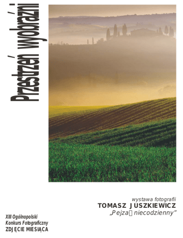Przestrzeń wyobraźni wystawa fotografii XIII Ogólnopolski Konkurs Fotograficzny ZDJĘCIE MIESIĄCA TOMASZ JUSZKIEWICZ „Pejzaż niecodzienny” przestrzeń wyobraźni Głównym elementem konkursu są comiesięczne internetowe spotkania, w trakcie których na stronie internetowej www.fotoplastykon.com.pl umieszczane są nadesłane prace, a znani fotograficy oceniają nadesłane fotografie. Autorzy, uczestnicy tych wirtualnych spotkań, mają możliwość sukcesywnego podnoszenia swoich umiejętności oraz konsultacji z prowadzącymi fotografikami. Najlepsze zdjęcia z tych comiesięcznych spotkań są raz w roku poddane ocenie profesjonalnego Jury i zaprezentowane mieszkańcom województwa w formie finałowej wystawy. Ślady barw Zarówno zmysł realistycznej obserwacji i upodobanie do form epickich, jak związki fotografowania z tradycją artystycznej dydaktyki składają się na liryczno-naturalistyczną wymowę prezentowanych obrazów. Warto zastanowić się o ile ów pozornie „wierny” obraz jest w istocie filmem pamięci, protokołem zaobserwowanych wydarzeń, a o ile „opis” ów jest pewnym zabiegiem konstrukcyjnym fotografów, mającym na celu nadanie „utworowi” charakteru całości o określonej wymowie ideowej i artystycznej. Schodząc w zawiłe meandry życia fotograficy potrafią przeciwstawić świat wyobraźni i świat słów w budzący nasz podziw i wdzięczność świat obrazów. Ich dodatkowym atutem jest to, że niechętnie kaleczą piękny krajobraz fotografii „własnymi słowami”. Różnorodne kompozycje, studia krajobrazowe, psychologiczne portrety osób, artystycznie wierne zmiennej naturze, uderzające prawdą, krytyczne realizmem przenika jednocześnie delikatna nuta poezji i umiłowania piękna różnie dostrzeganego. „Każdy mur jest drzwiami”, mówi Emerson. Patrząc na te fotografie, „ten mur”, możemy dostrzec drzwi do naszych serc gdzie odkrywamy poszukiwane ciągle w świecie piękno. Leszek Lesiczka konkurs fotograficzny zdjęcie miesiąca TOMASZ JUSZKIEWICZ „Geometria natury 1” I Nagroda i Złoty Medal TOMASZ JUSZKIEWICZ „Kolory Toskanii I” I Nagroda i Złoty Medal TOMASZ JUSZKIEWICZ „Kolory Toskanii V” I Nagroda i Złoty Medal TOMASZ JUSZKIEWICZ „Kolory Toskanii XVIII” I Nagroda i Złoty Medal TOMASZ JUSZKIEWICZ „Świat ze snu VII” I Nagroda i Złoty Medal TOMASZ JUSZKIEWICZ „Świat ze snu II” I Nagroda i Złoty Medal TOMASZ JUSZKIEWICZ „Świat snu IV” I Nagroda i Złoty Medal TOMASZ JUSZKIEWICZ „Świat snu III” I Nagroda i Złoty Medal XIII Ogólnopolski Konkurs Fotograficzny PRZESTRZEŃ WYOBRAŹNI PRACE NAGRODZONE I WYRÓŻNIONE EWA SIEROKOSZ „Uliczka” II Nagroda i Srebrny Medal WITOLD KRÓL „Na spacerze” LESZEK SZOSTEK „Architektury czar” Wyróżnienie ANDRZEJ ZIEMKOWSKI „Jakubowa drabina” Wyróżnienie ELŻBIETA WENDA „Carmen” Wyróżnienie JOLANTA LALAK „Ruiny starego młyna” Wyróżnienie NOWOTARSKA REGINA „Makowe pole” Nagroda Specjalna Oficyna MM Wydawnictwo Prawnicze Sp. z o.o. S.K. SŁAWOMIR SIEŁACZ „Rodzinne klimaty II” Wyróżnienie MARCIN MAJKOWSKI „W nieznane” III Nagroda i Brązowy Medal KONRAD ZACHARSKI „Drzewo wiadomości” Wyróżnienie TOMASZ OKONIEWSKI „No nie ma roboty...” Wyróżnienie PAWEŁ MALARCZYK „Bieszczadzcy smolarze” Wyróżnienie przestrzeń wyobraźni Protokół z posiedzenia Jury przyznającego nagrody główne w XIII edycji Ogólnopolskiego Konkursu Fotograficznego „PRZESTRZEŃ WYOBRAŹNI” Jury: przewodniczący członkowie Rafał Jasionowicz - ZPAF Janusz Kostrzewski - AFRP, ZPAF Leszek Lesiczka - Pryzmat, PTT Władysław Nielipiński - ZDFP, WBPiCAK Stanisław Wojcieszak ZAP Antoni Rut - AFRP, ZAP, ZPAF, EkoArt Na konkurs wpłynęły 492 prace 54 autorów. Z zakwalifikowanych do projekcji multimedialnej 200 prac 41 autorów, Jury postanowiło nagrodzić prace następujących autorów: I nagroda - 1000,- zł oraz Złoty Medal Stowarzyszenia Twórców Fotoklub Rzeczypospolitej Polskiej TOMASZ JUSZKIEWICZ z Koszalina za całość prac. II nagroda - 600,- zł oraz Srebrny Medal Stowarzyszenia Twórców Fotoklub Rzeczypospolitej Polskiej EWA SIEROKOSZ z Sandomierza za prace „Inne spojrzenie”, „Uliczka”, „Krople rosy”, „O zachodzie”, „Dziwny sen 1” III nagroda - 400,- zł oraz Brązowy Medal Stowarzyszenia Twórców Fotoklub Rzeczypospolitej Polskiej MARCIN MAJKOWSKI z Krakowa za prace: „Cywilizacyjna pustka”, „Droga ciemności”, „Moje sny” „W nieznane”. Nagroda specjalna drukarka - Oficyna MM Wydawnictwo Prawnicze Sp. z o. o. Sp. K. REGINA NOWOTARSKA ze Szczecina za prace pt.: “Czerwony świat”, „Droga do głębin”, „Makowe pole”. Wyróżnienia ST Fotoklub RP - album „Poznań - kultura na każdą porę” M. Forecki. Jolanta Lalak ze Szczecina za pracę „Ruiny starego młyna”. Sławomir Siełacz z Płotów za pracę „Rodzime klimaty 2”. Paweł Malarczyk z Chorkówki za pracę „Bieszczadzcy smolarze”. Andrzej Ziemkowski z Poznania za pracę „Jakubowa drabina”. Wyróżnienia ZAP - album „Poznań - kultura na każdą porę” M. Forecki. Elżbieta Wenda z Bydgoszczy za pracę „Carmen”. Leszek Szostek ze Zgorzelca za pracę „Architektury czar”. Konrad Zacharski z Wadowic za pracę „Drzewo wiadomości”. Tomasz Okoniewski z Korczyny za pracę „No nie ma roboty…”. Ponadto nagrodzeni otrzymali album do zdjęć Canpol Poznań, dnia 15.07.2013 r. Podpisy Jury. konkurs fotograficzny zdjęcie miesiąca Prace zakwalifikowane do projekcji multimedialnej XIII Ogólnopolskiego Konkursu Fotograficznego „Przestrzeń wyobraźni” Zofia Bernatowicz Poznań „La comparsita”. Paweł Białek Sieraków „III”, „XII”. Joanna Denes Wrocław „Co w szafie piszczy”, „Lekkie pieczywo”, „W deszczu kapeluszy”, „W plenerze”. Elżbieta Dutka Kraków „Anteny”, „Bez pary”, „Halki”, „Wrota”, „Zamknięte w szkle 2”. Martyn
